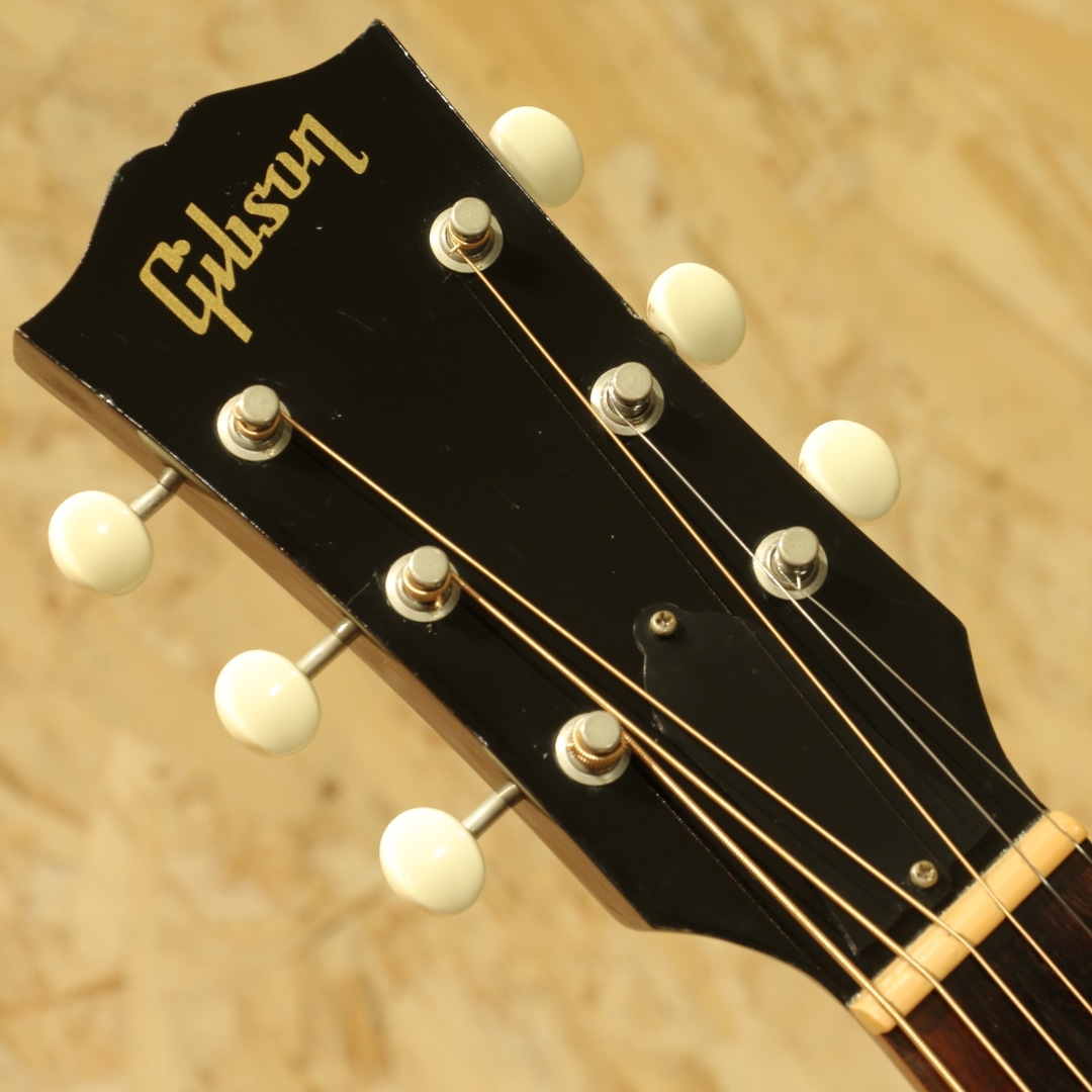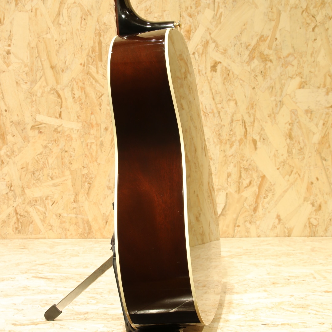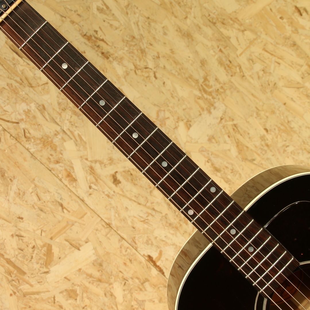 世界中のミュージシャンが愛用するギブソンフラットトップの銘器、"J-45"のスタンダードモデル。本器は当時弊社オーダーにて製造されたカスタムカラーの1本。2001年製のUSED品です。シトカスプルーストップ、マホガニーサイド&バック、マホガニーネック、ローズウッド指板&ブリッジ、クルーソンタイプペグ、MOP指板ドット、べっ甲柄ラージガード、スキャロップド・Xブレイシング、トライバーストフィニッシュ。ワーキングホースの2つ名の通り、ダイナミックなストロークからフィンガープレイまで幅広く応えてくれるオールラウンドな1本。スムーズな運指をフォローする丸みを帯びた指板サイド処理などこだわりのスペック、ダイナミックレンジの広いサウンドメイクなど様々な工夫を凝らした現代仕様の1本です。1942年の発売から80年ほどのあいだ数々のマイナーチェンジがなされましたが、基本的なスタイルは不変です。ブライトで気っ風の良いレスポンス、ドライでどこか泥臭さを感じさせる倍音、外観と違わぬ荒削りなサウンド。やはり歌モノで弾きたくなるギターです。ピックアップにはL.R Baggs Elementを搭載。音の芯を捉えたサウンド、カラッとした音色を響かせてくれるシステムです。コントローラはボリューム1発のシンプルな構成で操作に迷うこともありません。20年余りの時間が経っているだけに細やかな当てキズや擦れキズ、ウェザーチェック等見られますが致命的なものは見られず貫禄の付いている個体。ネック周りの演奏性も良好に整えられており、サドル残りも充分とこれからも活躍してくれるであろうギターです。発表以来、数々の名演を支えてきた"J-45"、移りゆく時代の中でも変わらぬ憧れが今なお此処にあります。