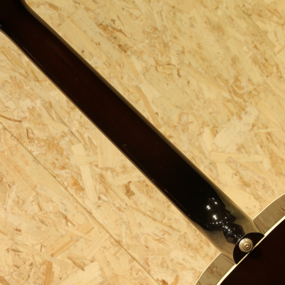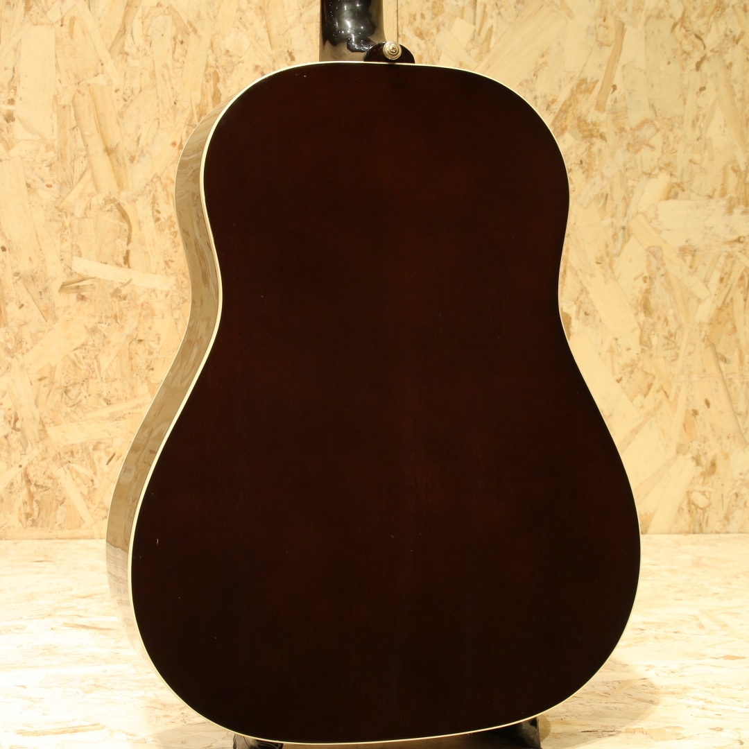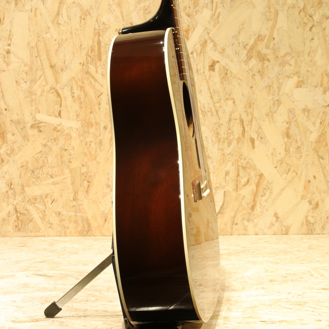 世界中のミュージシャンが愛用するギブソンフラットトップの銘器、"J-45"のスタンダードモデル。本器は当時弊社オーダーにて製造されたカスタムカラーの1本。2001年製のUSED品です。シトカスプルーストップ、マホガニーサイド&バック、マホガニーネック、ローズウッド指板&ブリッジ、クルーソンタイプペグ、MOP指板ドット、べっ甲柄ラージガード、スキャロップド・Xブレイシング、トライバーストフィニッシュ。ワーキングホースの2つ名の通り、ダイナミックなストロークからフィンガープレイまで幅広く応えてくれるオールラウンドな1本。スムーズな運指をフォローする丸みを帯びた指板サイド処理などこだわりのスペック、ダイナミックレンジの広いサウンドメイクなど様々な工夫を凝らした現代仕様の1本です。1942年の発売から80年ほどのあいだ数々のマイナーチェンジがなされましたが、基本的なスタイルは不変です。ブライトで気っ風の良いレスポンス、ドライでどこか泥臭さを感じさせる倍音、外観と違わぬ荒削りなサウンド。やはり歌モノで弾きたくなるギターです。ピックアップにはL.R Baggs Elementを搭載。音の芯を捉えたサウンド、カラッとした音色を響かせてくれるシステムです。コントローラはボリューム1発のシンプルな構成で操作に迷うこともありません。20年余りの時間が経っているだけに細やかな当てキズや擦れキズ、ウェザーチェック等見られますが致命的なものは見られず貫禄の付いている個体。ネック周りの演奏性も良好に整えられており、サドル残りも充分とこれからも活躍してくれるであろうギターです。発表以来、数々の名演を支えてきた"J-45"、移りゆく時代の中でも変わらぬ憧れが今なお此処にあります。
