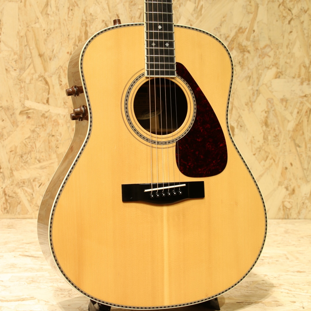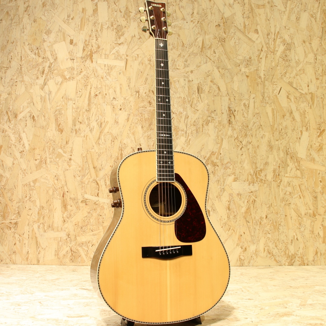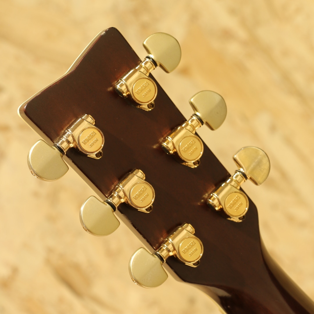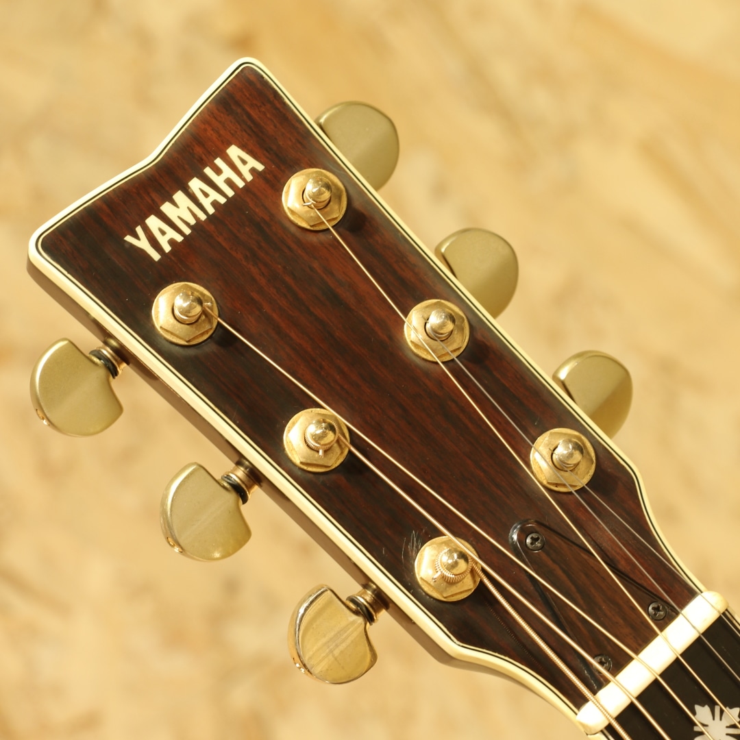 ヤマハLシリーズはLuxuryの名を冠された高級シリーズ。現在でも脈々とLシリーズは受け継がれており、その名に恥じないヤマハ独自の仕様をふんだんに盛り込んだ人気のシリーズです。本器はハカランダサイドバックを採用したピックアップ付きモデルL-15E。1983年製のUSED品です。エゾ松トップ、ハカランダサイド&3Pバック、マホガニーネック、黒々としたエボニー指板&ブリッジ、オリジナルゴールドロトマチックペグ、オリジナル音叉マーク入りロッドカバー、オリジナルウッド指板インレイ、寄木ロゼッタ、ベッコウ柄ピックガード、ノンスキャロップブレイシング、オリジナルピックアップシステム搭載。L-15は1975年に発売開始された人気の単板ドレッドノートモデル。ハカランダを使用したサイドバックと豪華なスペックを与えられたモデルでした。この時期のヤマハの例に漏れず本モデルも前期型と後期型が存在し、大きなところではボディシェイプが変更となりました。L-10のようなウェスタンボディから、四天王L-53と同じジャンボボディへ。それに伴いポジションマークやロッドカバー形状も変化しています。この時期特有のクリアで磨き抜かれたような煌びやかさを持つヤマハサウンド。それだけではなくボリューム感も大きく感じられ、溌溂とした活舌の良さ。日本らしい特有の響きと言えるでしょう。一度かき鳴らせばフォークソングが始まるかのような、情緒あふれるノスタルジーな音色。爪弾けばスリーフィンガーを試したくなるフォーキーなトーンを持ち味とします。現代のモノと比べるとややVシェイプでやや太めに感じるグリップですが、握り込んで演奏するスタイルにはバッチリフィット。まだまだ現役で使えるヤマハギターです。ピックアップシステムには当時のヤマハオリジナルのシステムを搭載。サドル一体型のピックアップで音を拾い、ボディサイドに取り付けられたコントローラーで音色調整。積極的なサウンドの変更もでき、現代においても対応出来そうなシステムです。ペグのくすみや薄い擦りキズこそ見られますが、非常に使用感が少なく良好な1本。演奏性も良いままに保たれ、まだまだ現役の1本です。日本のフォークブームを支えたヤマハトラディショナルモデルの"L-15"、古き良きジャパンフォークがお好きな方には是非、ご体感いただきたい1本です。