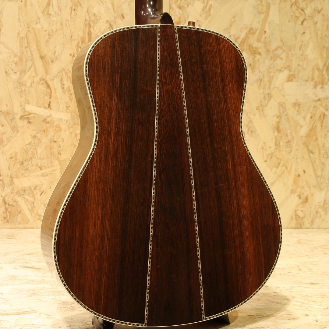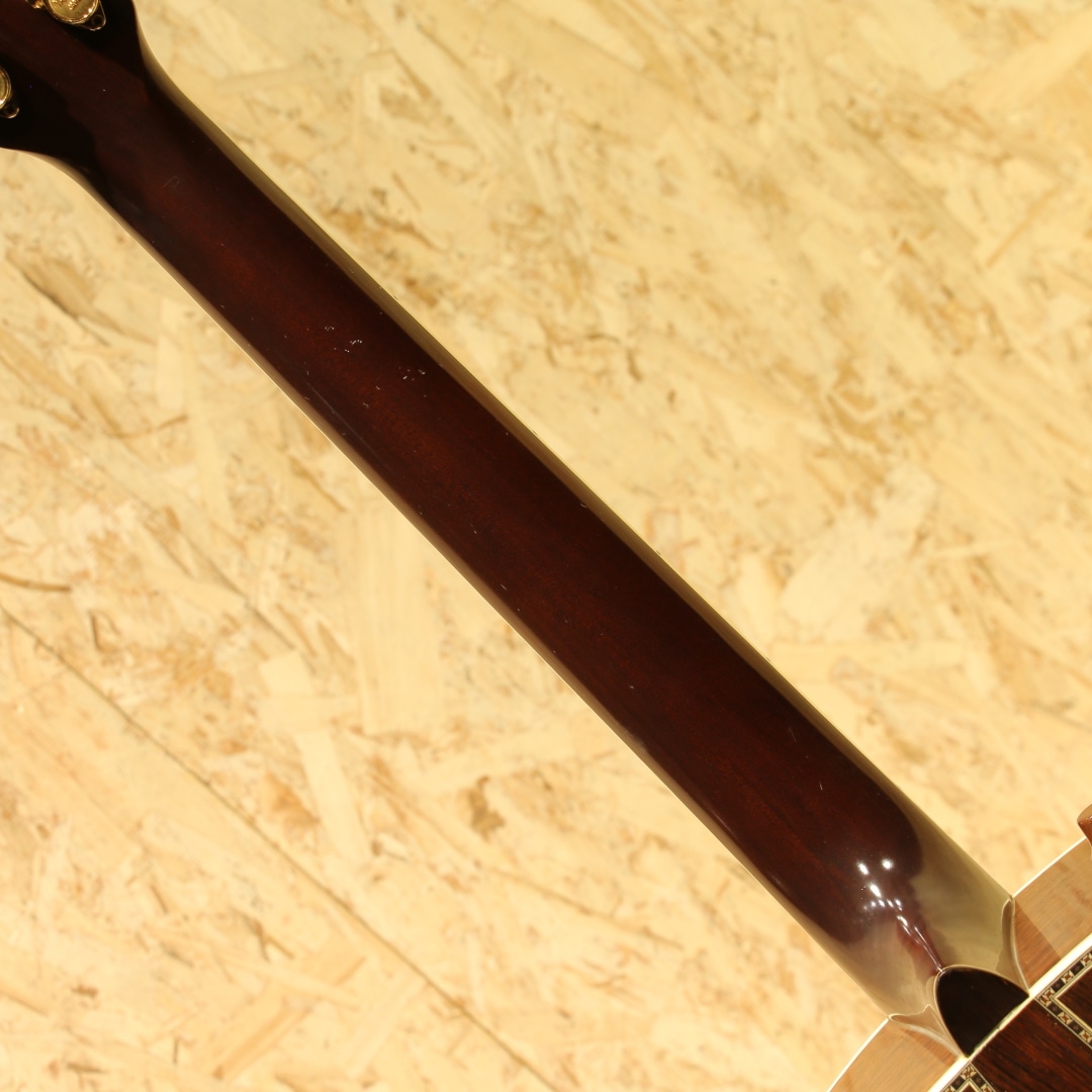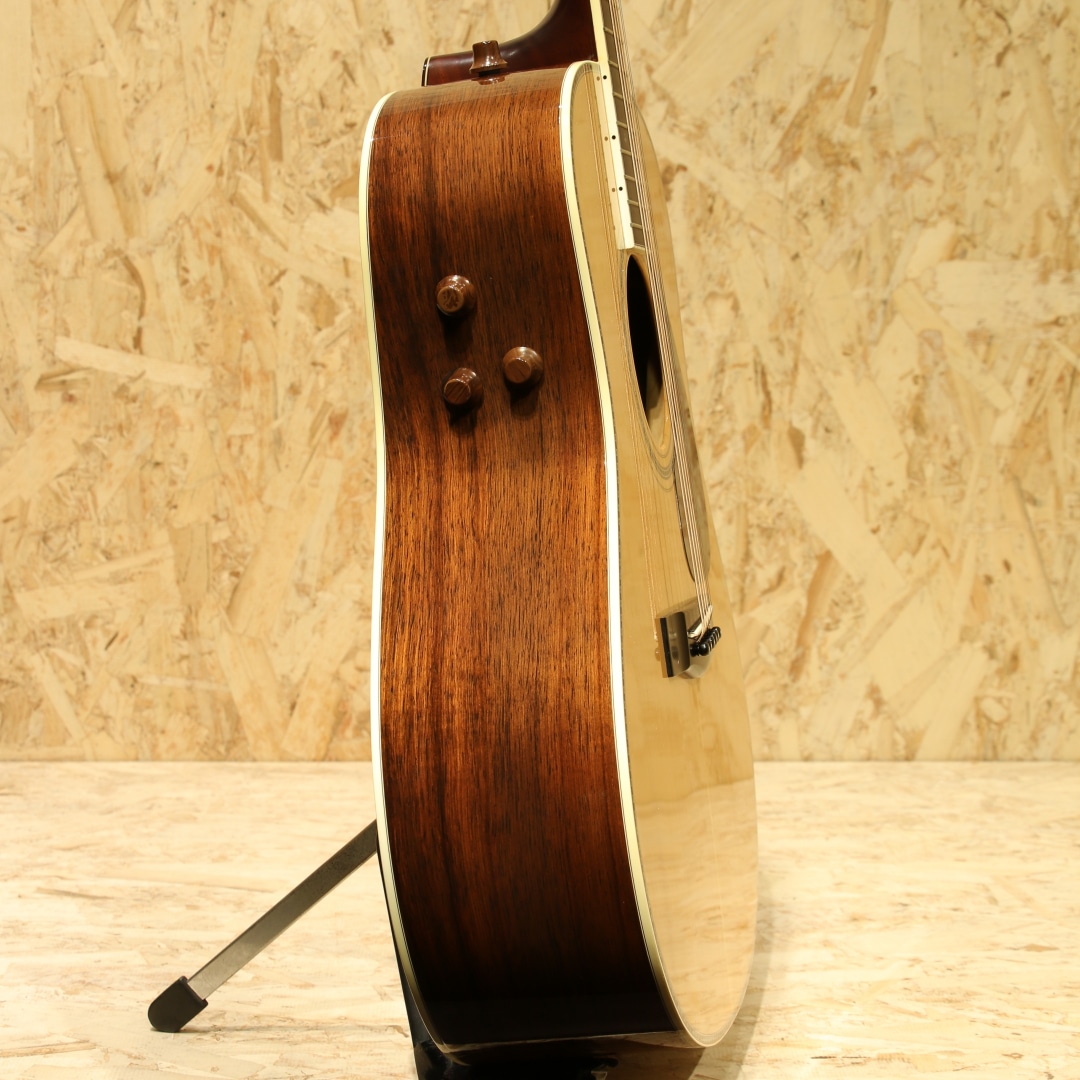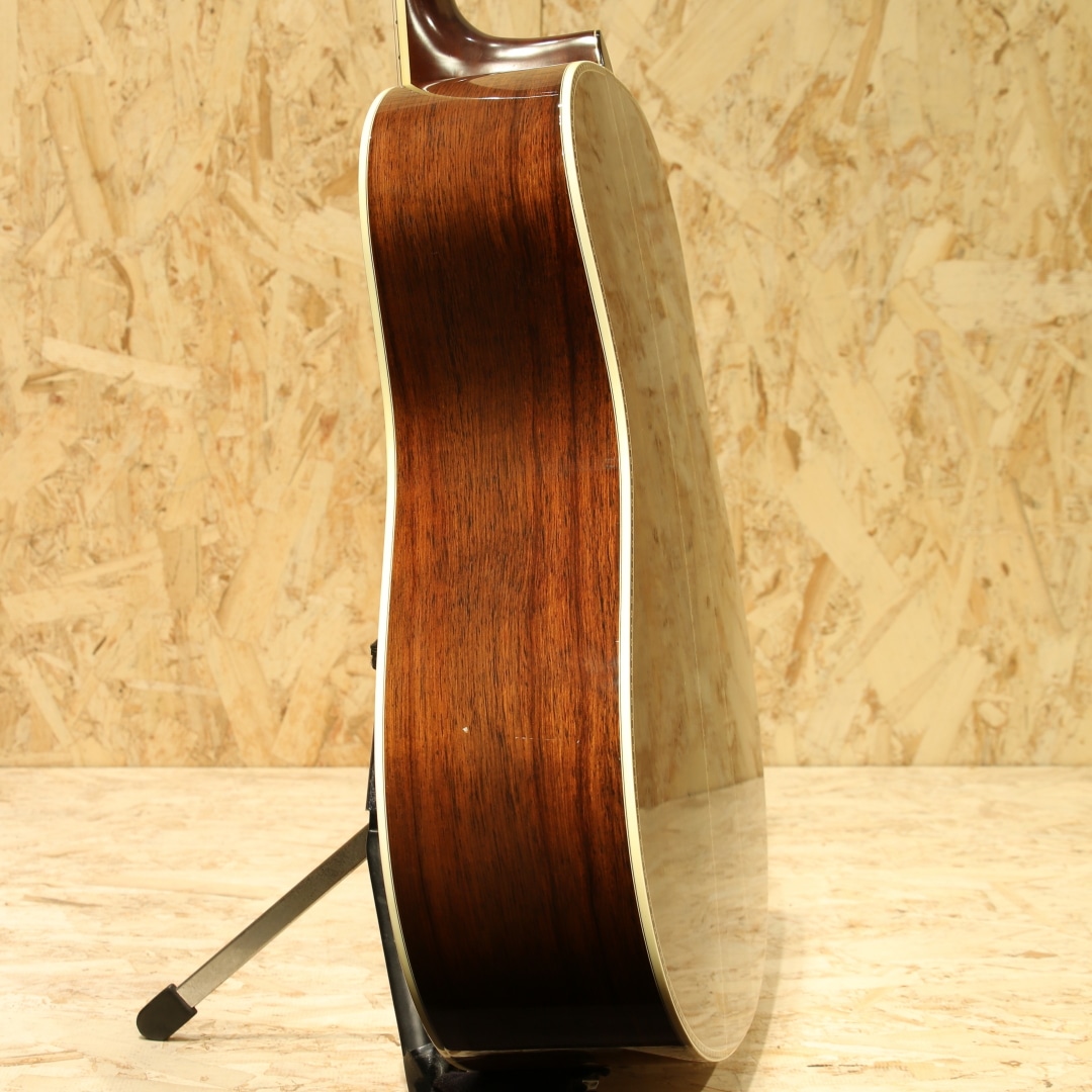 ヤマハLシリーズはLuxuryの名を冠された高級シリーズ。現在でも脈々とLシリーズは受け継がれており、その名に恥じないヤマハ独自の仕様をふんだんに盛り込んだ人気のシリーズです。本器はハカランダサイドバックを採用したピックアップ付きモデルL-15E。1983年製のUSED品です。エゾ松トップ、ハカランダサイド&3Pバック、マホガニーネック、黒々としたエボニー指板&ブリッジ、オリジナルゴールドロトマチックペグ、オリジナル音叉マーク入りロッドカバー、オリジナルウッド指板インレイ、寄木ロゼッタ、ベッコウ柄ピックガード、ノンスキャロップブレイシング、オリジナルピックアップシステム搭載。L-15は1975年に発売開始された人気の単板ドレッドノートモデル。ハカランダを使用したサイドバックと豪華なスペックを与えられたモデルでした。この時期のヤマハの例に漏れず本モデルも前期型と後期型が存在し、大きなところではボディシェイプが変更となりました。L-10のようなウェスタンボディから、四天王L-53と同じジャンボボディへ。それに伴いポジションマークやロッドカバー形状も変化しています。この時期特有のクリアで磨き抜かれたような煌びやかさを持つヤマハサウンド。それだけではなくボリューム感も大きく感じられ、溌溂とした活舌の良さ。日本らしい特有の響きと言えるでしょう。一度かき鳴らせばフォークソングが始まるかのような、情緒あふれるノスタルジーな音色。爪弾けばスリーフィンガーを試したくなるフォーキーなトーンを持ち味とします。現代のモノと比べるとややVシェイプでやや太めに感じるグリップですが、握り込んで演奏するスタイルにはバッチリフィット。まだまだ現役で使えるヤマハギターです。ピックアップシステムには当時のヤマハオリジナルのシステムを搭載。サドル一体型のピックアップで音を拾い、ボディサイドに取り付けられたコントローラーで音色調整。積極的なサウンドの変更もでき、現代においても対応出来そうなシステムです。ペグのくすみや薄い擦りキズこそ見られますが、非常に使用感が少なく良好な1本。演奏性も良いままに保たれ、まだまだ現役の1本です。日本のフォークブームを支えたヤマハトラディショナルモデルの"L-15"、古き良きジャパンフォークがお好きな方には是非、ご体感いただきたい1本です。
