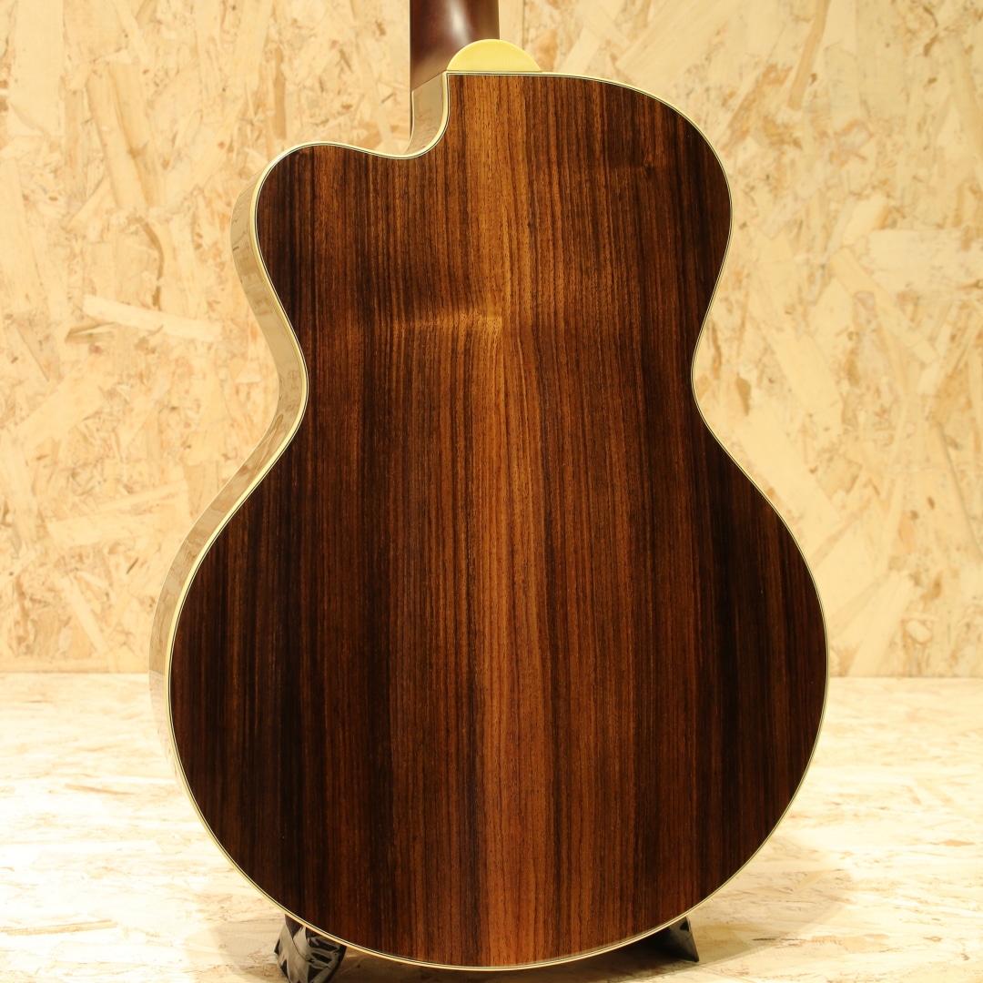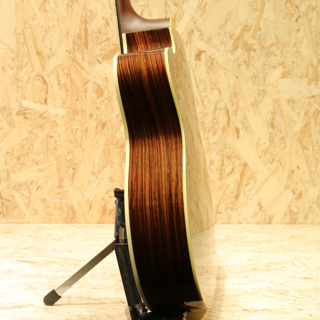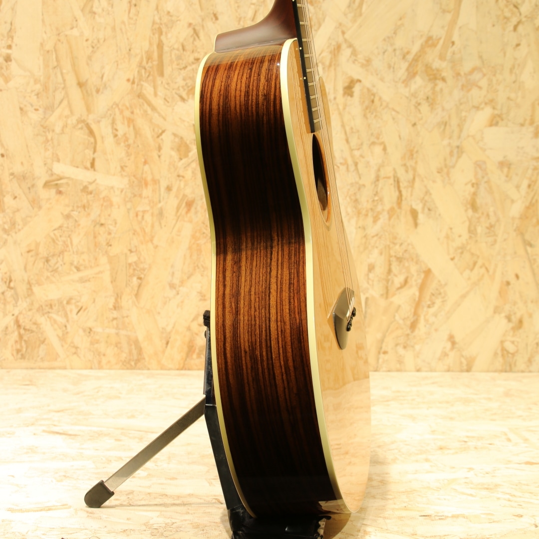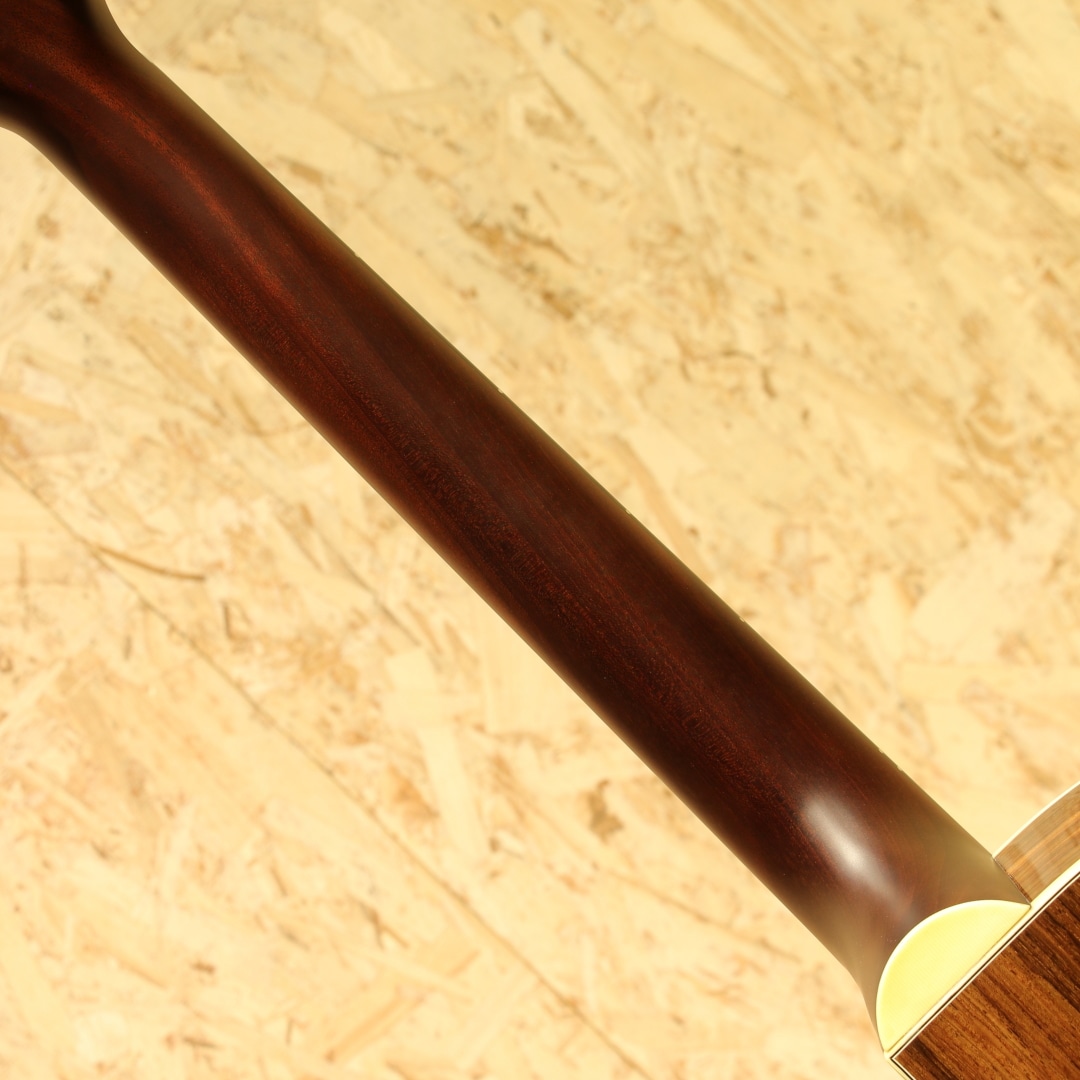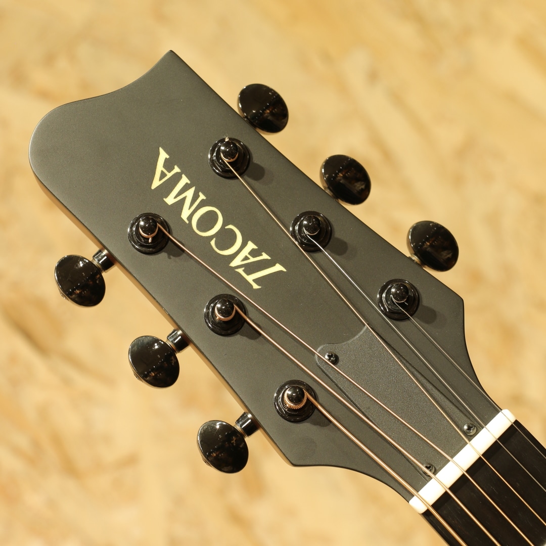 タコマギターは1991年に創立され、ワシントン州タコマの地からブランド名を取ったアメリカンブランドです。代表的なチーフモデルなどユニークなデザインと高い実用性を兼ね備えたギター製作で2008年の工場閉鎖までに国内外を含め多くのプロミュージシャンに支持され人気を博しました。本器は2001年から2003年頃にかけて製造されていたモデル”ER-22C”。2000年代製のUSED品。シダートップ、ローズウッドサイド&バック、マホガニーネック、エボニー指板&ブリッジ。約15.5インチほどのくびれの深いオリジナルセミジャンボボディーシェイプ、カッタウェイ。シダーらしいすっきりした立ち上がりと分離の良さを持ちまろやかで包み込むような抱擁感を楽しめます。ローズウッド特有のレンジ感の広さや音の広がり感も魅力の一つ。ジャンルを問わず楽しめるフラットな音色でフラットピックを使ったプレイからフィンガースタイルにも順応します。エンドピンはジャックサイズに拡張されており、同サイズのブラックの金属タイプのモノがマウントされています。ネック裏の塗装はリフィニッシュ済み、ボディの塗装はタコマでよく見られる塗装剥離などは見られないため過去にリフィニッシュされている可能性が考えられます。上記塗装面の手入れがあるため、塗装表面に極々薄い擦れキズが見られる程度のキレイな状態を保たれている個体。ネック周りの演奏性は整えられ、標準的な弦高、サドル残りも充分残した1本です。最近では流通も少ないタコマギター。手入れこそ入っていますが、使いやすさが増しているとも考えられる実用度の高い個体です。お探しだった方は是非お早めに。