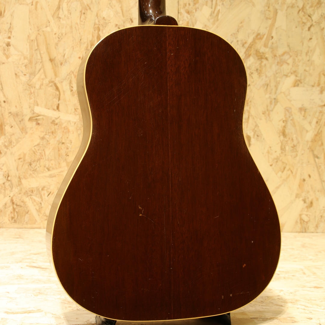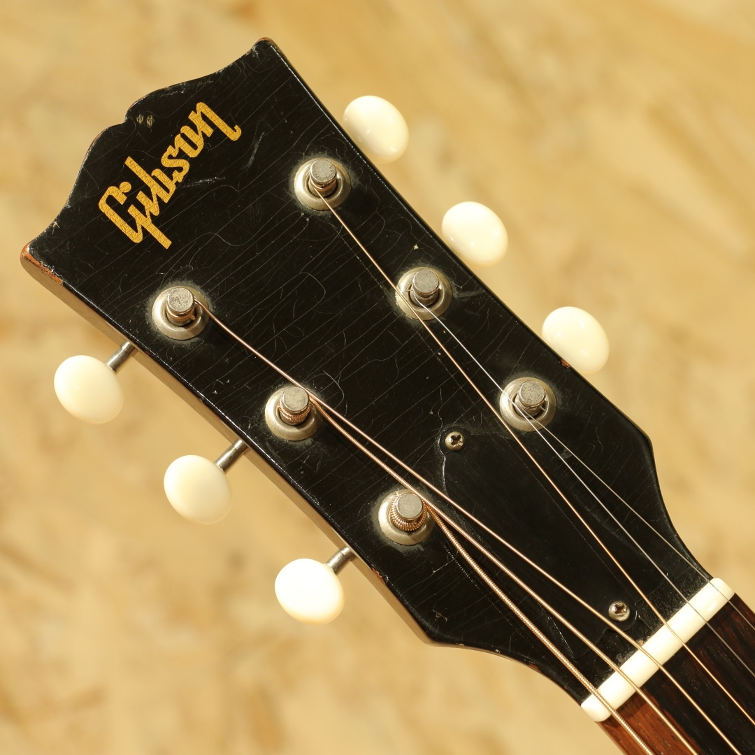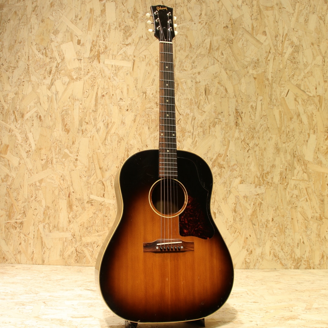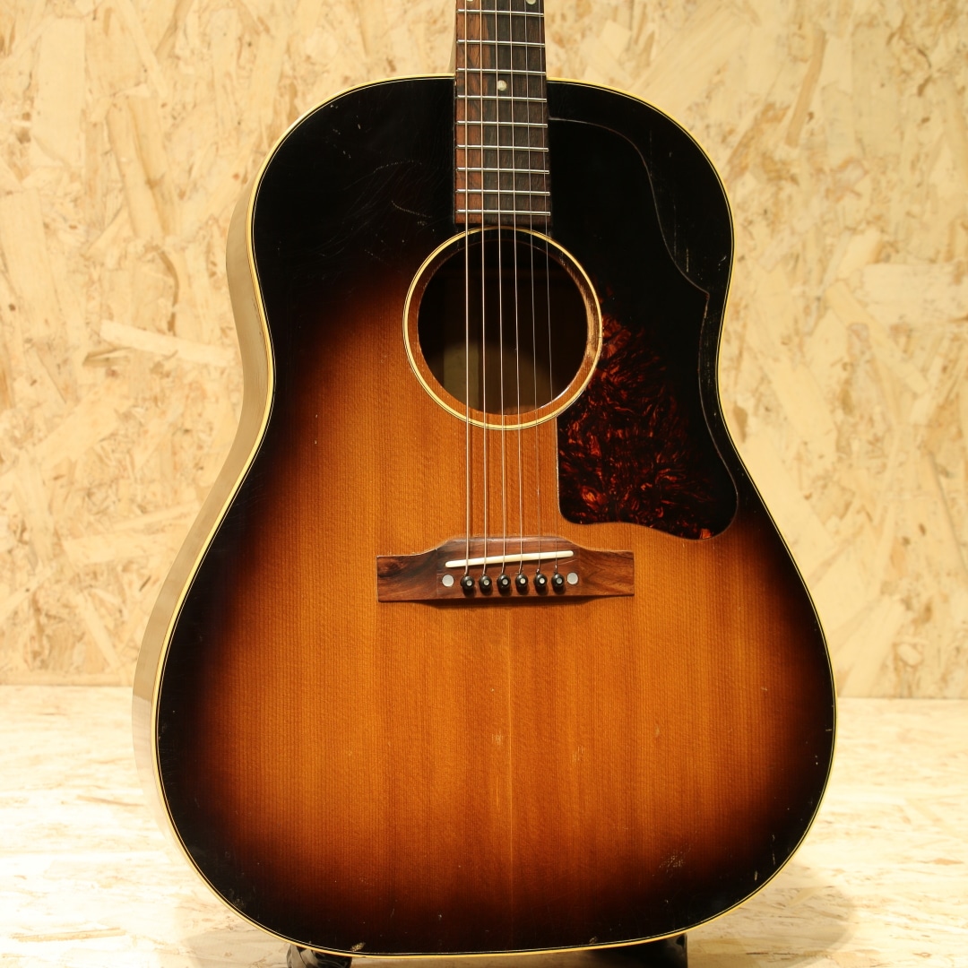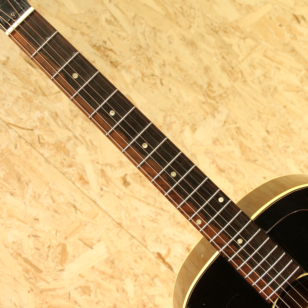 1942年の登場より不動の人気を誇るJ-45。現在に至るまでアコースティックギターシーンのトップを走り続けるロングセラーモデルです。本機はアーティスト使用も多い50年代後期の"J-45"1956年製Vintage品。スプルーストップ、マホガニーサイド&バック、マホガニーネック、ハカランダ指板&ブリッジ、ノーマルストレートサドル、オリジナル・シン・ポインテッド・ラージピックガード、シングルリングロゼッタ、ノーライン3連クルーソンタイプペグにリプレイス、エンドピンは稀に見られる押し込み型のピンです。ノンスキャロップドXブレイシング。スキャロップ期から1955年頃にノンスキャロップへと変更が入ったJ-45。そこからも年々ブレイシングの高さや幅が変わるなど年を追うごとにサウンドの傾向が変わっていきます。本器は変更が入ってから早い時期の個体。ノンスキャロップ特有の芯の強いサウンド、ブライトな響きを持ちますが、比較的スキャロップ期に通じるウォームさを感じさせます。ADJよりもコシのある音色、ボリューム感と演奏スタイルを問わず、ネックシェイプも後の59年ネックよりややスリム。比較的現代的な演奏性を与えられた扱いやすい1本です。ボディバック面センターよりやや1弦側の下部に11cm程の木部クラックの修正跡、ボディトップ面1弦側ショルダー箇所ピックガード上に3か所の木部クラック痕が見られますが、両者ともキレイに修正されています。その他にはボディ内部に割れ修正の際に付いたであろう接着剤跡が目立つ点やネック裏10F付近に演奏性に関わらない程の薄い線キズやボディサイドの僅かな塗装負けこそ見られるモノの、全体的に細やかな当てキズや薄い線キズと良好なコンディションをキープ。ネック周りの演奏性も整えられプレイコンディションは文句なし、サドル残りも充分と非常に実用性の高い個体。現在市場にも少ない50年代J-45。ご検討の際はお早めに。