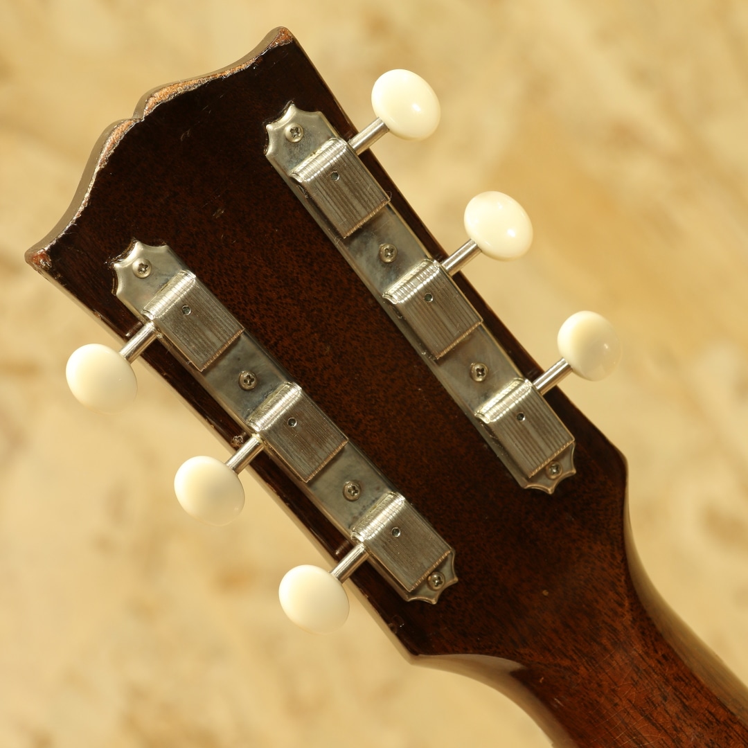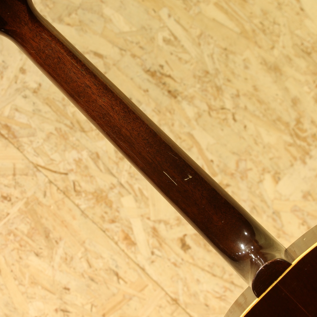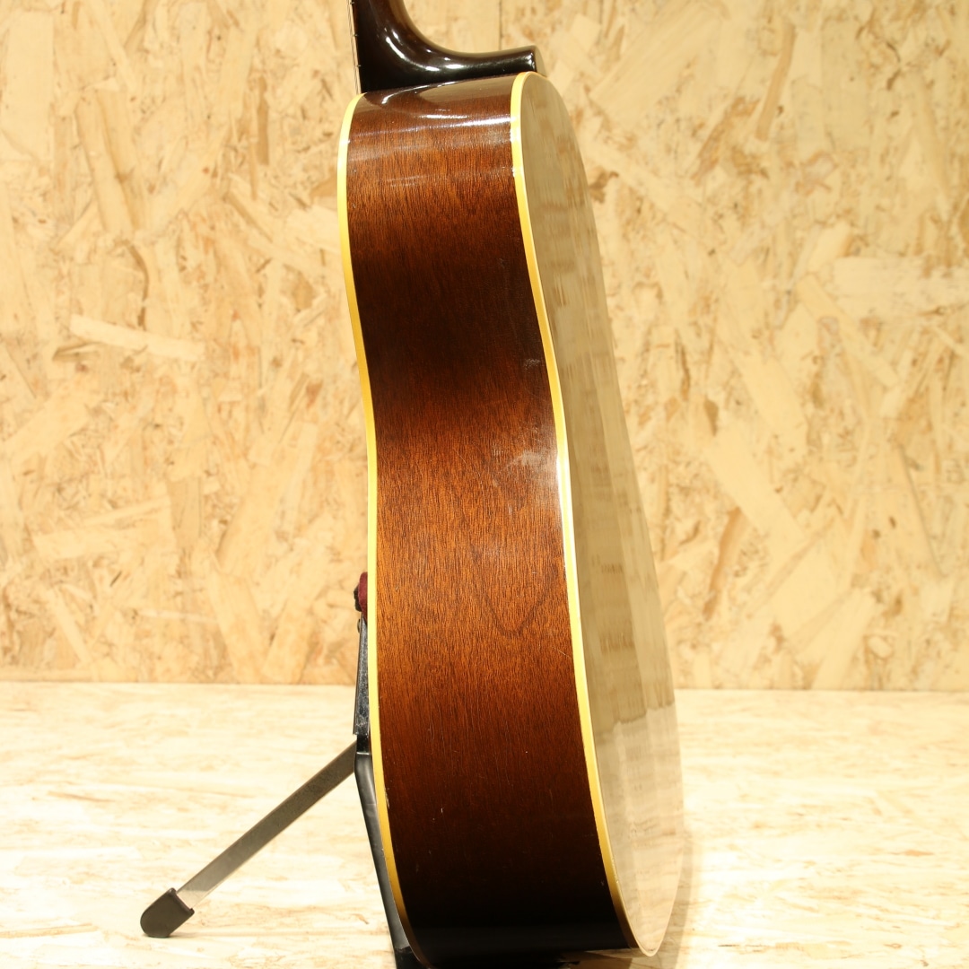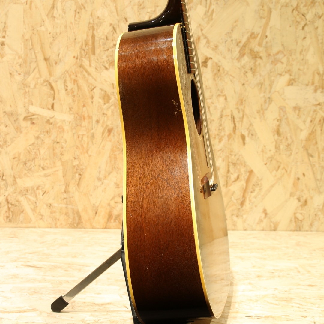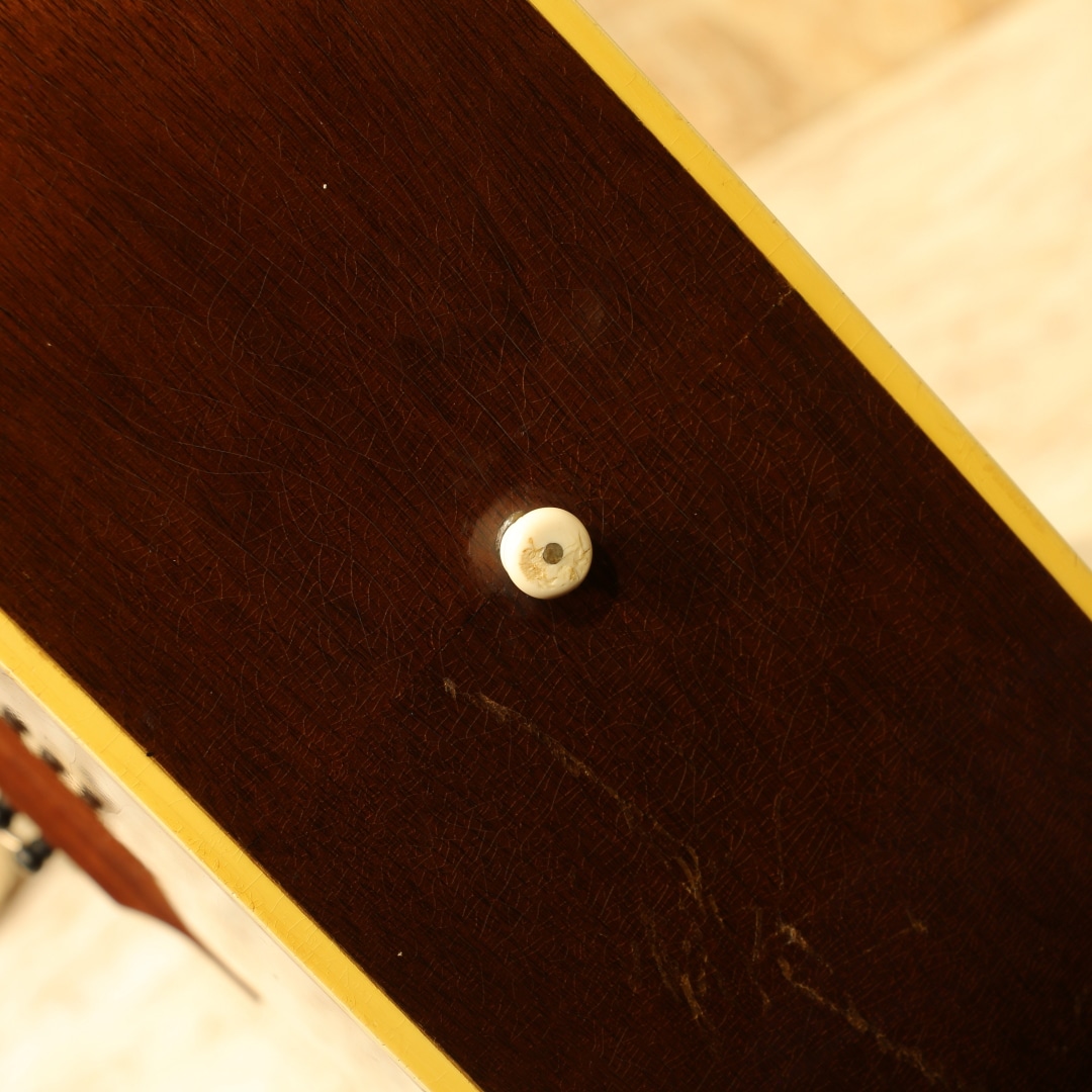 1942年の登場より不動の人気を誇るJ-45。現在に至るまでアコースティックギターシーンのトップを走り続けるロングセラーモデルです。本機はアーティスト使用も多い50年代後期の"J-45"1956年製Vintage品。スプルーストップ、マホガニーサイド&バック、マホガニーネック、ハカランダ指板&ブリッジ、ノーマルストレートサドル、オリジナル・シン・ポインテッド・ラージピックガード、シングルリングロゼッタ、ノーライン3連クルーソンタイプペグにリプレイス、エンドピンは稀に見られる押し込み型のピンです。ノンスキャロップドXブレイシング。スキャロップ期から1955年頃にノンスキャロップへと変更が入ったJ-45。そこからも年々ブレイシングの高さや幅が変わるなど年を追うごとにサウンドの傾向が変わっていきます。本器は変更が入ってから早い時期の個体。ノンスキャロップ特有の芯の強いサウンド、ブライトな響きを持ちますが、比較的スキャロップ期に通じるウォームさを感じさせます。ADJよりもコシのある音色、ボリューム感と演奏スタイルを問わず、ネックシェイプも後の59年ネックよりややスリム。比較的現代的な演奏性を与えられた扱いやすい1本です。ボディバック面センターよりやや1弦側の下部に11cm程の木部クラックの修正跡、ボディトップ面1弦側ショルダー箇所ピックガード上に3か所の木部クラック痕が見られますが、両者ともキレイに修正されています。その他にはボディ内部に割れ修正の際に付いたであろう接着剤跡が目立つ点やネック裏10F付近に演奏性に関わらない程の薄い線キズやボディサイドの僅かな塗装負けこそ見られるモノの、全体的に細やかな当てキズや薄い線キズと良好なコンディションをキープ。ネック周りの演奏性も整えられプレイコンディションは文句なし、サドル残りも充分と非常に実用性の高い個体。現在市場にも少ない50年代J-45。ご検討の際はお早めに。