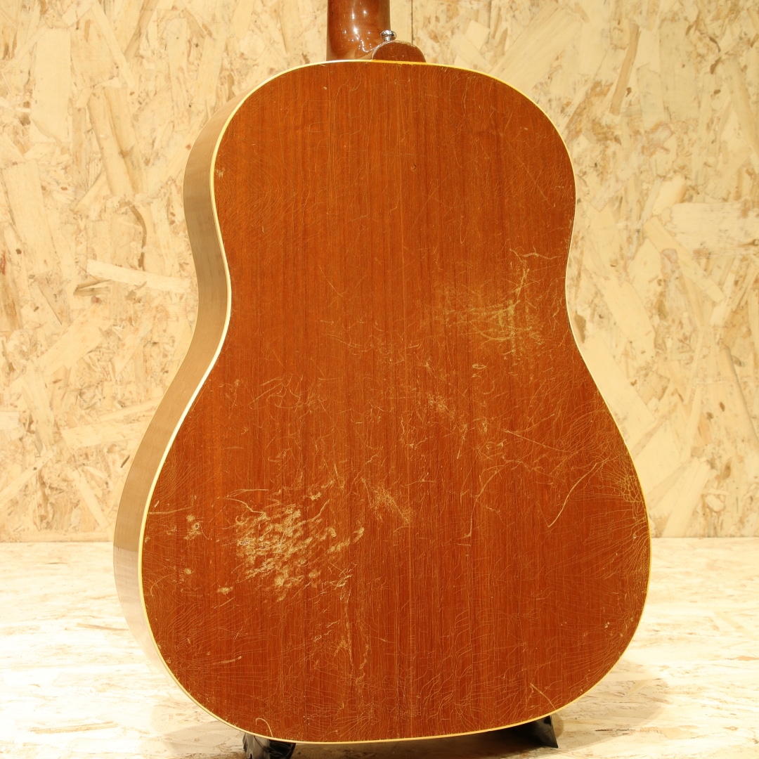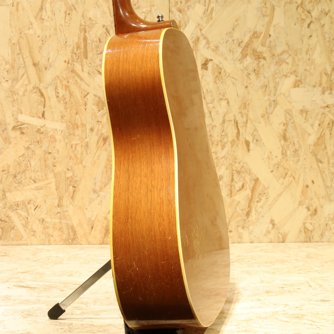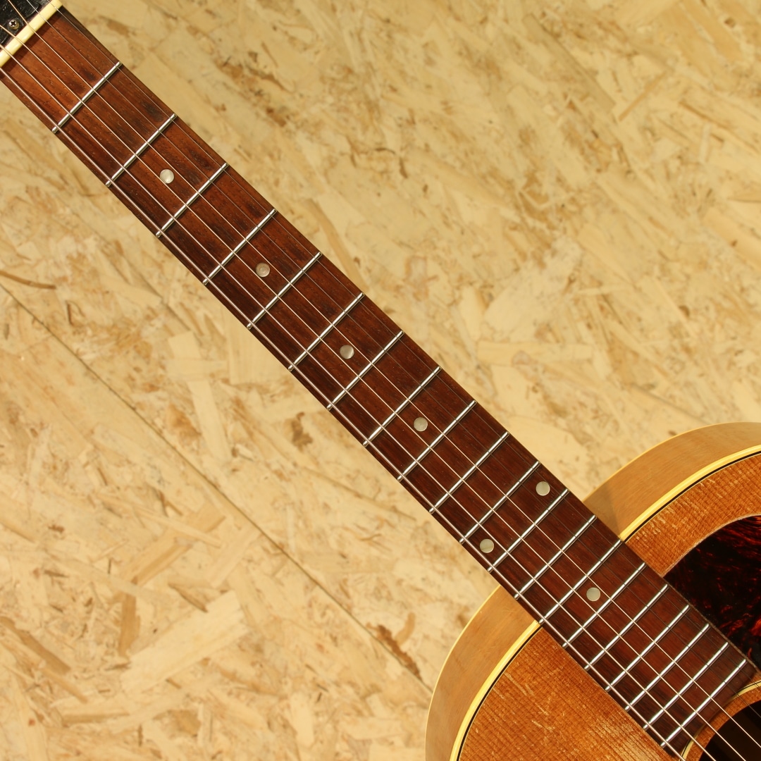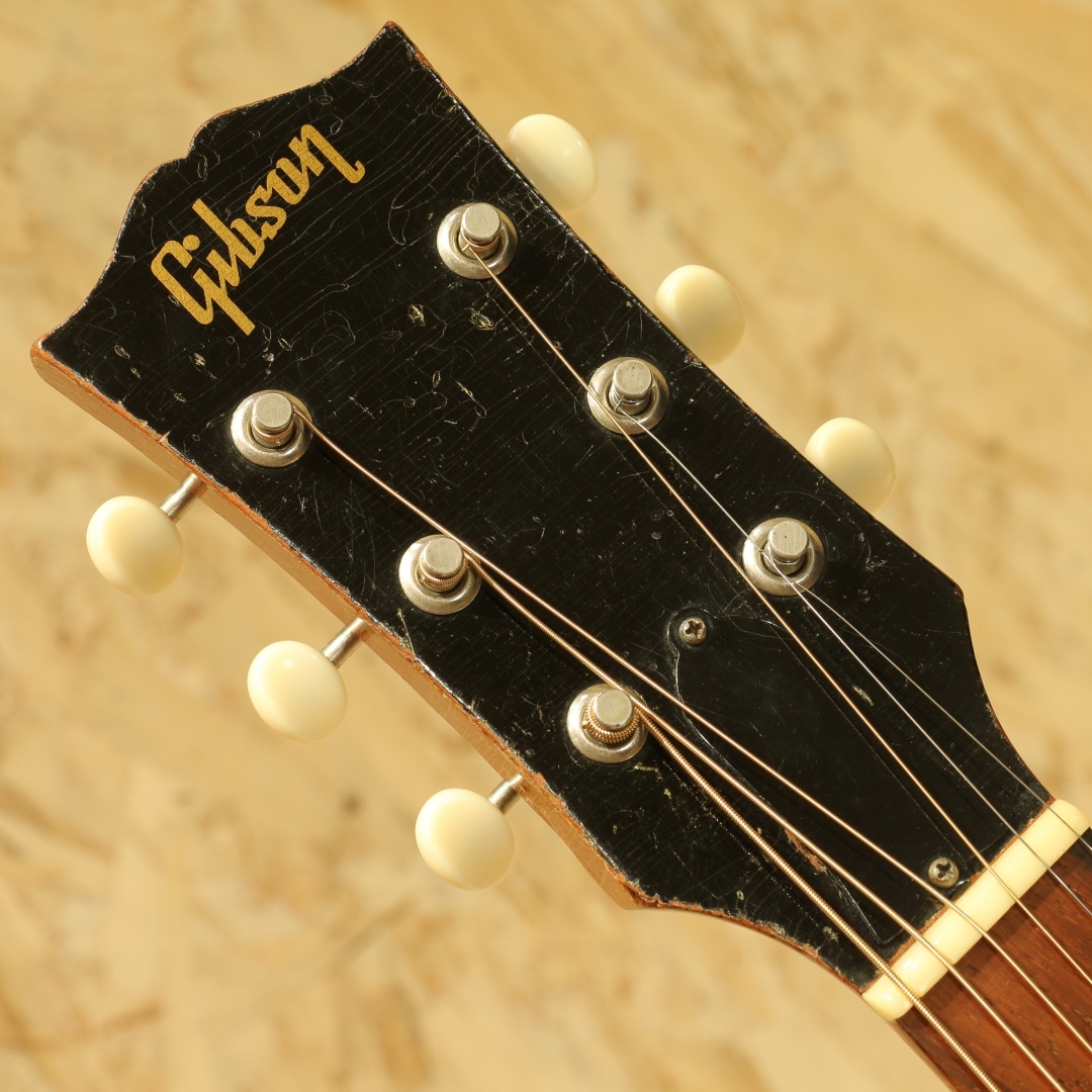 J-45のナチュラルカラーバージョンとして発売開始されたロングセラーモデル。ワーキングホースの名で親しまれてきた"J-50"1956年製Vintage品。スプルーストップ、マホガニーサイド&バック、マホガニーネック、オリジナルのハカランダ指板&ブリッジ、ノーマルスロットサドル、オリジナル塗り込みラージピックガード、シングルリングロゼッタ、実用を優先し同型のAGED3連クルーソンペグにリプレイス(ヘッドプレート側ブッシュはオリジナル)、ノンスキャロップドXブレイシング。後の60年代に比べ、この時期ならではやや厚みを持ったネックが特徴の本器。ファットながらノンスキャロップのためおさまりの良い低音でコントロールしやすくプロの現場でも定評のある時期です。同時期よりオプションでADJサドル仕様の物もラインナップとして加わりましたが、本器はノーマルスロットサドル仕様。トップセンターより約4cmほど1弦側にブリッジ下からボトムにかけてのクラック修正あり。ピックガード上面内側からサウンドホールに沿ってのクラック修正があります。ロゼッタ周辺からピックガード回りには地肌が見えるほどのピッキングによる削れがみられますが特に修正なく使用できます。よく弾きこまれ使用されてきた個体で大小うねりの効いたウェザーチェック、各所に刻まれた打痕、ネックヒールへのストラップピンマウント、バック面にはバックルでついたような面でけずれたような跡もあります。しかしながら演奏面へ関わる箇所へのケアーはとても大事に行われております。交換し整えられたナットサドル、リフレット、ネック裏のオーバーラッカー、ブリッジプレートはオリジナルで削れも少なく問題なし。サドルの出代も適度で今後の使用にも安心です。ファットで抜群のヌケ感を持つ本器。長年大事に大事愛用され、調整されてきた楽器だからこそが持つこれぞLate50sラウンドショルダーというべくサウンドを持っています。オリジナルのGIBSONバッジ付のチップボードケースと汎用ハードケースを付属しています。まずは手に取ってこの良サウンドをお楽しみください。お気に召して頂けると思います。