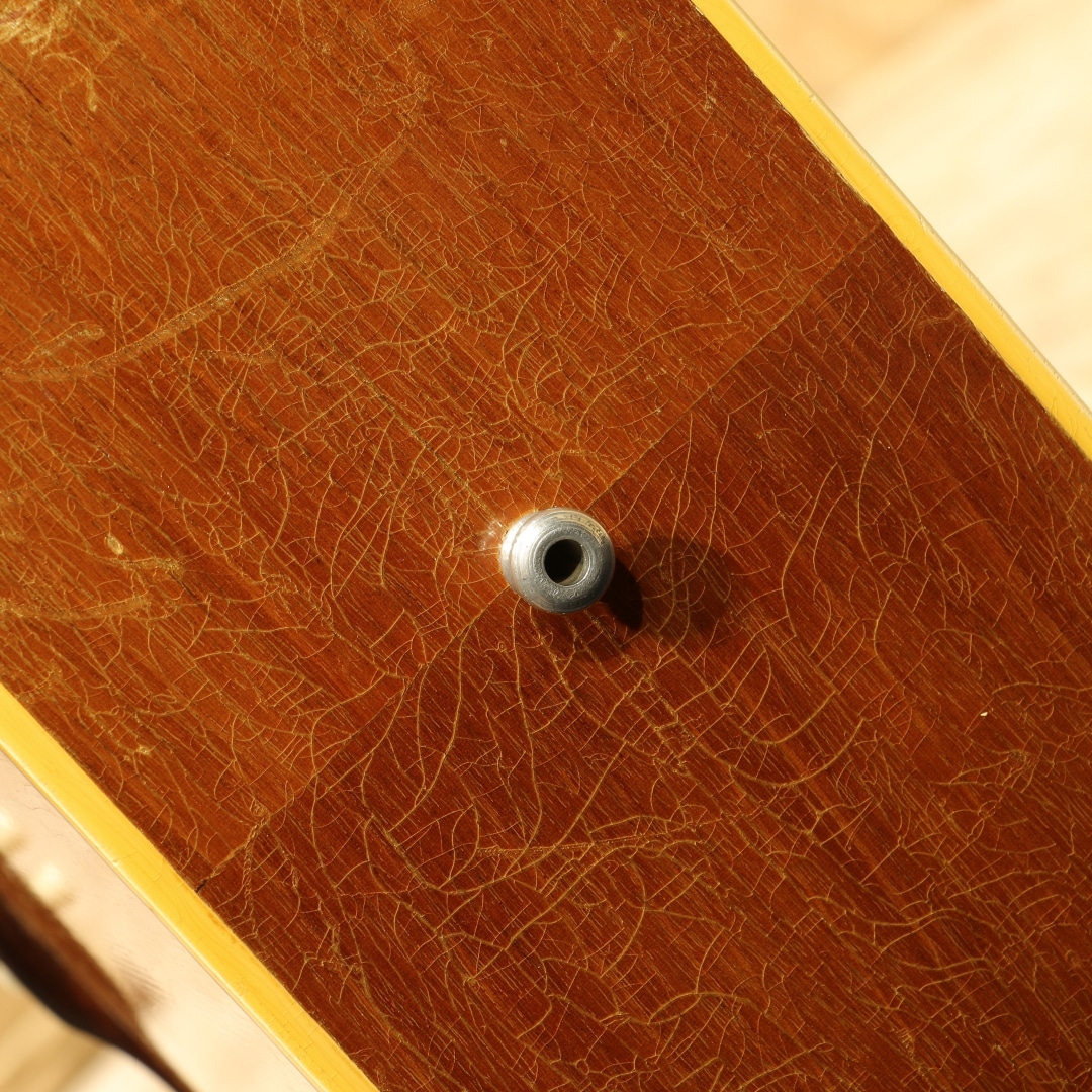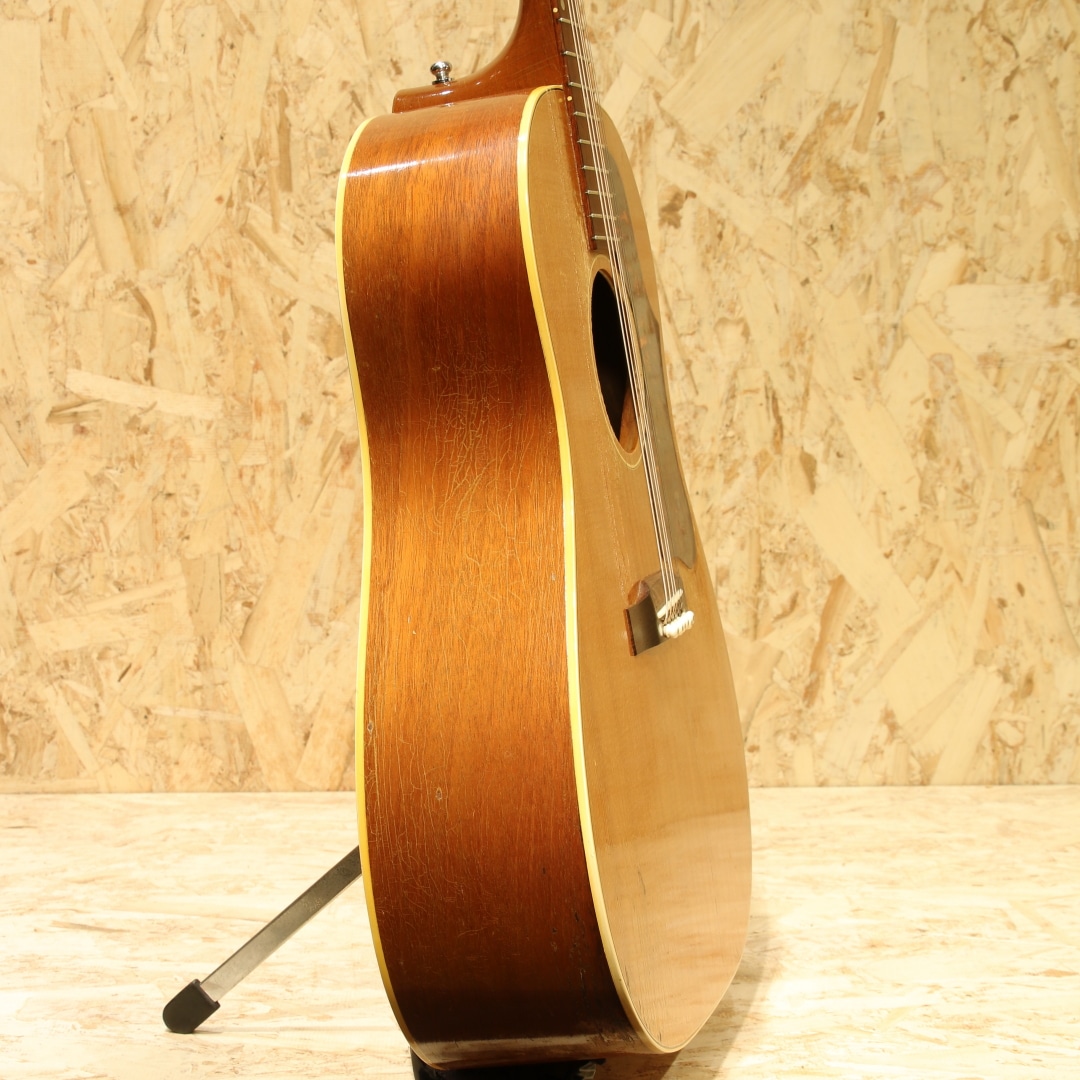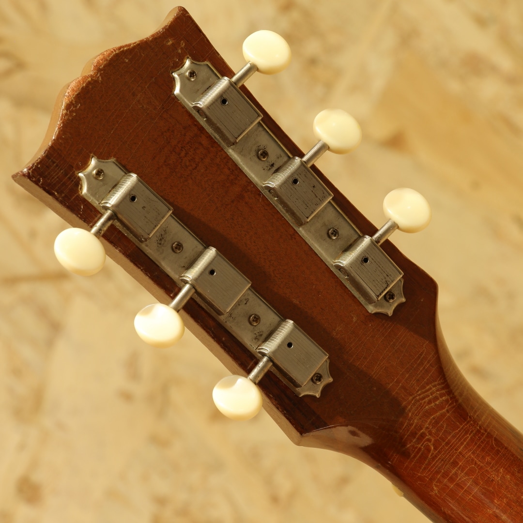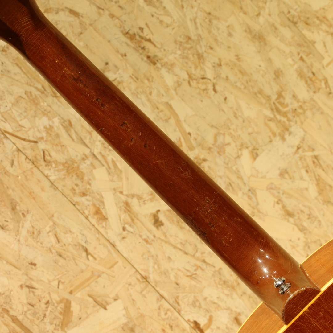 J-45のナチュラルカラーバージョンとして発売開始されたロングセラーモデル。ワーキングホースの名で親しまれてきた"J-50"1956年製Vintage品。スプルーストップ、マホガニーサイド&バック、マホガニーネック、オリジナルのハカランダ指板&ブリッジ、ノーマルスロットサドル、オリジナル塗り込みラージピックガード、シングルリングロゼッタ、実用を優先し同型のAGED3連クルーソンペグにリプレイス(ヘッドプレート側ブッシュはオリジナル)、ノンスキャロップドXブレイシング。後の60年代に比べ、この時期ならではやや厚みを持ったネックが特徴の本器。ファットながらノンスキャロップのためおさまりの良い低音でコントロールしやすくプロの現場でも定評のある時期です。同時期よりオプションでADJサドル仕様の物もラインナップとして加わりましたが、本器はノーマルスロットサドル仕様。トップセンターより約4cmほど1弦側にブリッジ下からボトムにかけてのクラック修正あり。ピックガード上面内側からサウンドホールに沿ってのクラック修正があります。ロゼッタ周辺からピックガード回りには地肌が見えるほどのピッキングによる削れがみられますが特に修正なく使用できます。よく弾きこまれ使用されてきた個体で大小うねりの効いたウェザーチェック、各所に刻まれた打痕、ネックヒールへのストラップピンマウント、バック面にはバックルでついたような面でけずれたような跡もあります。しかしながら演奏面へ関わる箇所へのケアーはとても大事に行われております。交換し整えられたナットサドル、リフレット、ネック裏のオーバーラッカー、ブリッジプレートはオリジナルで削れも少なく問題なし。サドルの出代も適度で今後の使用にも安心です。ファットで抜群のヌケ感を持つ本器。長年大事に大事愛用され、調整されてきた楽器だからこそが持つこれぞLate50sラウンドショルダーというべくサウンドを持っています。オリジナルのGIBSONバッジ付のチップボードケースと汎用ハードケースを付属しています。まずは手に取ってこの良サウンドをお楽しみください。お気に召して頂けると思います。