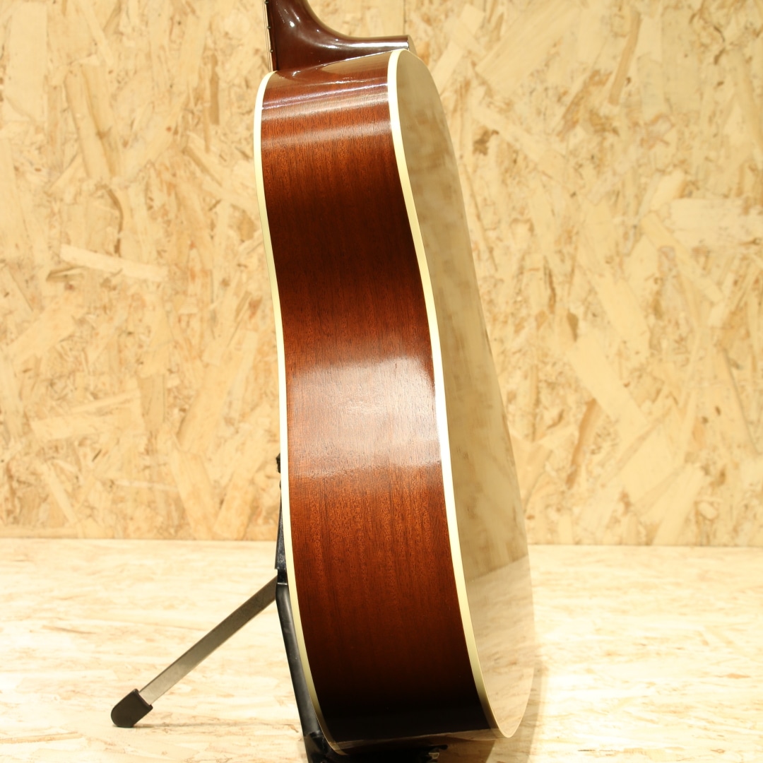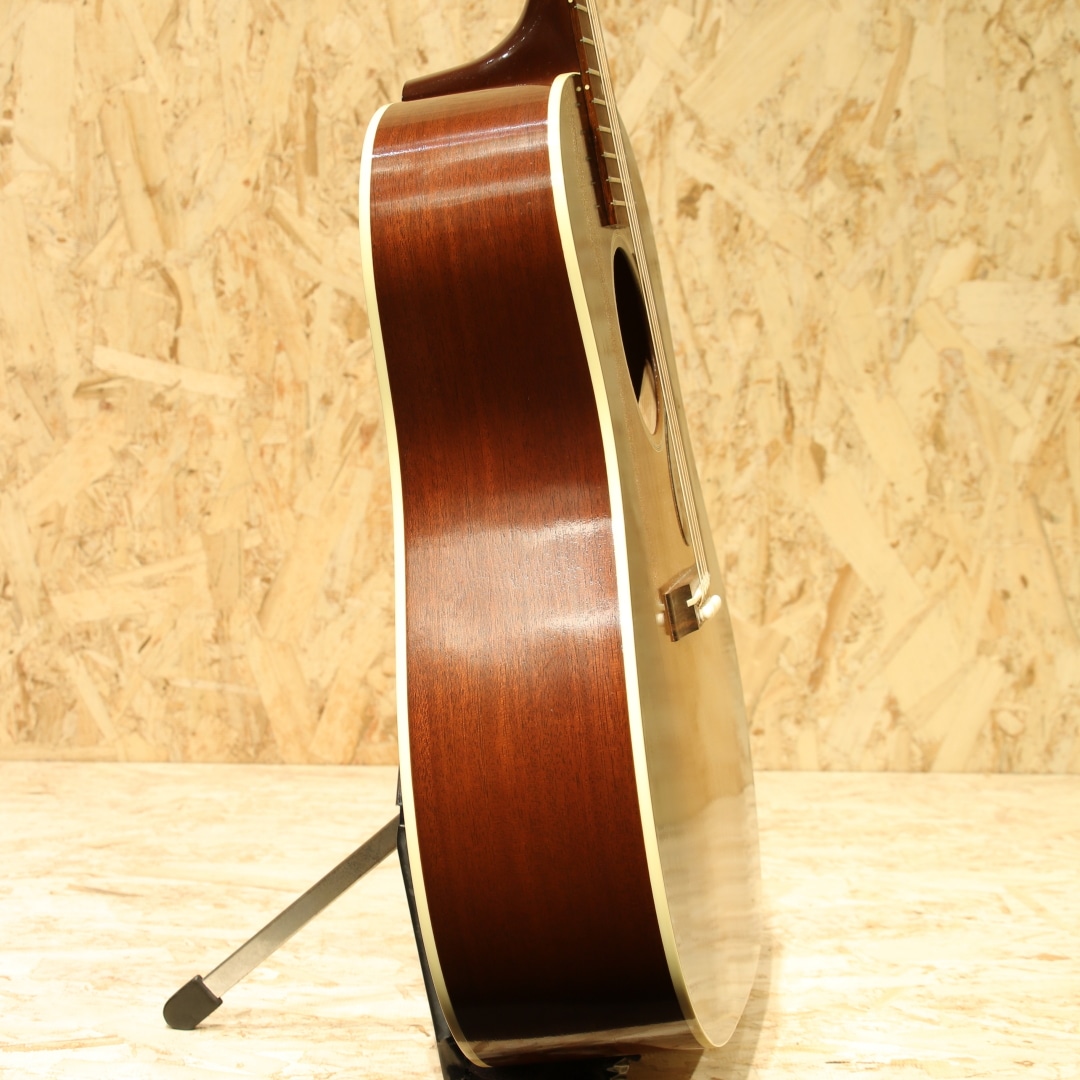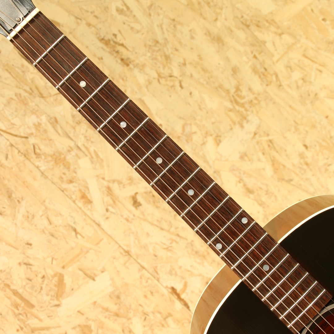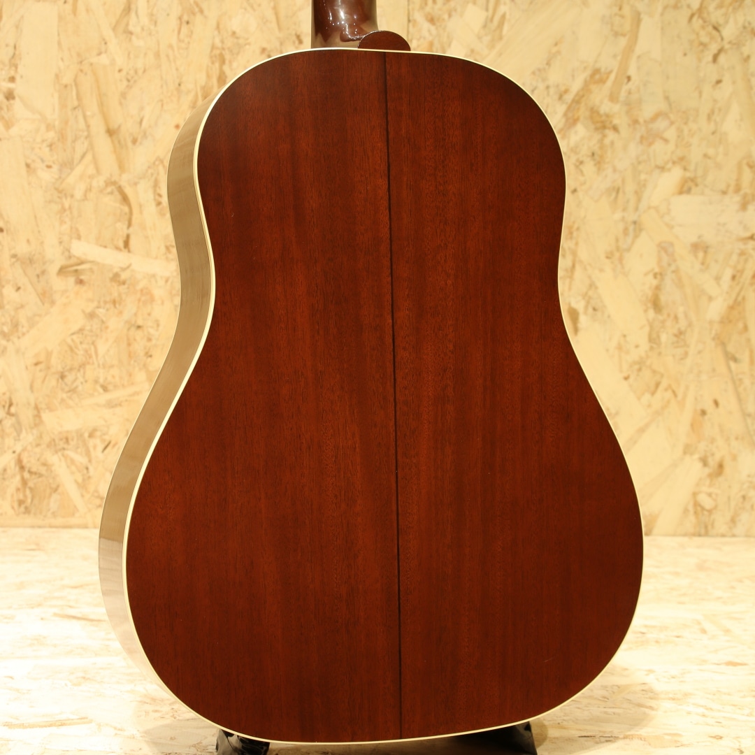 "The Workhorse" の愛称で信頼されるベストセラー・モデル。1942年の登場以来、ギブソン・ラウンド・ショルダー・ラインナップの中心的役割を担い続ける”J-45”。基本的なスタイルは継承されつつも時代に合わせたマイナーチェンジを繰り返し、永遠の定番として君臨し続けてきました。本器は発売開始初年度1942年製のJ-45を再現した限定復刻モデル”1942 Banner J-45”、2023年製USED品。サーマリーエイジドアディロンダックレッドスプルース、マホガニーサイド&バック、通称"ベースボールバット”極太マホガニーネック、スモールトートイズ柄ピックガード、オープンスリーパープレートチューナー、レクタングルブリッジ&ロングサドル、導管が見えるほどの極薄のシンラッカーフィニッシュ、トップブレイシングは高級ニカワ接着など当時を彷彿とさせる拘り抜かれた仕様です。ネック自体も40年代の代名詞とも言えるベースボールバットの異名を持つほどの太いネック、そのイメージで太さのあるグリップに仕上げられておりファットなサウンドを獲得。もたつきの無いドライなトーン、そして何よりも爆発力のある響き、音の情報量も多くレンジ感のやや広い辺りも良く再現されています。音の暴力とも言える程のファット且つボリューミーなサウンド、この爆発力は現行品の中でも随一で他では体感できない程のインパクト。ウォームな低域とエッジの効いた中高域が織りなす優れた表現力でプレイヤーを支え、どんなときにも信頼できるパートナーとして人気を誇るJ-45。トップ面1弦側に杢目に沿った割れ跡がありますがリペア済でしっかりと修正されています。3フレットネック裏辺りにやや打痕がありますが、大きなものではないので使用上への影響はありません。VOSフィニッシュの為、ところどころ塗装の曇りなどがございますが、経年使用の雰囲気が漂い、あまり気になりません。当時を思わすような弦高セッティングですが、サドルでの下げ幅も残っていますのでご希望の方は調整等も可能です。ギブソン黄金期のオリジナル・モデルならではの個性、雰囲気、フィーリングが感じられる仕上がり。現行品"J-45"の中でもまさに最高峰、最上位のサウンド。是非お手元でご体感ください。オリジナルハードケースが付属します。