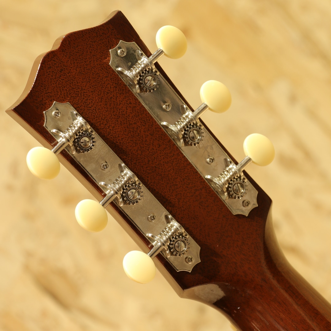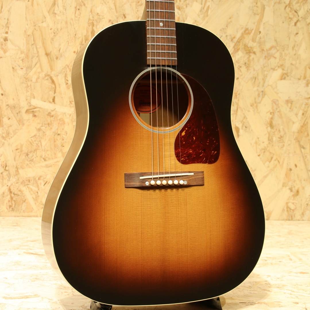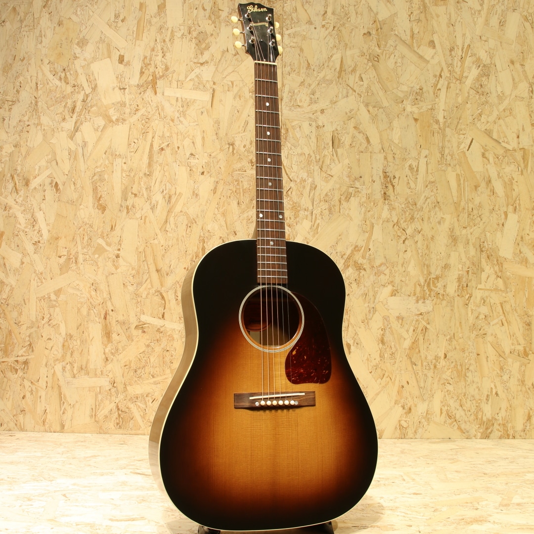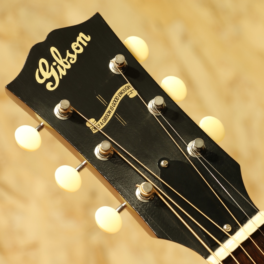 "The Workhorse" の愛称で信頼されるベストセラー・モデル。1942年の登場以来、ギブソン・ラウンド・ショルダー・ラインナップの中心的役割を担い続ける”J-45”。基本的なスタイルは継承されつつも時代に合わせたマイナーチェンジを繰り返し、永遠の定番として君臨し続けてきました。本器は発売開始初年度1942年製のJ-45を再現した限定復刻モデル”1942 Banner J-45”、2023年製USED品。サーマリーエイジドアディロンダックレッドスプルース、マホガニーサイド&バック、通称"ベースボールバット”極太マホガニーネック、スモールトートイズ柄ピックガード、オープンスリーパープレートチューナー、レクタングルブリッジ&ロングサドル、導管が見えるほどの極薄のシンラッカーフィニッシュ、トップブレイシングは高級ニカワ接着など当時を彷彿とさせる拘り抜かれた仕様です。ネック自体も40年代の代名詞とも言えるベースボールバットの異名を持つほどの太いネック、そのイメージで太さのあるグリップに仕上げられておりファットなサウンドを獲得。もたつきの無いドライなトーン、そして何よりも爆発力のある響き、音の情報量も多くレンジ感のやや広い辺りも良く再現されています。音の暴力とも言える程のファット且つボリューミーなサウンド、この爆発力は現行品の中でも随一で他では体感できない程のインパクト。ウォームな低域とエッジの効いた中高域が織りなす優れた表現力でプレイヤーを支え、どんなときにも信頼できるパートナーとして人気を誇るJ-45。トップ面1弦側に杢目に沿った割れ跡がありますがリペア済でしっかりと修正されています。3フレットネック裏辺りにやや打痕がありますが、大きなものではないので使用上への影響はありません。VOSフィニッシュの為、ところどころ塗装の曇りなどがございますが、経年使用の雰囲気が漂い、あまり気になりません。当時を思わすような弦高セッティングですが、サドルでの下げ幅も残っていますのでご希望の方は調整等も可能です。ギブソン黄金期のオリジナル・モデルならではの個性、雰囲気、フィーリングが感じられる仕上がり。現行品"J-45"の中でもまさに最高峰、最上位のサウンド。是非お手元でご体感ください。オリジナルハードケースが付属します。