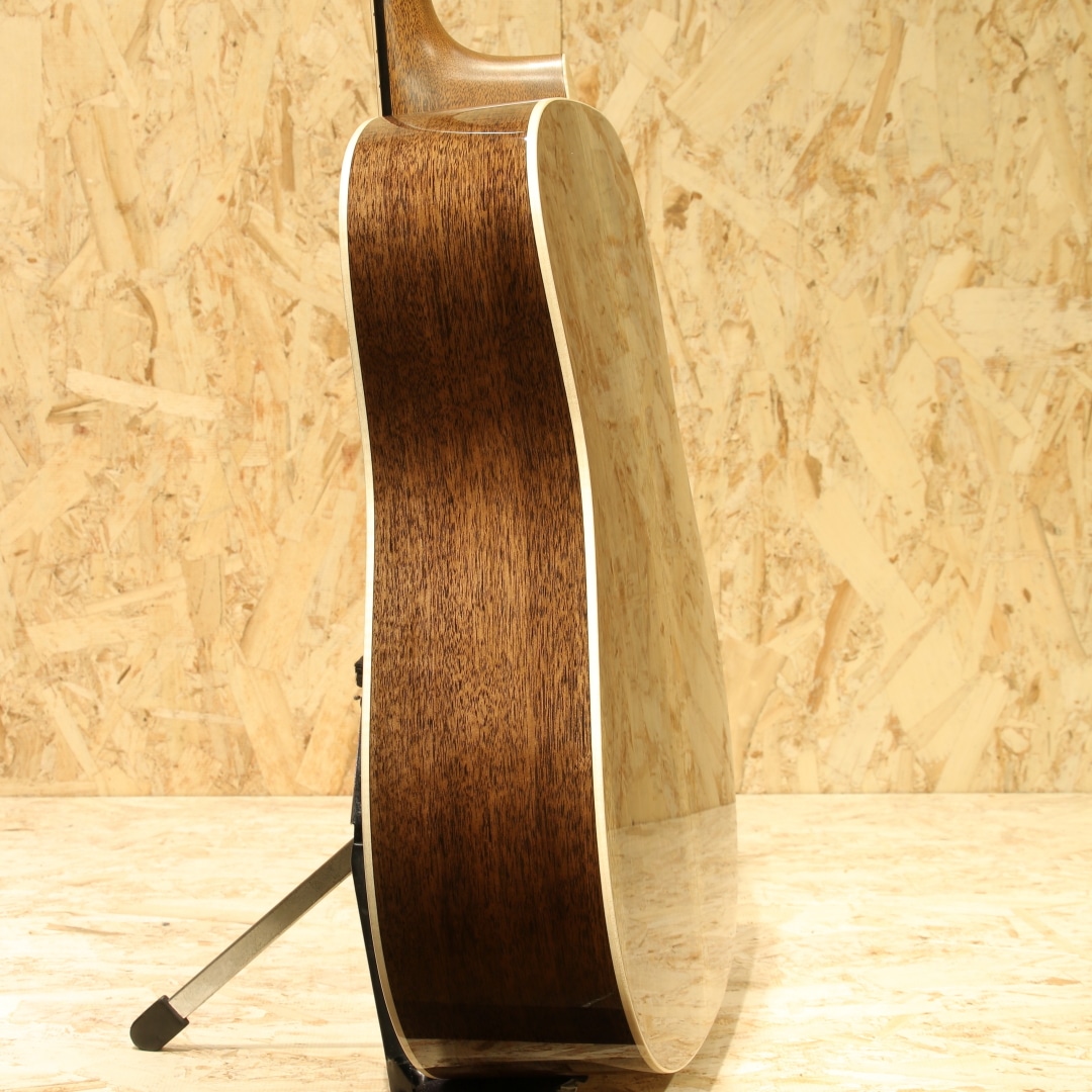 現マーチン工場の中でも、卓越した技術と豊富な経験から至極のギターを造り出す"Martin Custom Shop"。レギュラーラインとは全く異なった環境、工程にて製作。工場の一角に専用の区画があり、昔ながらの工法を継承しながらより精度の高い製作を行っています。ラインナップ上最高峰と言えるオーセンティックシリーズの製作をはじめ、高い完成度を誇るカスタムモデルを製造するトップクラスの部門です。本器は現地工場へ赴いたディーラーのみオーダーが出来たカスタム品”CTM D-18 BlackWalnut”。スプルーストップ、ブラックウォルナットサイド&バック、ジェニュインマホガニーネック、44.5mmナット幅、モディファイドローオーバルネックシェイプ、ハイパフォーマンスネックテーパー、ブラックエボニー指板&ブリッジ、ドットアバロン指板ポジション、ヨーロピアンフレイムメイプルバインディング、グローバーオープンバックバタービンノブペグ、ベッコウ柄ピックガード、オールドスタイルヘッドロゴ、2wayアジャスタブルロッド、フォワードシフテッドスキャロップドXブレイシング。珍しいウォルナットサイドバックのカスタムモデル、以前のラインナップや限定モデルで僅かに見られる仕様です。ヘッドの突板にもウォルナットを使用しており、全体的に淡いペールカラーの印象を受けるギター。バックにはサップも入り、ボディバインディングのフレイムメイプルと色合いがマッチングしています。そしてブラックエボニーでデザインをキュッと引き締められており、メリハリの効いた爽やかな1本に仕上がっています。演奏性の面では今やお馴染みとなったモディファイドローオーバルネックを採用し、ポジションを問わない演奏性を獲得。ナット幅44.5mmでフィンガースタイルにも対応しやすい現代の標準仕様を踏襲しています。そしてサウンド面、元よりカスタムショップ製のギターは音の情報量が多く、輪郭の明瞭さや中域の密度感の高さを感じられます。そこにウォルナットの特性が合わさり非常に抜け感の良いオープンなトーンを生み出しています。ウォルナット自体、低域の出方はマホガニーのように軽快で乾いた風合い、高域の伸び方や艶やかな音色はローズウッドにも似ており、特に中高域のブライトさや押し出し感は両者にも無い特徴です。各弦の音の分離感も非常に良好、しっかりとコードの構成音を聴かせたい時、そしてメロディラインを聴かせたい時にもこの特性は有効。ギターの美味しいポイントを出しやすいためギターを主役に据えた演奏にも最適、また低音が重すぎずカラッとしているトーンはレコーディングでのマイク乗りも良さそうなサウンドです。演奏スタイルも多様化している現代において、新しい選択肢になり得るポテンシャルを持ったカスタムショップ製D18。四季それぞれを儚さや憂い、淡さと異なった雰囲気で彩ってくれそうな1本。現行Martinの最高峰チームが作り上げる挑戦的なギター。是非お試し下さい。