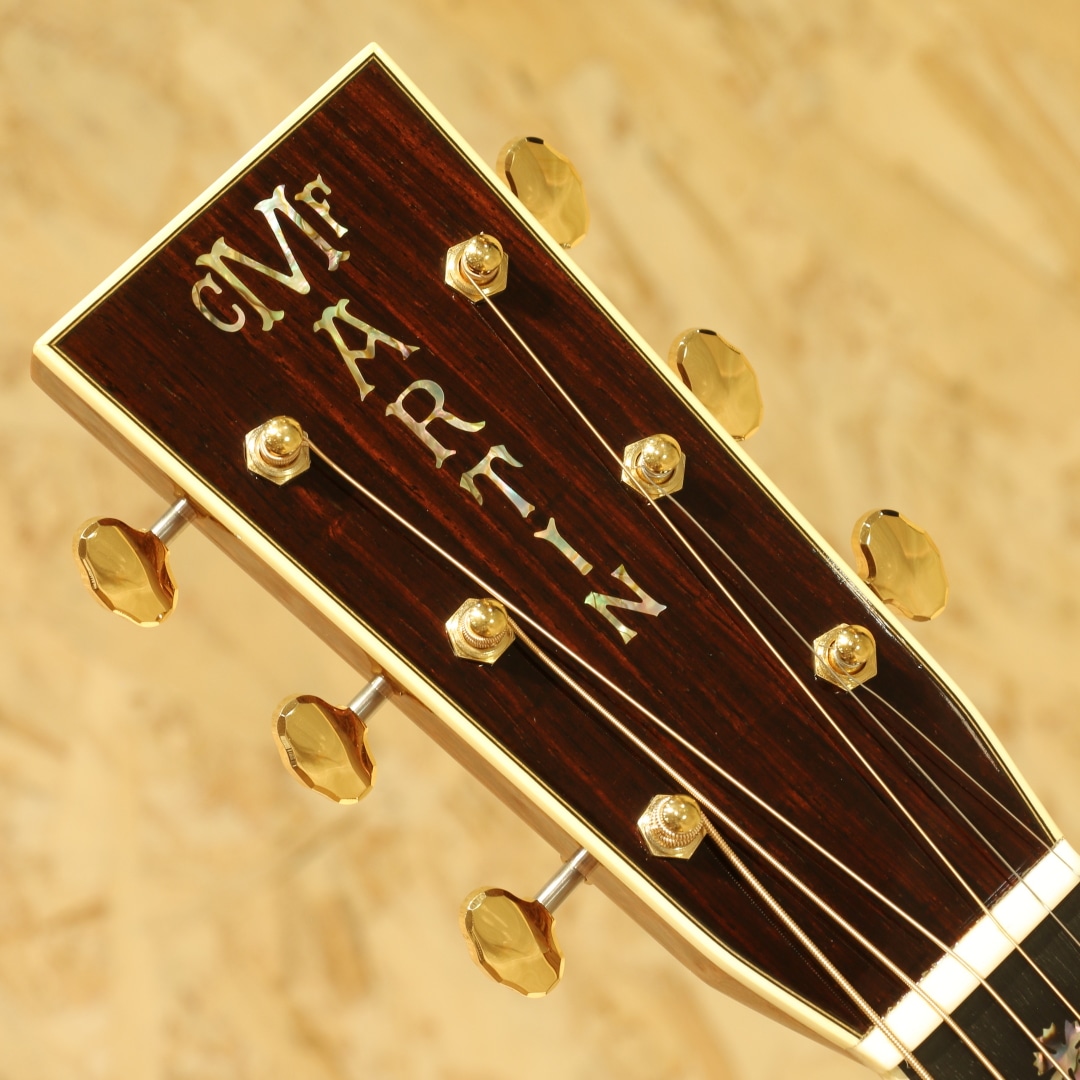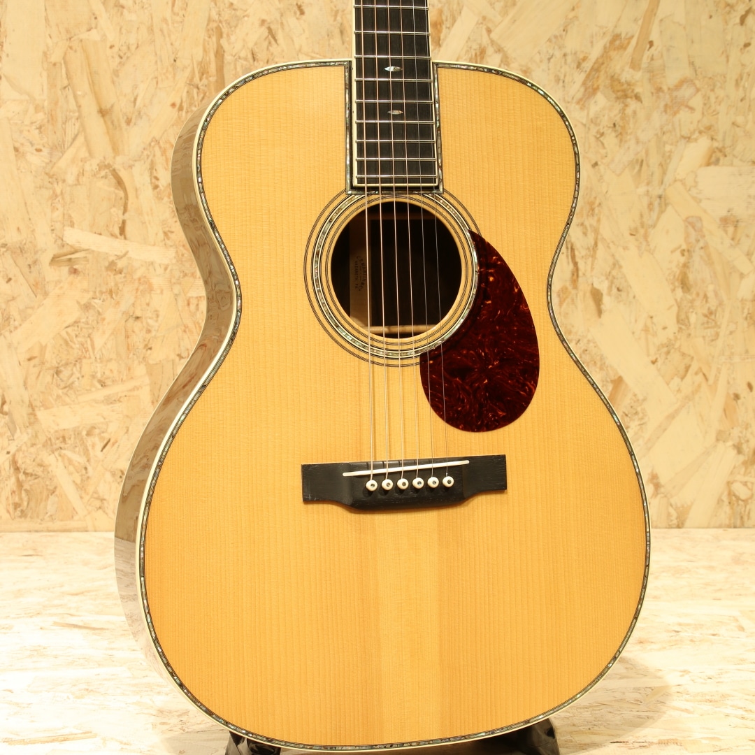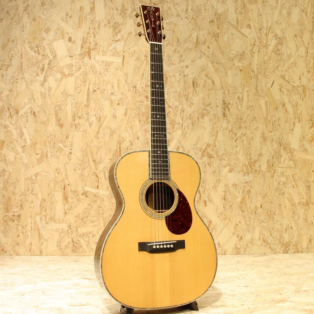 現マーチン工場の中でも、卓越した技術と豊富な経験から至極のギターを造り出す"Martin Custom Shop"。レギュラーラインとは全く異なった環境、工程にて製作。工場の一角に専用の区画があり、昔ながらの工法を継承しながらより精度の高い製作を行っています。ラインナップ上最高峰と言えるオーセンティックシリーズの製作をはじめ、高い完成度を誇るカスタムモデルを製造するトップクラスの部門です。本器はOM-45のカスタムショップ製”CTM OM-45 Adirondack Spruce Cocobolo”。2018年製のUSED品です。アディロンダックスプルーストップ、ココボロサイド&バック、44.5mmナット幅、ロープロファイルネックシェイプ、ブラックエボニー指板&ブリッジ、ロングサドル、Style45スノウフレイク指板ポジション、アバロンロゼッタ、Schaller GrandTuneゴールドペグ、ベッコウ柄ピックガード、オールドスタイルヘッドロゴ、2wayアジャスタブルロッド、アディロンダックスプルース材によるGEスタイルスキャロップドXブレイシング。スペックやルックスは恐らく1933年頃に製作されていたOM-45をデザインの基にしたと推察されます。ロングサドル、オープンバックペグ、スノーフレイク指板インレイ等30年代を彷彿とさせるルックス。ネックシェイプは44.5mmナット幅にロープロファイルで現行品に比べると若干の肉厚感こそ感じますが、トラディショナルなグリップ感を再現そこにGEブレイシングとアディロントップの黄金の組み合わせ。ココボロによって重厚さやレンジ感を獲得することで濃密なサウンドを生み出してくれます。更にカスタムショップ製ともなると緻密な木工精度や組み込み精度を誇り、このラインで作られるだけで音の解像度と情報量が増えるのも特徴。クリアな響き、凛としたトーン、そして爪弾いた際に音が溢れ出すようなキメの細かい倍音感。繊細なだけでなく基本となる音色の太さも備え、死角の無さを感じさせる上質な1本です。ヘッドに弦交換の際に金属粉が僅か擦れたような跡やボディ表面に極々薄い線キズが僅か見られますが、ぱっと見で新品と見紛うほどキレイな状態をキープされた極上のUSED品。ネックのコンディションも抜群の状態に保たれ、非常に演奏しやすい1本。オーセンティックに近しいコンセプトで製作が行われたカスタムショップ製OM45。現行Martinの最高峰チームが作り上げる、至極のサウンドを体感できる1本。是非お試し下さいませ。