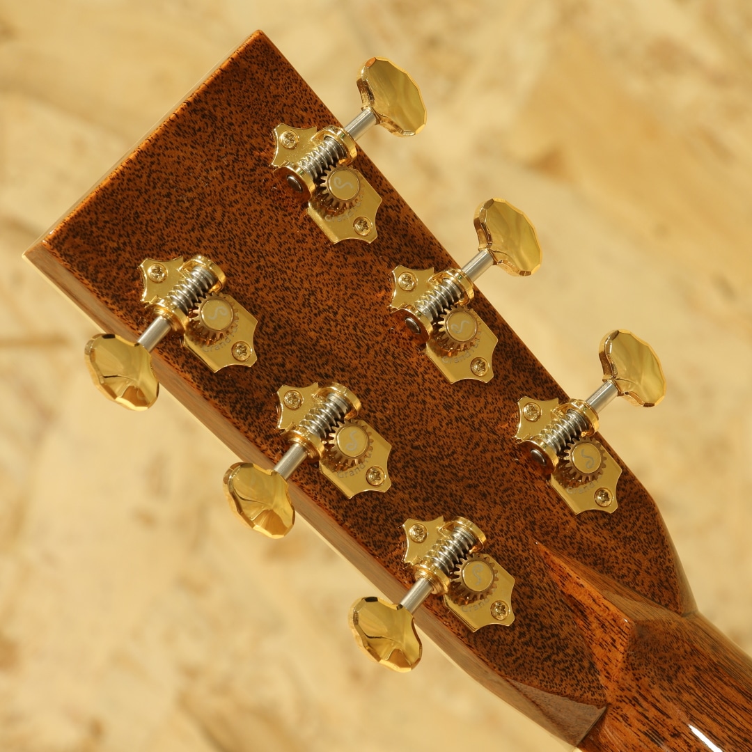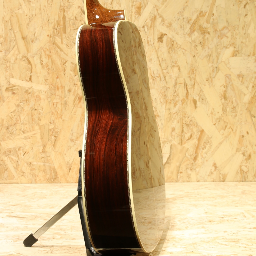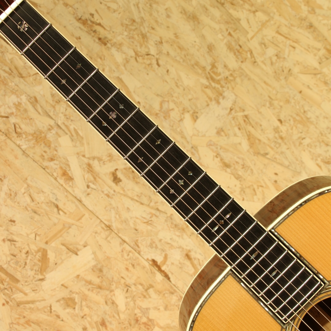 現マーチン工場の中でも、卓越した技術と豊富な経験から至極のギターを造り出す"Martin Custom Shop"。レギュラーラインとは全く異なった環境、工程にて製作。工場の一角に専用の区画があり、昔ながらの工法を継承しながらより精度の高い製作を行っています。ラインナップ上最高峰と言えるオーセンティックシリーズの製作をはじめ、高い完成度を誇るカスタムモデルを製造するトップクラスの部門です。本器はOM-45のカスタムショップ製”CTM OM-45 Adirondack Spruce Cocobolo”。2018年製のUSED品です。アディロンダックスプルーストップ、ココボロサイド&バック、44.5mmナット幅、ロープロファイルネックシェイプ、ブラックエボニー指板&ブリッジ、ロングサドル、Style45スノウフレイク指板ポジション、アバロンロゼッタ、Schaller GrandTuneゴールドペグ、ベッコウ柄ピックガード、オールドスタイルヘッドロゴ、2wayアジャスタブルロッド、アディロンダックスプルース材によるGEスタイルスキャロップドXブレイシング。スペックやルックスは恐らく1933年頃に製作されていたOM-45をデザインの基にしたと推察されます。ロングサドル、オープンバックペグ、スノーフレイク指板インレイ等30年代を彷彿とさせるルックス。ネックシェイプは44.5mmナット幅にロープロファイルで現行品に比べると若干の肉厚感こそ感じますが、トラディショナルなグリップ感を再現そこにGEブレイシングとアディロントップの黄金の組み合わせ。ココボロによって重厚さやレンジ感を獲得することで濃密なサウンドを生み出してくれます。更にカスタムショップ製ともなると緻密な木工精度や組み込み精度を誇り、このラインで作られるだけで音の解像度と情報量が増えるのも特徴。クリアな響き、凛としたトーン、そして爪弾いた際に音が溢れ出すようなキメの細かい倍音感。繊細なだけでなく基本となる音色の太さも備え、死角の無さを感じさせる上質な1本です。ヘッドに弦交換の際に金属粉が僅か擦れたような跡やボディ表面に極々薄い線キズが僅か見られますが、ぱっと見で新品と見紛うほどキレイな状態をキープされた極上のUSED品。ネックのコンディションも抜群の状態に保たれ、非常に演奏しやすい1本。オーセンティックに近しいコンセプトで製作が行われたカスタムショップ製OM45。現行Martinの最高峰チームが作り上げる、至極のサウンドを体感できる1本。是非お試し下さいませ。