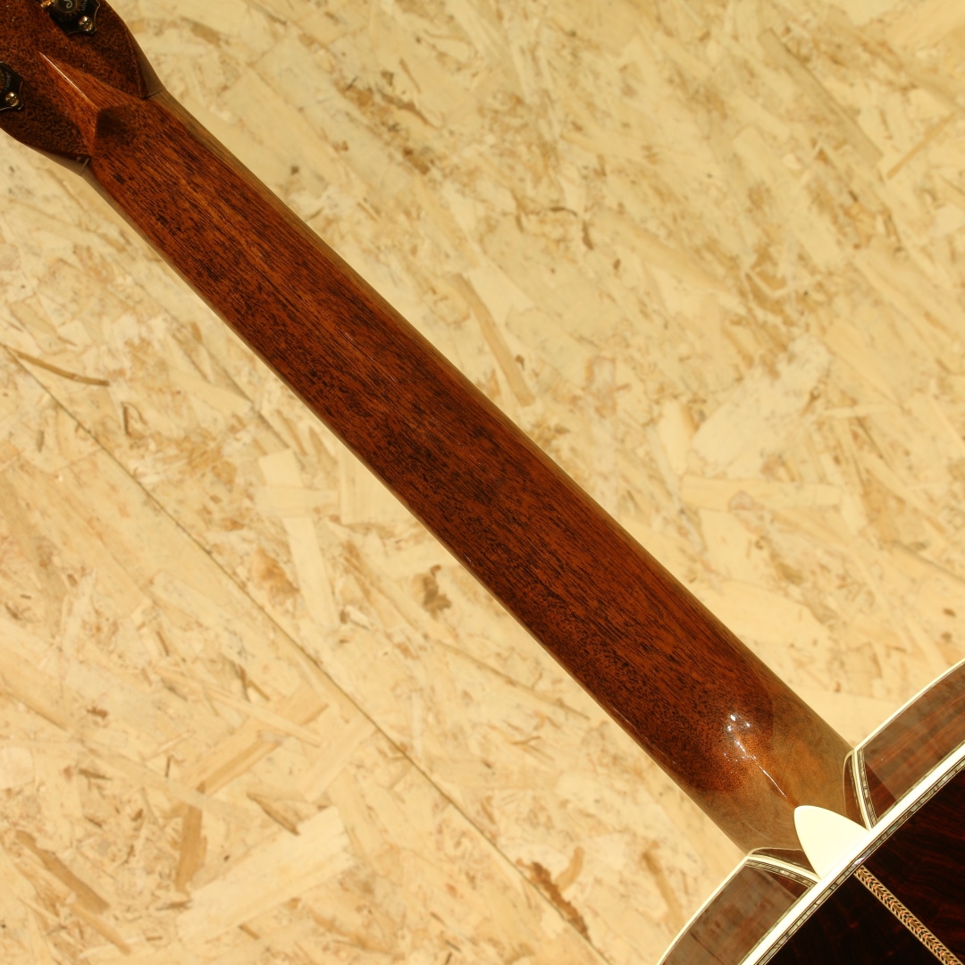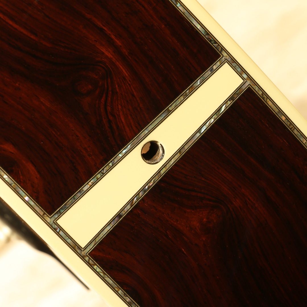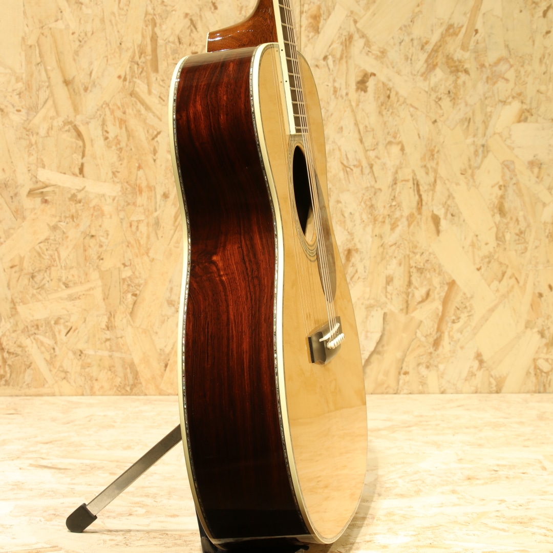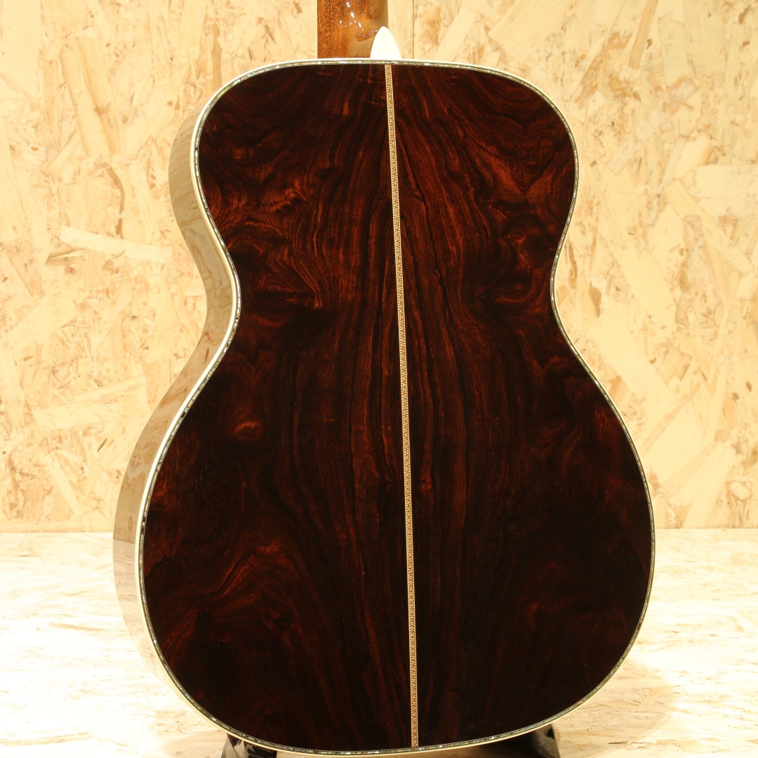 現マーチン工場の中でも、卓越した技術と豊富な経験から至極のギターを造り出す"Martin Custom Shop"。レギュラーラインとは全く異なった環境、工程にて製作。工場の一角に専用の区画があり、昔ながらの工法を継承しながらより精度の高い製作を行っています。ラインナップ上最高峰と言えるオーセンティックシリーズの製作をはじめ、高い完成度を誇るカスタムモデルを製造するトップクラスの部門です。本器はOM-45のカスタムショップ製”CTM OM-45 Adirondack Spruce Cocobolo”。2018年製のUSED品です。アディロンダックスプルーストップ、ココボロサイド&バック、44.5mmナット幅、ロープロファイルネックシェイプ、ブラックエボニー指板&ブリッジ、ロングサドル、Style45スノウフレイク指板ポジション、アバロンロゼッタ、Schaller GrandTuneゴールドペグ、ベッコウ柄ピックガード、オールドスタイルヘッドロゴ、2wayアジャスタブルロッド、アディロンダックスプルース材によるGEスタイルスキャロップドXブレイシング。スペックやルックスは恐らく1933年頃に製作されていたOM-45をデザインの基にしたと推察されます。ロングサドル、オープンバックペグ、スノーフレイク指板インレイ等30年代を彷彿とさせるルックス。ネックシェイプは44.5mmナット幅にロープロファイルで現行品に比べると若干の肉厚感こそ感じますが、トラディショナルなグリップ感を再現そこにGEブレイシングとアディロントップの黄金の組み合わせ。ココボロによって重厚さやレンジ感を獲得することで濃密なサウンドを生み出してくれます。更にカスタムショップ製ともなると緻密な木工精度や組み込み精度を誇り、このラインで作られるだけで音の解像度と情報量が増えるのも特徴。クリアな響き、凛としたトーン、そして爪弾いた際に音が溢れ出すようなキメの細かい倍音感。繊細なだけでなく基本となる音色の太さも備え、死角の無さを感じさせる上質な1本です。ヘッドに弦交換の際に金属粉が僅か擦れたような跡やボディ表面に極々薄い線キズが僅か見られますが、ぱっと見で新品と見紛うほどキレイな状態をキープされた極上のUSED品。ネックのコンディションも抜群の状態に保たれ、非常に演奏しやすい1本。オーセンティックに近しいコンセプトで製作が行われたカスタムショップ製OM45。現行Martinの最高峰チームが作り上げる、至極のサウンドを体感できる1本。是非お試し下さいませ。