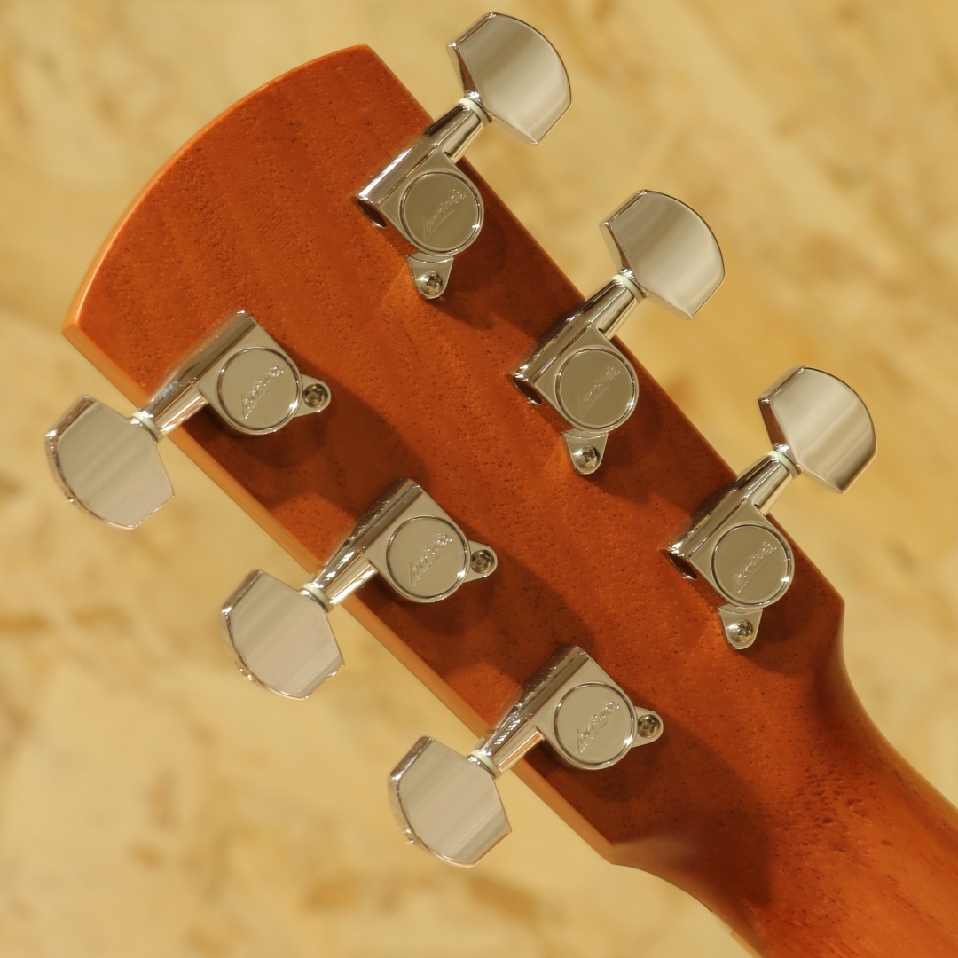 現在はカリフォルニアに建設された工房で生産していますが、ラリビーはもともと鉄弦ギター界にクラシックスタイルのボディを採用した元祖としても知られているカナダの名門。1967年のスタートと長い歴史を持っており、リンダ・マンザー、ウィリアム・ラスキン、サーゲ・ディ・ヤングなどの著名なルシアーも輩出しています。本器はサテン塗装のドレッドモデル、珍しいP.U付モデル”D-03E”。2014年製USED品。スプルーストップ、マホガニーサイド&バック、エボニー指板&ブリッジ、マホガニーネック、トップ構造はラリビー伝統の左右対称Xブレイシング、べっ甲柄ピックガード、オリジナルロトマチッククロームメッキチューナー、メイプルバインディング、オプションにてShadow SH M-Sonic A NFX VTピックアップシステムを搭載。03シリーズは総単板、ダブテイルジョイントを採用しトラディショナルなスタイルを踏襲したモデル群。メイプルバインディングやヘリンボーンロゼッタ、そしてサテン塗装が特徴です。ウッドサプライヤーの側面も持つジーンラリビー氏ならではの良材を使用しており、目の整った材木の美しさがナチュラルに映えます。ラリビー特有の音の芯が太く分離感や粒立ちの良いサウンド、ラリビー独自の左右対称Xブレーシング構造からくるモノなのか非常にバランスの整った出音はそのままに。クラシカルなテイストは他モデルとも共通していますが、より乾いたトーンや落ち着いた響きを獲得しています。そしてこのサイズ特有と言えるパワフルなサウンド。強いタッチには力強く、繊細なタッチにはしなやかに。明るくハキハキと音を出力してくれる為、演奏スタイルを問うことなく扱いやすいドレッドノートモデルです。ピックアップにはShadow SH M-Sonic A NFX VTピックアップシステムを搭載。最新のモノとは素子が異なり、通常のNano Flexとなっています。極薄の独自のセンサーをサドルの下に搭載し、サドルの振動と共にボディトップ面の振動も捉えることが出来るピックアップ。コントローラーはVol,Toneとシンプルな構成。稀にShadow Nano Flexで見られる低音ノイズが乗っている為、ラインサウンドでの使用は厳しいものの、P.Uを載せ替えて使うまたは足元にプリアンプを置いてノッチフィルターでノイズを低減する等工夫する余地はあります。ボディトップ面1弦側のボトム箇所に僅かな当てキズ、サウンドホール1弦側に縁に僅かな弾きキズ、その他サテン塗装で目立ちにくいですが僅かな線キズがバック面に見られる等、若干の使用感こそ見られますが比較的キレイなコンディションを保たれている個体。ネック周りや弦高等は整えられており、演奏性は抜群の状態。上記P.Uのノイズがあるためお買い得な価格となっております。生音で楽しむ分には全く問題無しの為、P.U無しをお探しだった方にはオススメできる1本です。前述の通りウッドサプライヤーとしての顔も持つジーンラリビー本人が世界中を飛び回ってセレクトした上質の素材と、洗練された木工技術から成るドライな音色。是非お手元でご体感下さいませ。