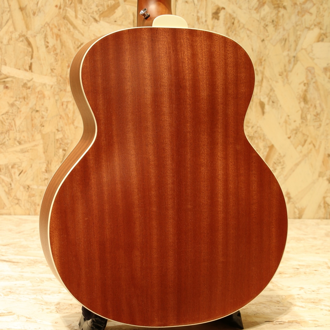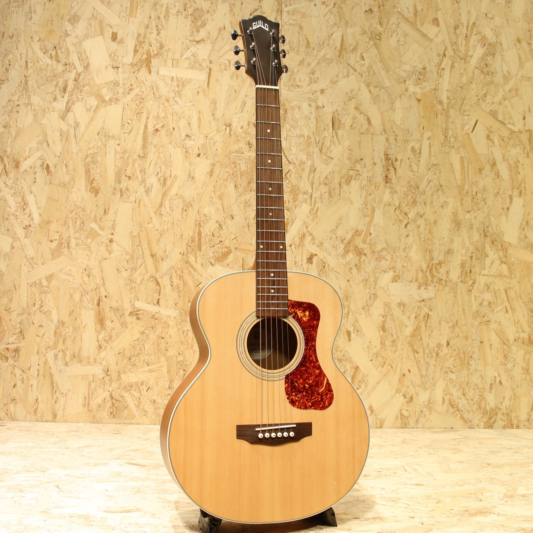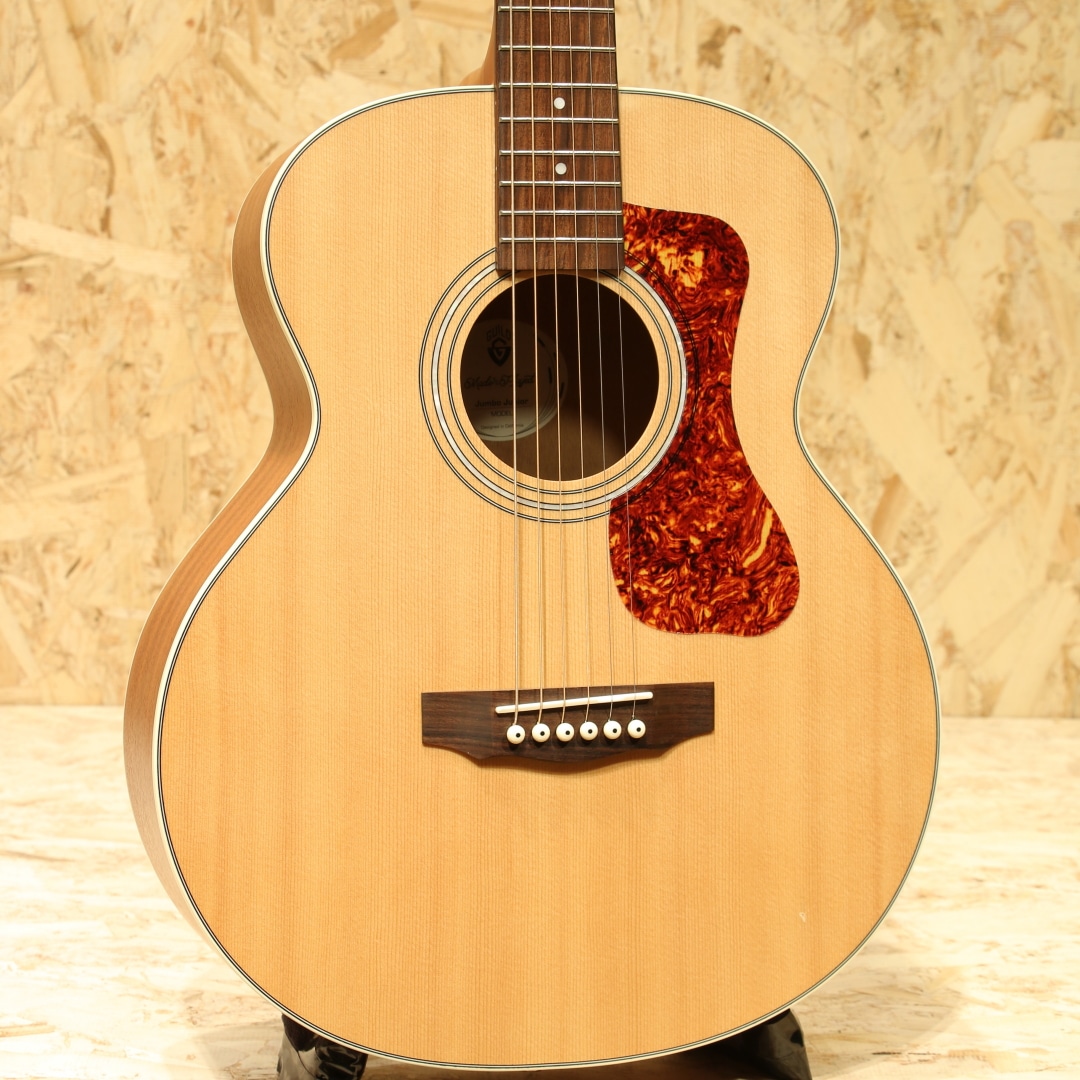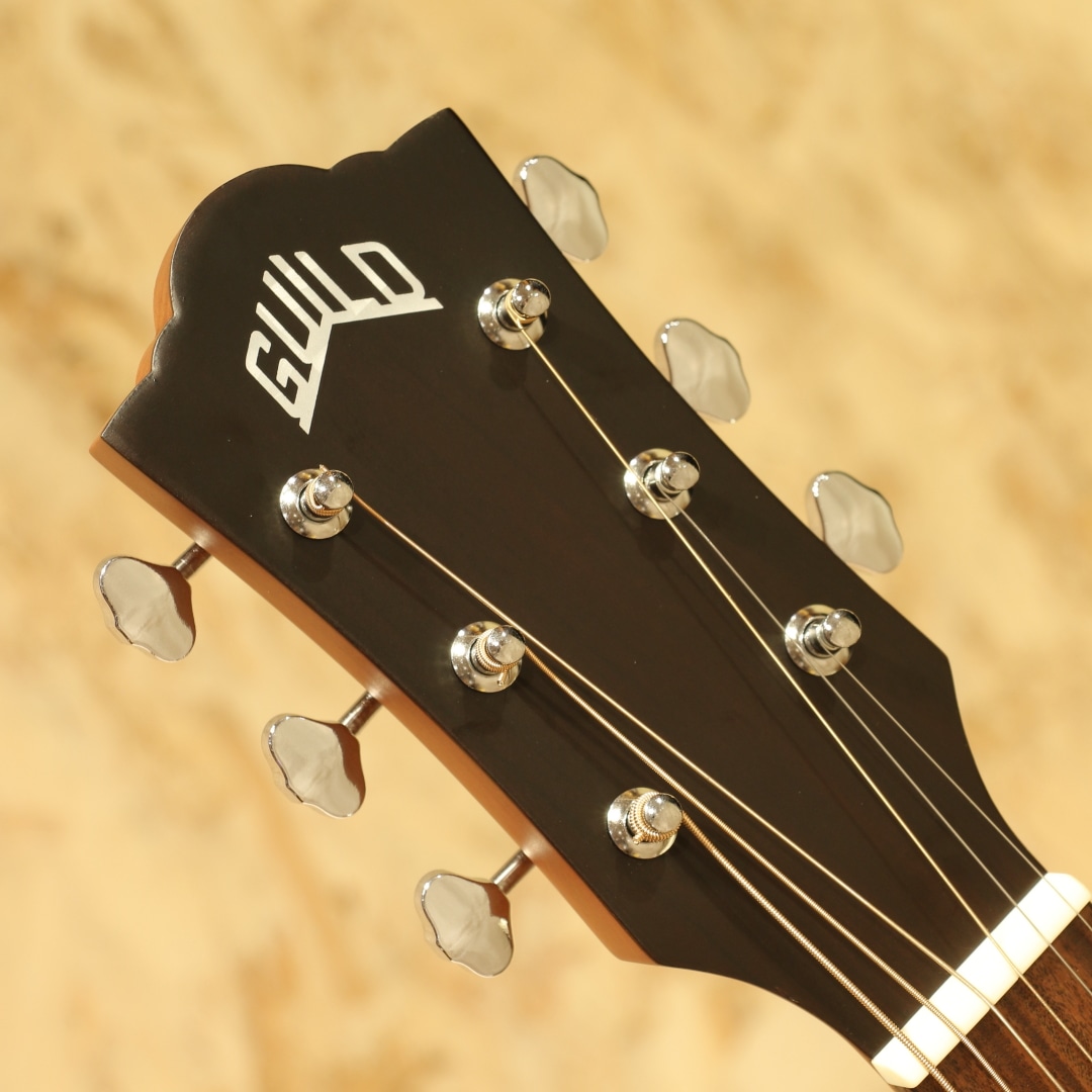 古くはマーティンやギブソンと並んで御三家と呼ばれていたブランド”ギルド”。現在でも製造を行っており、リーズナブルなモデルから伝統的なフラッグシップモデルまで幅広くラインナップするファンの多いブランドです。本器はギルド伝統のジャンボサイズをコンパクトにしたエレアコ”Jumbo Junior Mahogany”。シトカスプルース単板トップ、マホガニーサイド&アーチバック、マホガニーネック、パーフェロー指板&ブリッジ、オープンバックニッケルペグ、スキャロップドXブレーシング。Westerly Collectionシリーズはギルドの黄金時代であるロードアインランド州ウェスタリー工場で手掛けられたギターにインスパイアされたデザインを持つモデル群。本器はギルドの伝統的なジャンボシェイプを継承しつつ、コンパクトにダウンサイジングされたモデル。こちらもギルド伝統のアーチバック仕様を持ち、リーズナブルでコンパクトでも本格派な仕様を持つモデルです。何よりこのコンパクトさから持ち運び易さと抱えやすさに優れており、入門の方からサブギターをお探しの方までフィットする守備範囲の広さを持ちます。そして小柄な分のマイナスイメージを感じさせず、十分なボリューム感、暖かみを感じさせる響き、明るく歯切れのよいサウンド、乾いたトーンが魅力のギターです。ピックアップも搭載されており、Fishman製のGT-1を搭載。アンダーサドルピエゾで音の芯を捉えたサウンドを出力してくれる為、弾き語りからバンドの中での演奏まで幅広くこなせるオールラウンダーなシステムです。ボディトップ面の下側に硬いものが当たってしまったような当てキズが見られるのが惜しい点。その他には艶消しのサテン塗装の為キズ等は目立たず、非常にキレイな状態を保たれたUSED品。ネック周りの演奏性も問題なく、押さえやすい弦高や薄く弾きやすいネックシェイプで存分に演奏を楽しめる1本です。抱えやすさが魅力のサイズ感、小柄な方の1本目、移動する際に楽なギターとして、そしてステージで使うエレアコとして、多用途に使えるサイズ感のギターです。アコギらしい伝統的なルックスを備えた扱いやすい1本。是非お手元でお楽しみください。