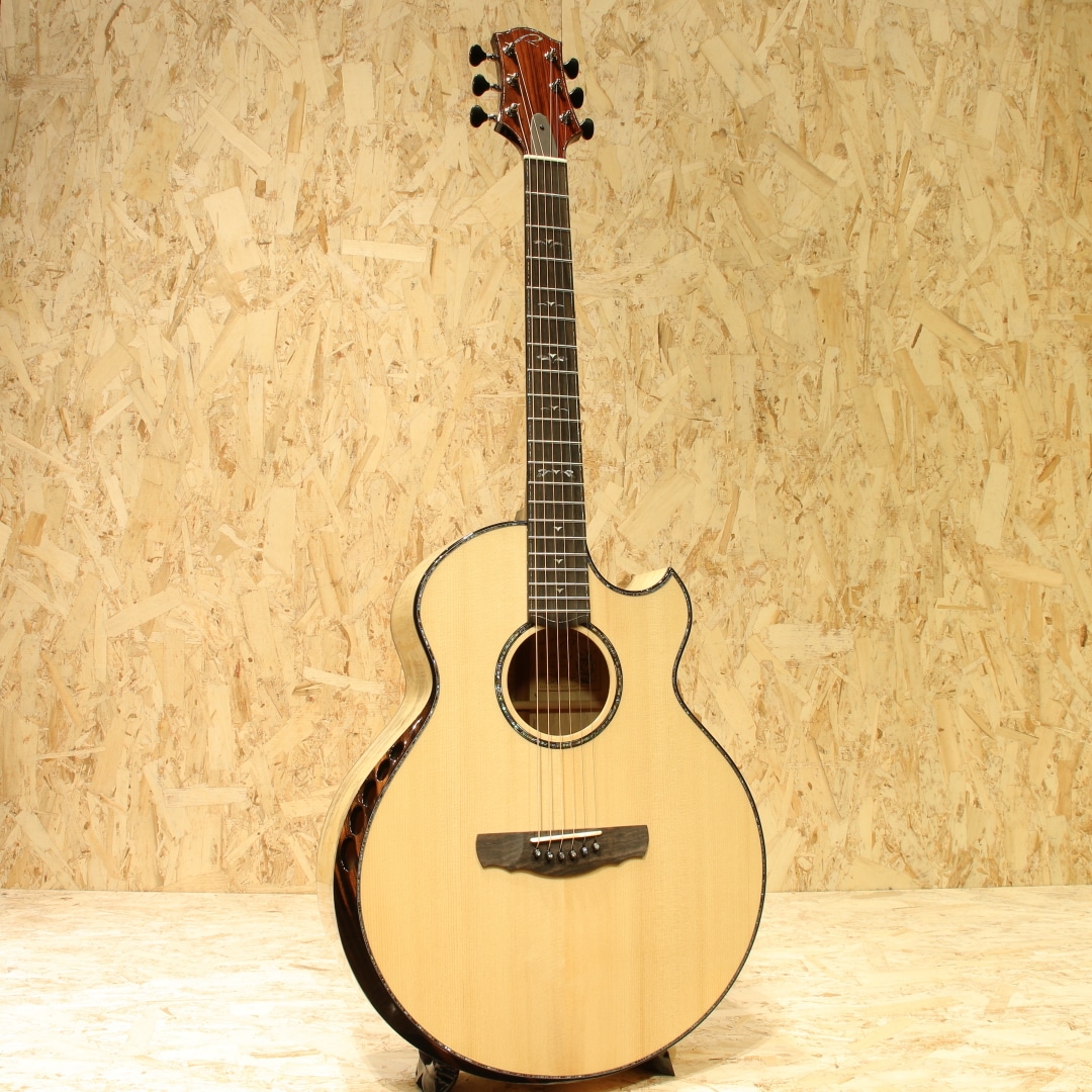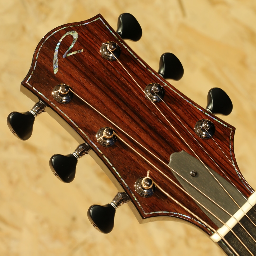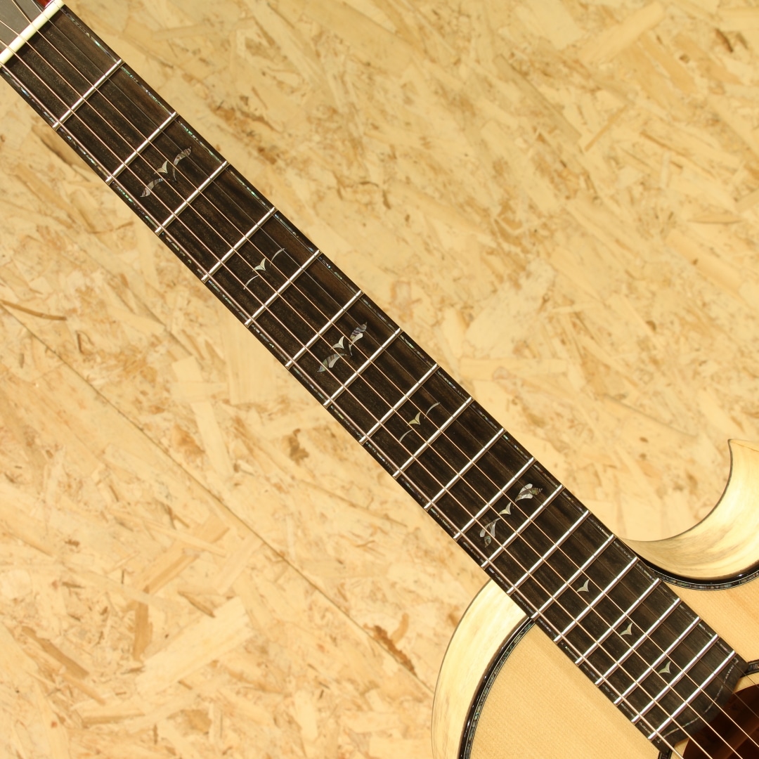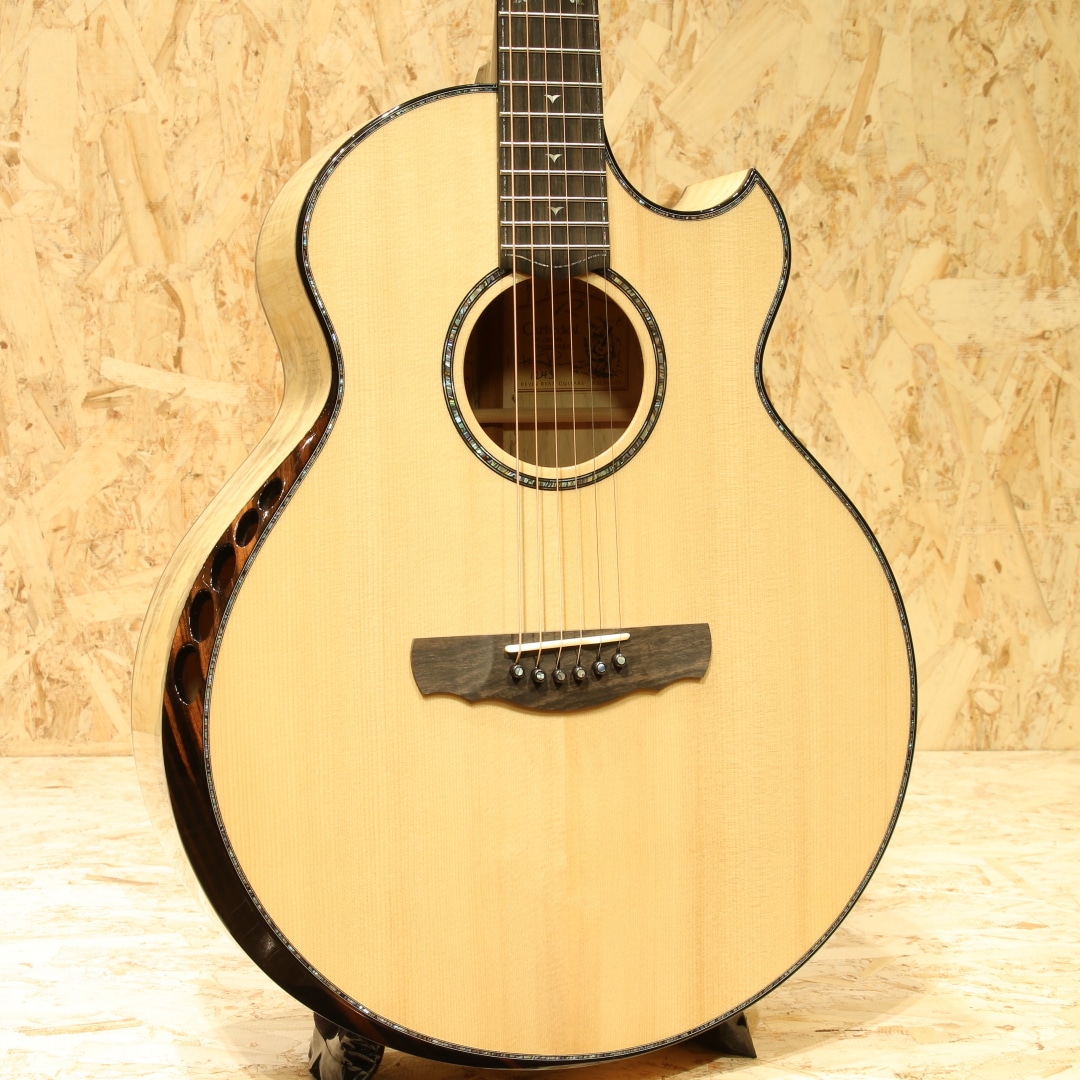 約40年近くのキャリアを持ち人気・実力共にアメリカを代表するルシアーのひとり、ケビン・ライアン。彼は前職が航空機開発研究という異色の経歴を持ちます。ギター製作においては1987年にファーストギターの試作に取り掛かりました。昼間は遷音速風洞試験用のジェット戦闘機の模型を製作し、夜遅くまでギター製作に励むというキャリアからスタート。芸術と工学を融合させた彼のセンスはギター業界において大きな影響を与えました。現在はカリフォルニアの工房にてケビンを含む5人のスペシャルなチームを組んで製造、バックオーダーも多く米国では指折りのルシアーとして挙げられる人気のブランドです。本器は”Cathedral Grand Fingerstyle”。11.00インチ(27.94cm)Upper Bout / 16.75” (42.545cm)Lower Boutボディーサイズ、フローレンタインカッタウェイ、Extended 25.7" (652.78mm)Scale Length。厳選されたアディロンダックスプルーストップ、美しいスパイダーグレインのスポルテッドタマリンドサイド&バック。シックなトーンのグラデーションでフィニッシュされた1Pマホガニーネック、エボニー指板&ブリッジ、R文字入りゴトーSuper 510ブラッククロームエボノイドボタンチューナー、ブルーパウア指板インレイ、ブルーパウアロゼッタ。タヒチアンパールトップ&サイド&バックパーフリング、ブルーパウアヘッドトップトリム、丸みのあるロウワバウトに”ライアンベベル"と称されるアームレスト加工を備えたこのフォルムは元祖と呼べるもので彼ならではのセンスある美しいルックス。オリジナルのスキャロップドEOブレイシング、ハチの巣型の独自のブリッジプレートAcoustic Honeycomb。とても軽くかつ極めて高い強度を持つ構造のブリッジプレートで一部ブレイシングを省く役割を持っています。RYANはサウンドボード(トップ)と弦の張力との割合の研究を長年重ねており、トップへの強度とサウンドを抑制するブレイシングとのバランスをこのAcoustic Honeycombで解決しています。このアイディアはハチの巣からインスパイアを実際受けたものでもあり、航空工学の中でもネイチャーなモノからヒントを得て実用化されている事から頷けるストーリーです。太くディープで艶やか伸びのある響き。芯がしっかりとし埋もれない響きながら、ソリッドな感触でなく奥深く響くサウンド。アタックはドライブ感がありレスポンスもよく、また耳当たりの良いダイナミクスレンジは楽器を生で弾く楽しさを味あわせてくれます。サイズはあるもののフィンガリングのタッチ感で十分に反応するトーン、ピックでのシングルノートやストロークでもそのポテンシャルの高さを魅せてくれる本器。ロープロファイルネックは独自のマイクロアジャスタブル・トラスロッド・システムにより、極めて安定しながらもスリムなネック形状を実現。少し厚胴のボディもベベルのお陰で違和感なく収まりが良く体にフィット。その振動をダイレクトに伝えてくれます。国内では流通がなく、弊社が現地まで出向きオーダーを進めています。美しい仕上がりとサウンドを是非この機会にご体感ください。オリジナルカールトンケース付属。