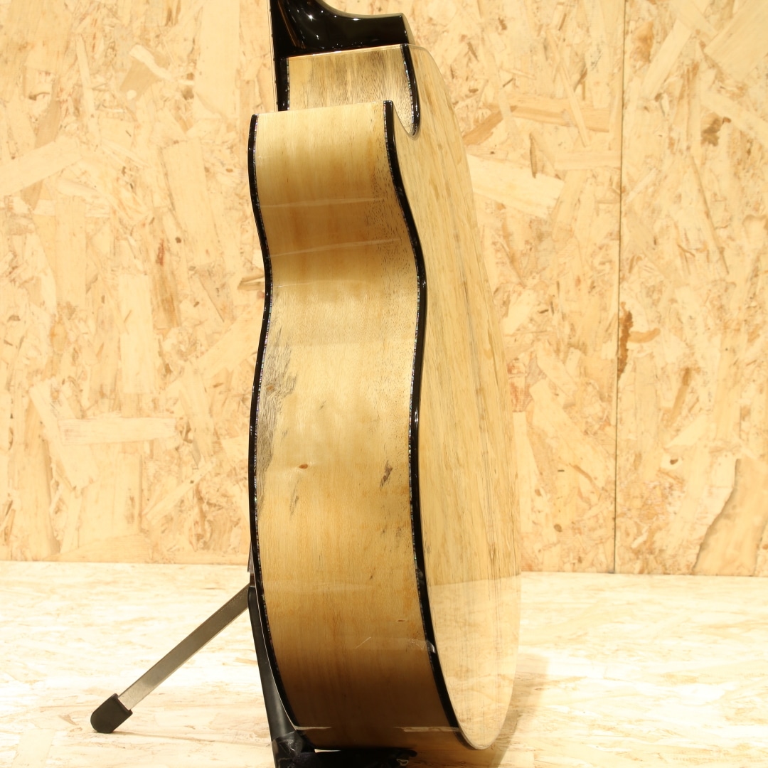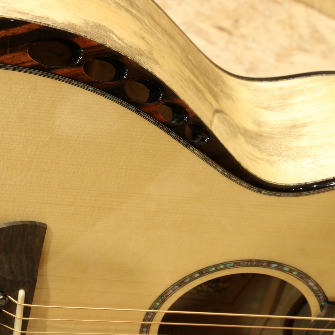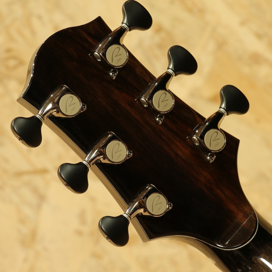 約40年近くのキャリアを持ち人気・実力共にアメリカを代表するルシアーのひとり、ケビン・ライアン。彼は前職が航空機開発研究という異色の経歴を持ちます。ギター製作においては1987年にファーストギターの試作に取り掛かりました。昼間は遷音速風洞試験用のジェット戦闘機の模型を製作し、夜遅くまでギター製作に励むというキャリアからスタート。芸術と工学を融合させた彼のセンスはギター業界において大きな影響を与えました。現在はカリフォルニアの工房にてケビンを含む5人のスペシャルなチームを組んで製造、バックオーダーも多く米国では指折りのルシアーとして挙げられる人気のブランドです。本器は”Cathedral Grand Fingerstyle”。11.00インチ(27.94cm)Upper Bout / 16.75” (42.545cm)Lower Boutボディーサイズ、フローレンタインカッタウェイ、Extended 25.7" (652.78mm)Scale Length。厳選されたアディロンダックスプルーストップ、美しいスパイダーグレインのスポルテッドタマリンドサイド&バック。シックなトーンのグラデーションでフィニッシュされた1Pマホガニーネック、エボニー指板&ブリッジ、R文字入りゴトーSuper 510ブラッククロームエボノイドボタンチューナー、ブルーパウア指板インレイ、ブルーパウアロゼッタ。タヒチアンパールトップ&サイド&バックパーフリング、ブルーパウアヘッドトップトリム、丸みのあるロウワバウトに”ライアンベベル"と称されるアームレスト加工を備えたこのフォルムは元祖と呼べるもので彼ならではのセンスある美しいルックス。オリジナルのスキャロップドEOブレイシング、ハチの巣型の独自のブリッジプレートAcoustic Honeycomb。とても軽くかつ極めて高い強度を持つ構造のブリッジプレートで一部ブレイシングを省く役割を持っています。RYANはサウンドボード(トップ)と弦の張力との割合の研究を長年重ねており、トップへの強度とサウンドを抑制するブレイシングとのバランスをこのAcoustic Honeycombで解決しています。このアイディアはハチの巣からインスパイアを実際受けたものでもあり、航空工学の中でもネイチャーなモノからヒントを得て実用化されている事から頷けるストーリーです。太くディープで艶やか伸びのある響き。芯がしっかりとし埋もれない響きながら、ソリッドな感触でなく奥深く響くサウンド。アタックはドライブ感がありレスポンスもよく、また耳当たりの良いダイナミクスレンジは楽器を生で弾く楽しさを味あわせてくれます。サイズはあるもののフィンガリングのタッチ感で十分に反応するトーン、ピックでのシングルノートやストロークでもそのポテンシャルの高さを魅せてくれる本器。ロープロファイルネックは独自のマイクロアジャスタブル・トラスロッド・システムにより、極めて安定しながらもスリムなネック形状を実現。少し厚胴のボディもベベルのお陰で違和感なく収まりが良く体にフィット。その振動をダイレクトに伝えてくれます。国内では流通がなく、弊社が現地まで出向きオーダーを進めています。美しい仕上がりとサウンドを是非この機会にご体感ください。オリジナルカールトンケース付属。