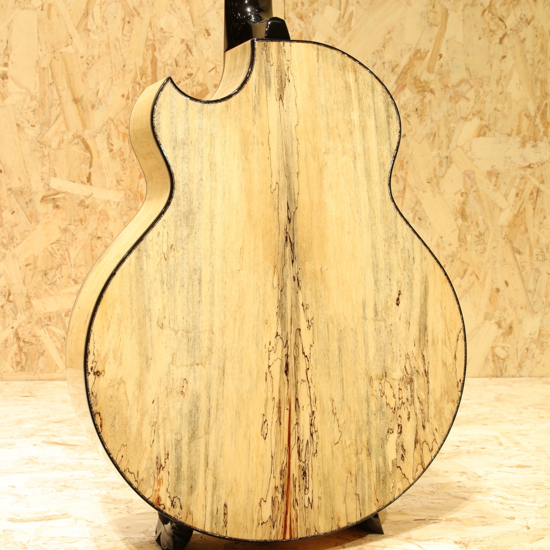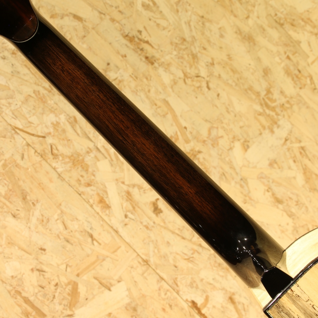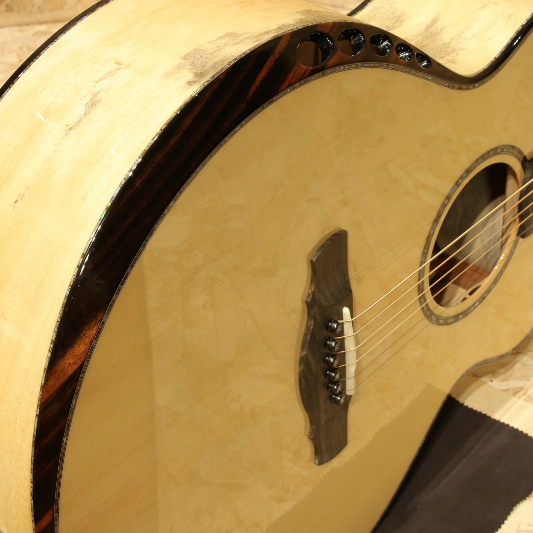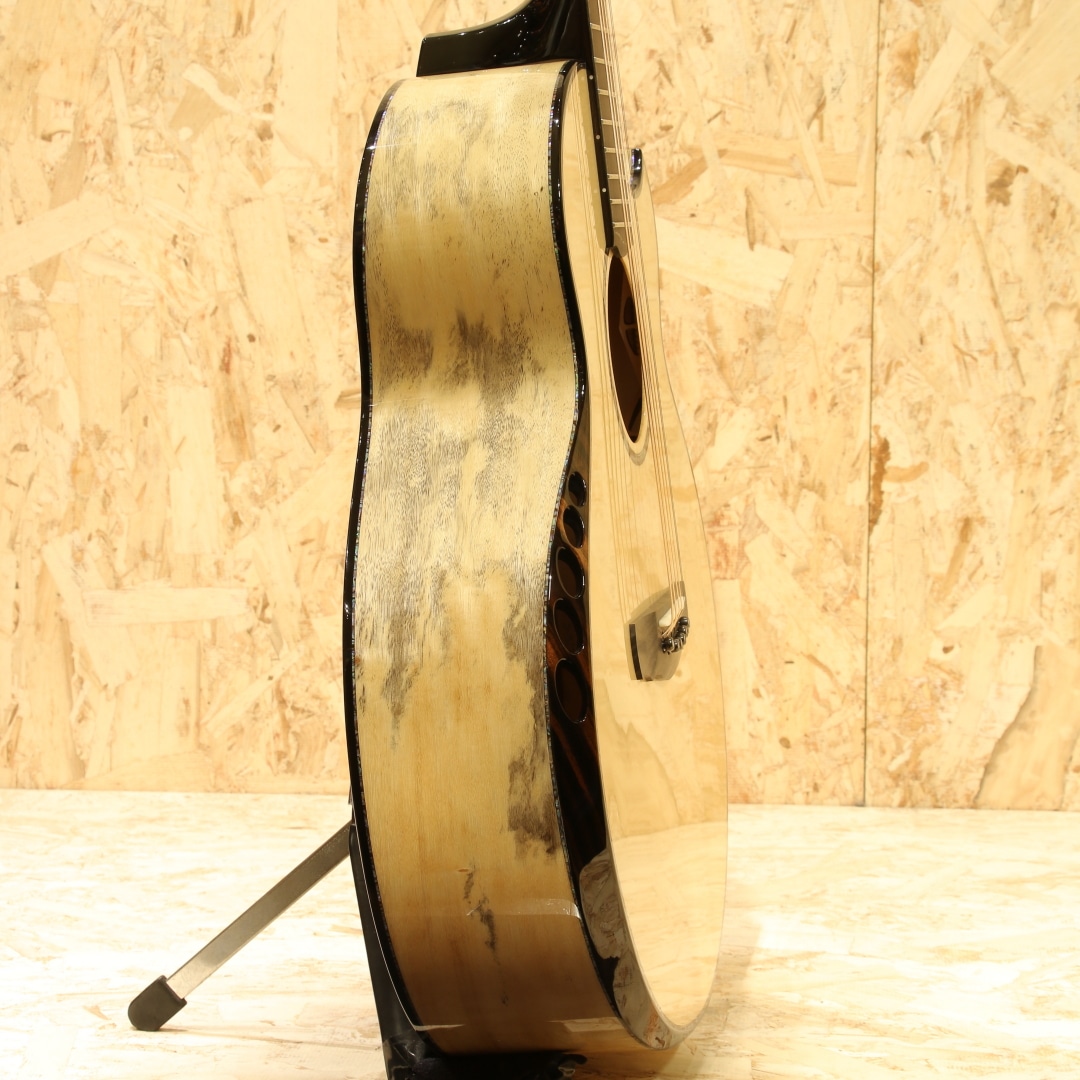 約40年近くのキャリアを持ち人気・実力共にアメリカを代表するルシアーのひとり、ケビン・ライアン。彼は前職が航空機開発研究という異色の経歴を持ちます。ギター製作においては1987年にファーストギターの試作に取り掛かりました。昼間は遷音速風洞試験用のジェット戦闘機の模型を製作し、夜遅くまでギター製作に励むというキャリアからスタート。芸術と工学を融合させた彼のセンスはギター業界において大きな影響を与えました。現在はカリフォルニアの工房にてケビンを含む5人のスペシャルなチームを組んで製造、バックオーダーも多く米国では指折りのルシアーとして挙げられる人気のブランドです。本器は”Cathedral Grand Fingerstyle”。11.00インチ(27.94cm)Upper Bout / 16.75” (42.545cm)Lower Boutボディーサイズ、フローレンタインカッタウェイ、Extended 25.7" (652.78mm)Scale Length。厳選されたアディロンダックスプルーストップ、美しいスパイダーグレインのスポルテッドタマリンドサイド&バック。シックなトーンのグラデーションでフィニッシュされた1Pマホガニーネック、エボニー指板&ブリッジ、R文字入りゴトーSuper 510ブラッククロームエボノイドボタンチューナー、ブルーパウア指板インレイ、ブルーパウアロゼッタ。タヒチアンパールトップ&サイド&バックパーフリング、ブルーパウアヘッドトップトリム、丸みのあるロウワバウトに”ライアンベベル"と称されるアームレスト加工を備えたこのフォルムは元祖と呼べるもので彼ならではのセンスある美しいルックス。オリジナルのスキャロップドEOブレイシング、ハチの巣型の独自のブリッジプレートAcoustic Honeycomb。とても軽くかつ極めて高い強度を持つ構造のブリッジプレートで一部ブレイシングを省く役割を持っています。RYANはサウンドボード(トップ)と弦の張力との割合の研究を長年重ねており、トップへの強度とサウンドを抑制するブレイシングとのバランスをこのAcoustic Honeycombで解決しています。このアイディアはハチの巣からインスパイアを実際受けたものでもあり、航空工学の中でもネイチャーなモノからヒントを得て実用化されている事から頷けるストーリーです。太くディープで艶やか伸びのある響き。芯がしっかりとし埋もれない響きながら、ソリッドな感触でなく奥深く響くサウンド。アタックはドライブ感がありレスポンスもよく、また耳当たりの良いダイナミクスレンジは楽器を生で弾く楽しさを味あわせてくれます。サイズはあるもののフィンガリングのタッチ感で十分に反応するトーン、ピックでのシングルノートやストロークでもそのポテンシャルの高さを魅せてくれる本器。ロープロファイルネックは独自のマイクロアジャスタブル・トラスロッド・システムにより、極めて安定しながらもスリムなネック形状を実現。少し厚胴のボディもベベルのお陰で違和感なく収まりが良く体にフィット。その振動をダイレクトに伝えてくれます。国内では流通がなく、弊社が現地まで出向きオーダーを進めています。美しい仕上がりとサウンドを是非この機会にご体感ください。オリジナルカールトンケース付属。