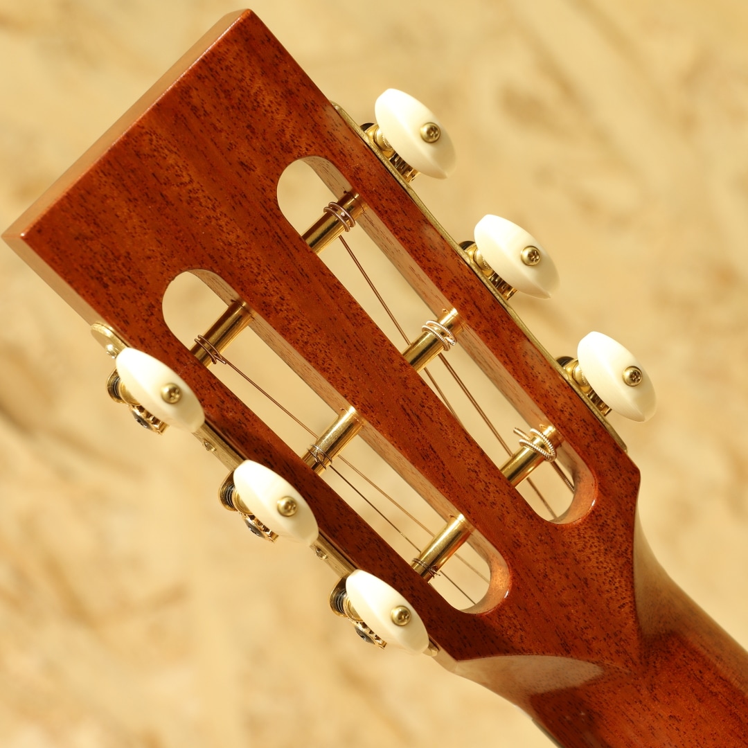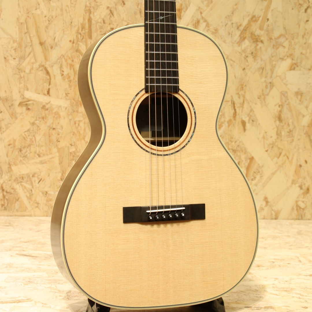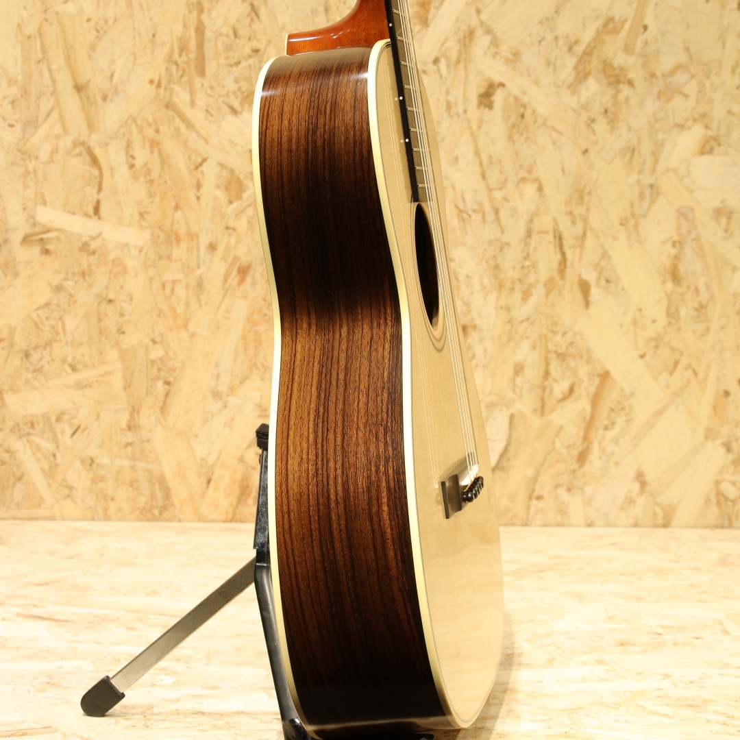 岐阜県可児市に工場を構える純国産老舗ブランドのヤイリギター。K.Yairiのブランドネイムで広く知られ、多くの国内外の著名アーティストにも愛用される日本が誇るファクトリーブランドの一つです。本器はショップオーダーのカスタム品、NY-120Vをベースとした”NY-120V SG CTM”。2025年製USED品です。シトカスプルーストップ、インディアンローズウッドサイドバック、マホガニーネック、エボニー指板&ブリッジ、アバロン&ウッドロゼッタ、アイボロイドバインディング、12フレットにのみスノーフレイク指板ポジション、ゴトー製35P1800-2Mペグ、スキャロップドXブレイシング。通常のNY-120Vとの仕様変更点は、ルックスはそのままにナット幅が44mmから45mmに、スケールは609mmから630mmに変更。12フレットジョイントながらスケールが長くなった事でテンション感も確保されより立ち上がりの早く歯切れの良いサウンドを奏でてくれます。ニューヨーカースタイルのギターは小柄で抱えやすいサイズ感、丸みを帯びた可愛らしいルックスにより演奏スタイルを選ばないギターへと進化しています。このサイズ感は抱えやすい点や疲れにくい点が大きなメリット。肩肘張らずに演奏が出来る、小回りが利くために気が付くとつい持ってしまっている方が多いことも頷けるサイズ感です。音の立ち上がりは早く、小柄なサイズ特有とも言える音の密度。キンキンするようなことはなく、シャランと上品な音色で音の解像度も高く、煌びやかなサウンドを響かせてくれます。バフ跡程度の擦れキズが光にかざせばわずかに視認できる程度と使用感は少ない状態を保たれている個体。ネックのコンディションも整えられ、ストレートな状態且つ弾きやすい弦高へとセットアップされています。プレイスタイルを問わない演奏性と抱えやすいサイズ感も相まり、ふと手に取り弾いてしまう魅力を持った1本。国産ならではの安心感を体現した1本。ぜひお手に取ってお楽しみください。オリジナルハードケースが付属します。