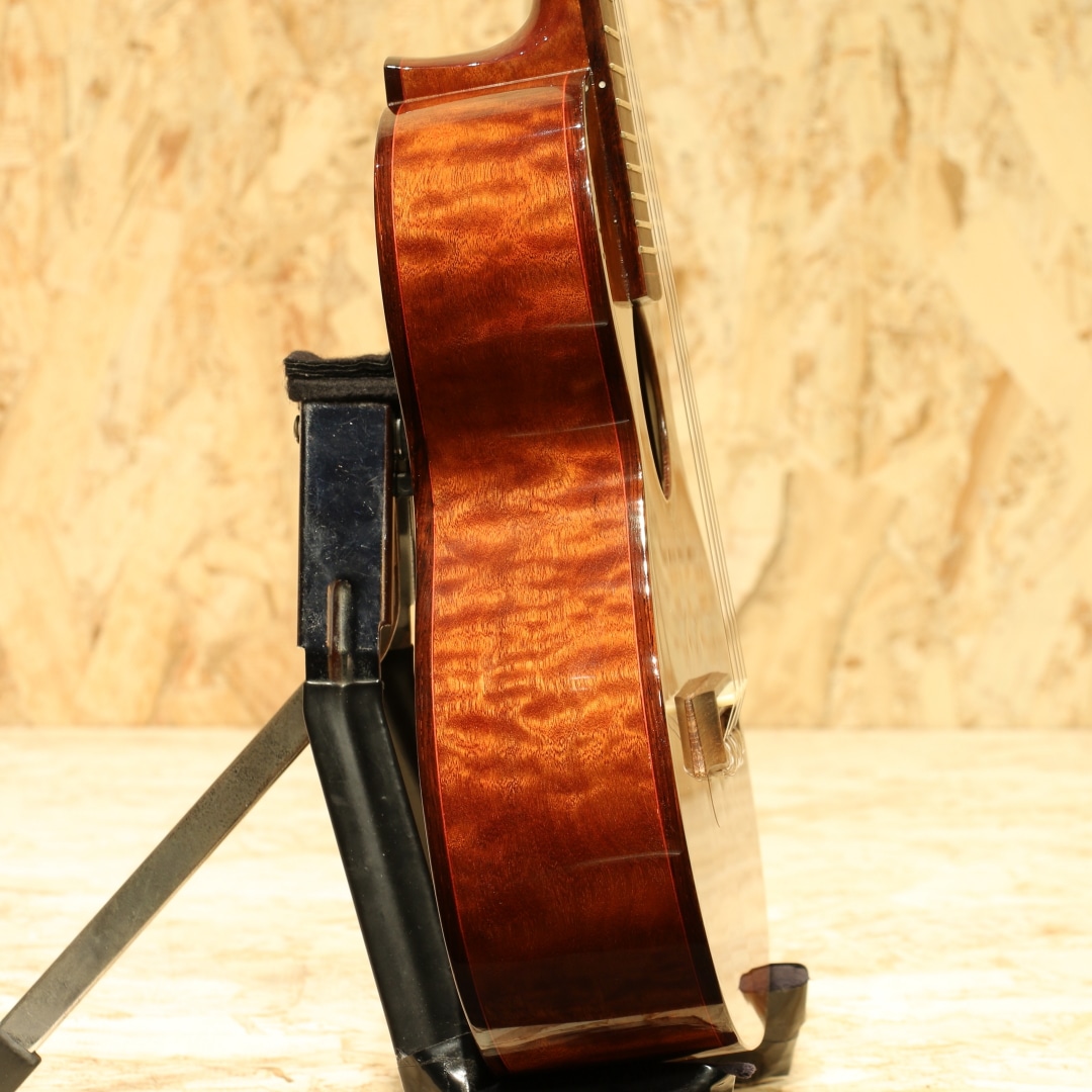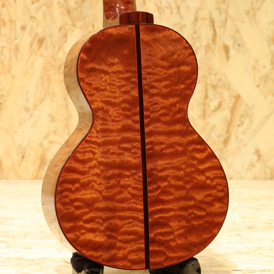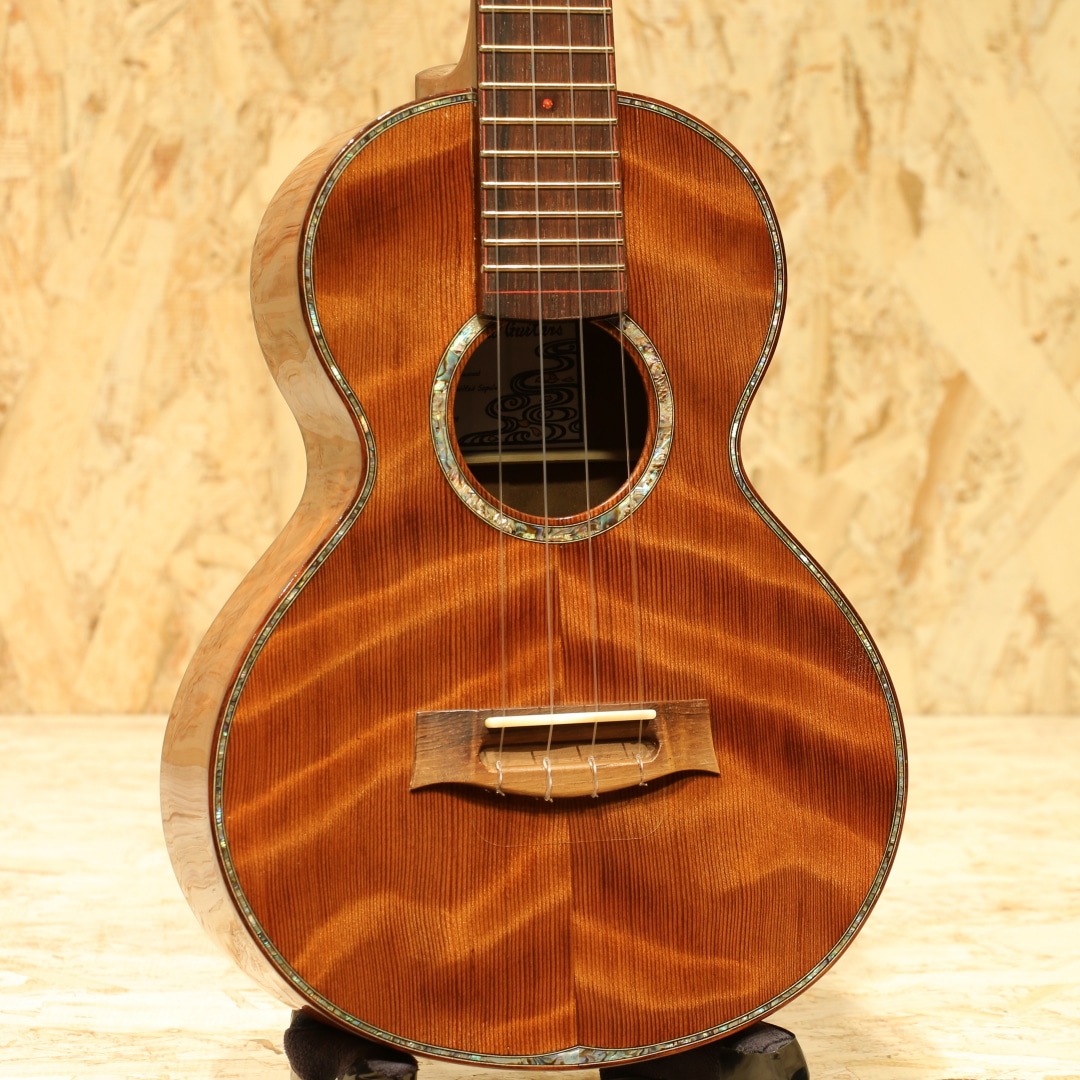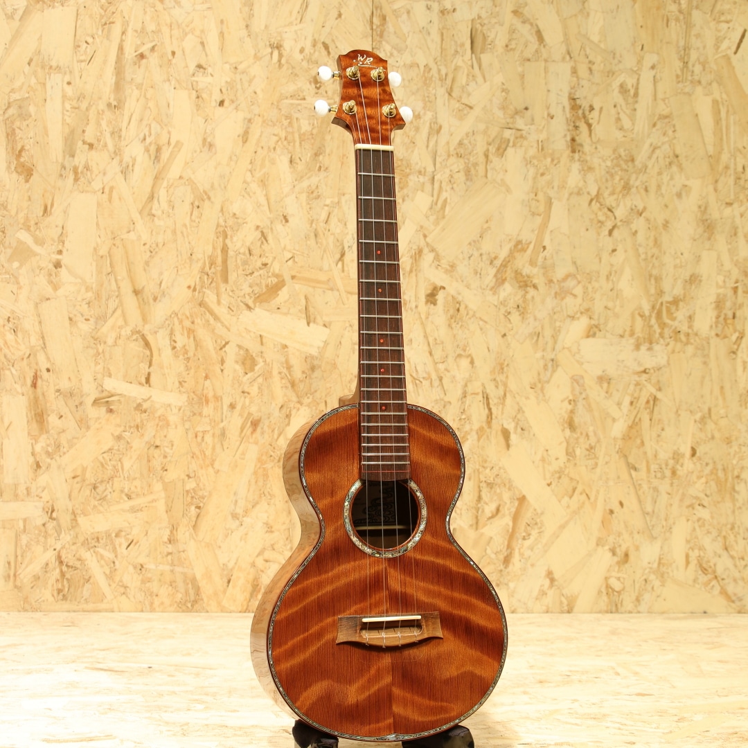 群馬にて増田明夫氏が製作する"Water Road Guitars"は、"音、弾きやすさ、デザインへのこだわり"を概念にオンリーワンのカスタムを製作しています。極上マテリアルを最大限に活かし、フィンガーピッキングに特化したギターを追求、稀代の天才が造り出す日本が誇るギタールシアーです。本器は、そんな増田氏が造る"Tenor Ukulele"モデル。2021年製USED品。ギター造りのノウハウを活かし作られた本器は、溢れる倍音と美しい響きを持つ逸品。また、膨大な極上木材を保有する増田氏ならではの美しいマテリアルを惜しげも無く使用し作られた1本。トップには波のように揺らめく杢が美しいカーリーレッドウッド、サイド&バックには浮き出るような玉杢が魅力の上質なキルテッドサペリを使用。ネック材にも同等のキルテッドサペリが使用されています。マダガスカルローズウッド指板&ブリッジ、ゴールドゴトー510H.A.Pペグ、キルテッドサペリ天神板、ディクロラム指板ドットインレイ、アバロンロゼッタ、マダガスカルローズウッドバインディング、アバロンパフリング。レッドウッド&キルテッドサペリの本器は、弾性を持つハリのあるスプルーストップに比べてサウンドレンジに長けた澄み切ったクリアな音色が特徴的で、高音まで美しい響きを持ち合わせます。サペリ特有の硬すぎない歯切れの良さも持ち、他ブランドではなかなか味わえないサウンドを体感できる1本。テナー独特の音域レンジと増田氏の造りによるしっかりとした発音・音量は、ウクレレ以上のスケール感を感じさせてくれます。また、ウクレレとは思えないロングサスティンを持つ本器は低音から高音域まで均一に美しく、弾き手・聴き手を魅了します。トップ面1弦側指板横に杢目に沿ったクラックが見られますがしっかりと修正済です。ネックヒールやバインディングの継ぎ目箇所に僅かな塗装浮きが見られますが、表層面のみですのでご使用への影響はありません。その他特筆すべき使用感は無く、ネック&プレイ状態は良好、全体的に整えられたコンディションが保たれた1本。ブリッジ下部には弦飛び防止のクリアガードを標準装備。出回りの少ない氏ならではの美事なウクレレモデルを、是非このご機会にご体感ください。汎用セミハードケースが付属します。
