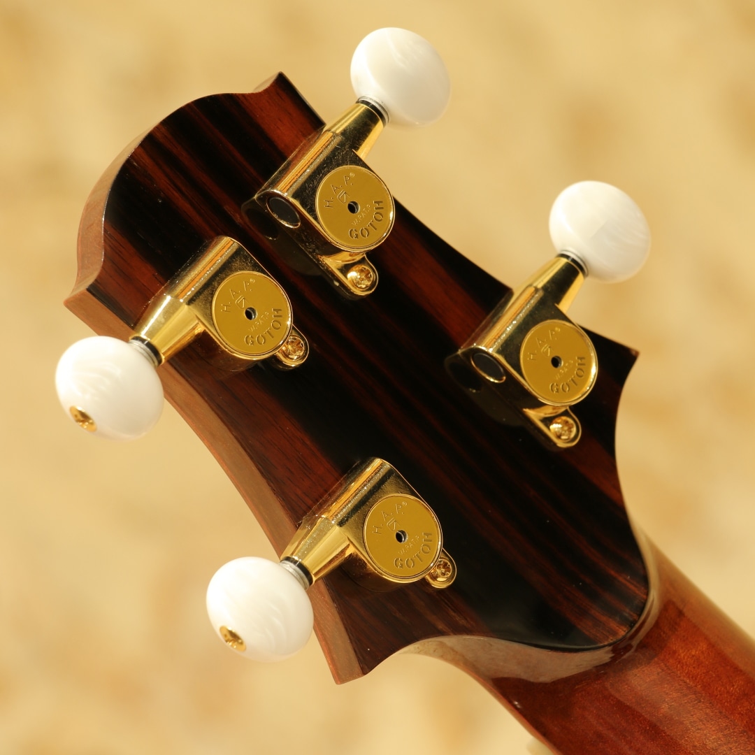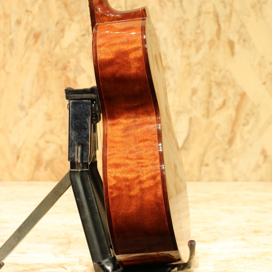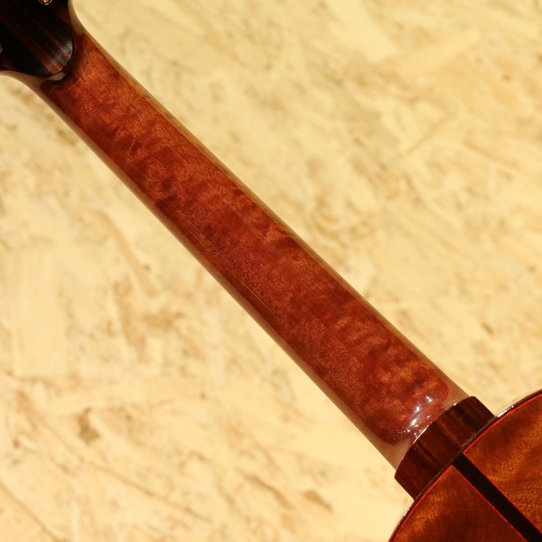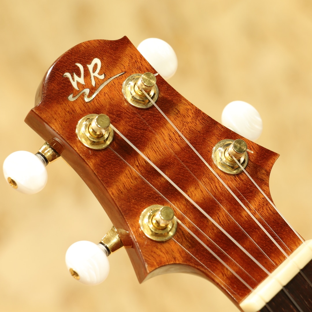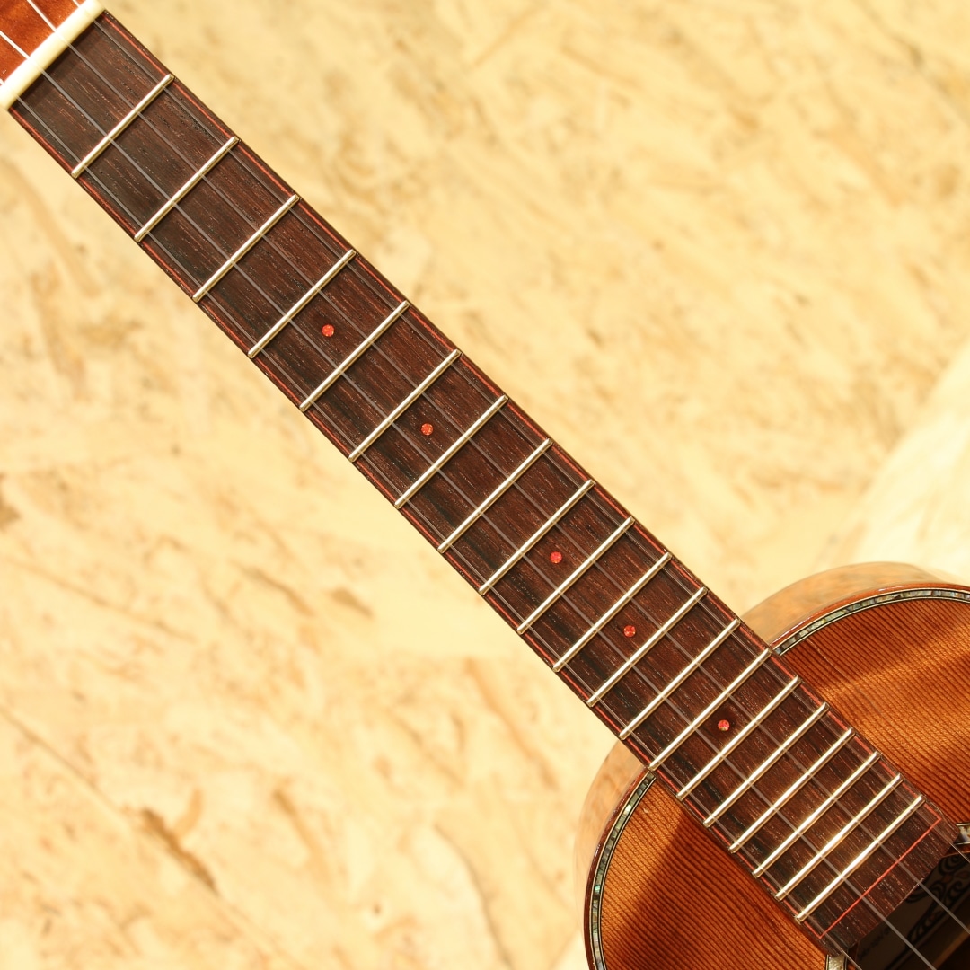 群馬にて増田明夫氏が製作する"Water Road Guitars"は、"音、弾きやすさ、デザインへのこだわり"を概念にオンリーワンのカスタムを製作しています。極上マテリアルを最大限に活かし、フィンガーピッキングに特化したギターを追求、稀代の天才が造り出す日本が誇るギタールシアーです。本器は、そんな増田氏が造る"Tenor Ukulele"モデル。2021年製USED品。ギター造りのノウハウを活かし作られた本器は、溢れる倍音と美しい響きを持つ逸品。また、膨大な極上木材を保有する増田氏ならではの美しいマテリアルを惜しげも無く使用し作られた1本。トップには波のように揺らめく杢が美しいカーリーレッドウッド、サイド&バックには浮き出るような玉杢が魅力の上質なキルテッドサペリを使用。ネック材にも同等のキルテッドサペリが使用されています。マダガスカルローズウッド指板&ブリッジ、ゴールドゴトー510H.A.Pペグ、キルテッドサペリ天神板、ディクロラム指板ドットインレイ、アバロンロゼッタ、マダガスカルローズウッドバインディング、アバロンパフリング。レッドウッド&キルテッドサペリの本器は、弾性を持つハリのあるスプルーストップに比べてサウンドレンジに長けた澄み切ったクリアな音色が特徴的で、高音まで美しい響きを持ち合わせます。サペリ特有の硬すぎない歯切れの良さも持ち、他ブランドではなかなか味わえないサウンドを体感できる1本。テナー独特の音域レンジと増田氏の造りによるしっかりとした発音・音量は、ウクレレ以上のスケール感を感じさせてくれます。また、ウクレレとは思えないロングサスティンを持つ本器は低音から高音域まで均一に美しく、弾き手・聴き手を魅了します。トップ面1弦側指板横に杢目に沿ったクラックが見られますがしっかりと修正済です。ネックヒールやバインディングの継ぎ目箇所に僅かな塗装浮きが見られますが、表層面のみですのでご使用への影響はありません。その他特筆すべき使用感は無く、ネック&プレイ状態は良好、全体的に整えられたコンディションが保たれた1本。ブリッジ下部には弦飛び防止のクリアガードを標準装備。出回りの少ない氏ならではの美事なウクレレモデルを、是非このご機会にご体感ください。汎用セミハードケースが付属します。
