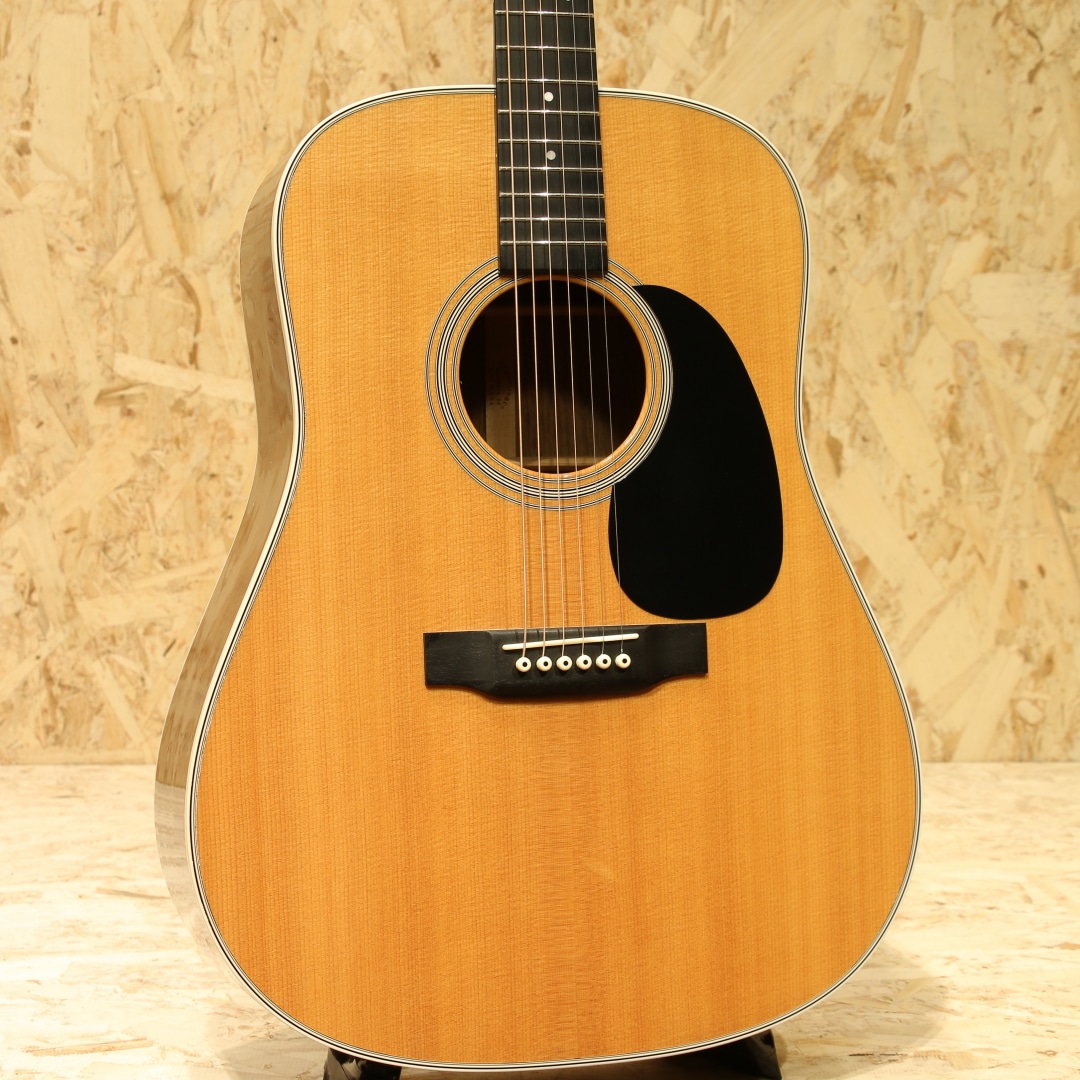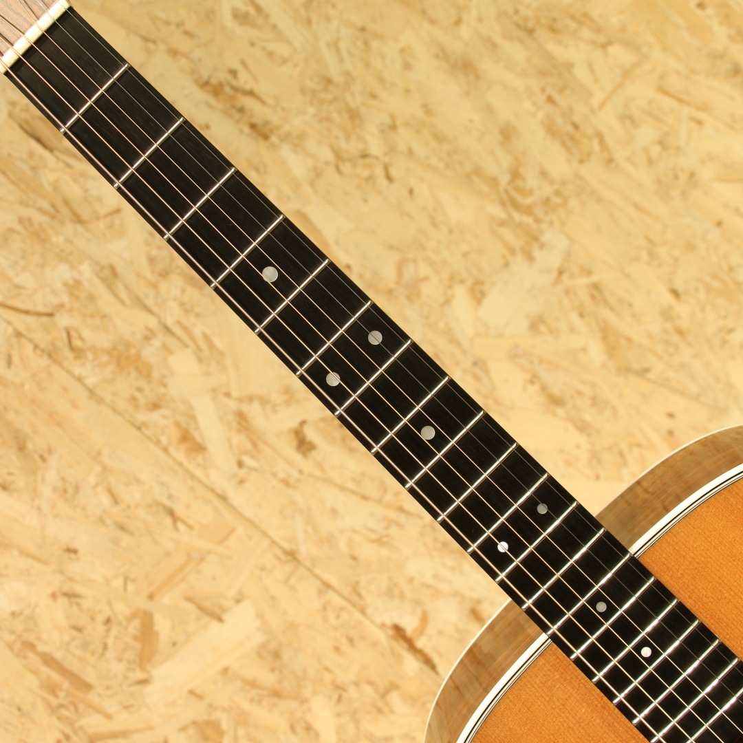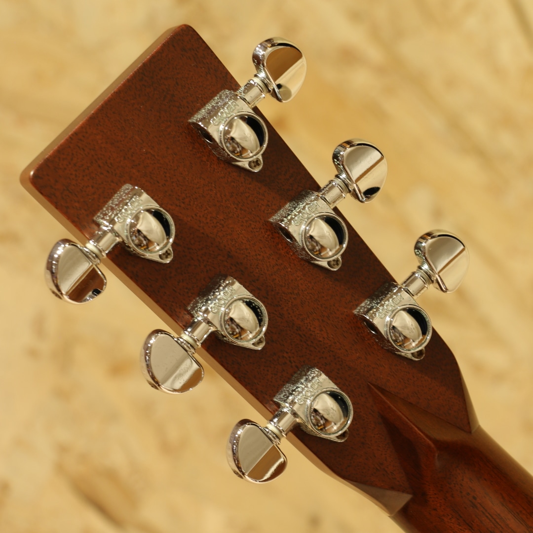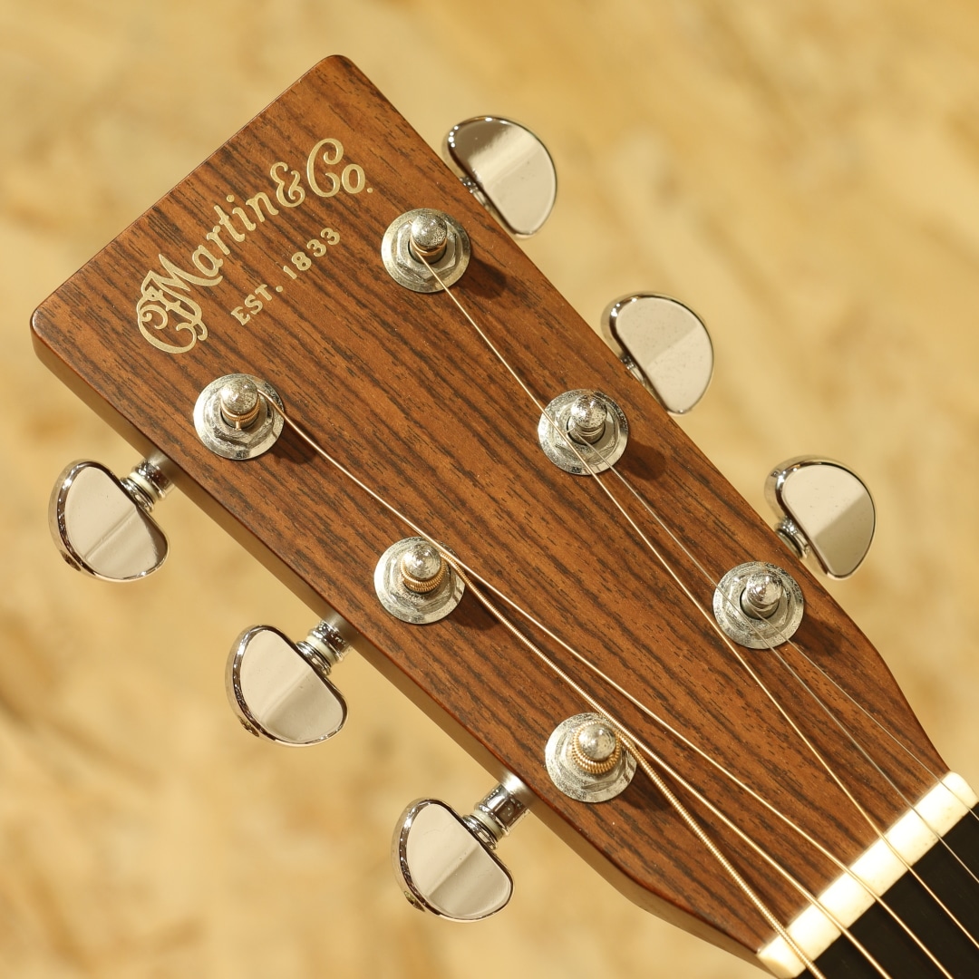 マーチンギターの中で最も有名なモデルといえば、この"D-28"。現在同様の14fジョイントのドレッドモデルとして1934年に誕生してから、時を超え今もなお愛されるワールドスタンダードモデルです。本器は2013年製USED品。シトカスプルーストップ、ローズウッドサイド&バック、エボニー指板&ブリッジ、グローバーロトマチックペグ、MOP指板ドット、ブラックピックガード、チェッカーフラッグバックストリップ、スタンダードノンスキャロップドXブレイシング。D-28は2017年に大きく仕様が変わり、よりオールドテイストを取り入れた姿へと変化しました。2025年にも細やかな個所が変更されゴールデンエラ期に近づいた特徴を与えられています。本器はそれらの変更が入る前の旧仕様。ナット幅は現行品と異なり42.9mm、ブレイシングはノンスキャロップのスタンダードX、ペグはグローバーのロトマチックタイプ。現行品のナット幅が広く握り込みにくいと感じられる方には一度体感して欲しいネック、親指を使った押弦にも対応しやすいグリップ。この仕様を探している方が一定数おられることにも納得です。そしてフォワードシフトではなくスタンダードXの為、ブリッジ付近の強度が高くなりより粒立ちの揃ったバランスの良いサウンド。ノンスキャロップでやや太いサウンド、音の輪郭も出しやすく制御しやすい辺り細かいニュアンスを表現できる可能性をもっています。ペグ自体も重量がある為に重たい響きとスーッと伸びるサスティーンを生み出しやすく、音を切る、伸ばすの加減も演奏者次第。自分が思い描く演奏へ応えてくれるであろう世界のスタンダードモデル。プレイスタイルも特段選ばず、ストロークでのパワフルなサウンド、フィンガーでの繊細な響きを堪能できる1本です。ボディトップ面の下部に6cm弱のセンターシーム剥がれの跡が見られますが、再接着とタッチアップが施され手触りでは段差を感じないほど丁寧な作業がされており、使用上は問題ございません。ボディバインディングは全体的に剥がれ修正をされた跡が見られますが、こちらも丁寧に修正されており手触り上段差も感じられず問題の無い状態。ペグに錆びが見られる点やボディバックの6弦側センター上部付近の僅かな塗装の反応跡、ネック裏からヘッド裏にかけてセンターに手で触っても分からないほどの薄い線キズなどの使用感が見られますが、その分お買い得なプライス。演奏性の面は非常に良く整えられており、トラスロッド残りやサドルの残りも充分、プレイヤーズコンディションの1本です。アコースティックギターの永遠のスタンダード。手入れの跡こそ見られますが、まだまだ使って頂ける1本です。キズや修正跡を気にせず使いたい方には是非オススメ。ワールドスタンダードの旧仕様、お買い得品をお探しだった方はお早めに。