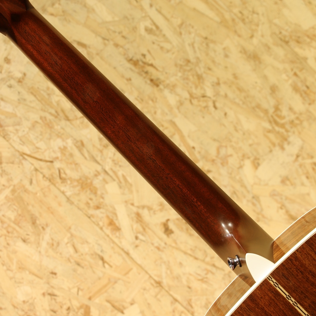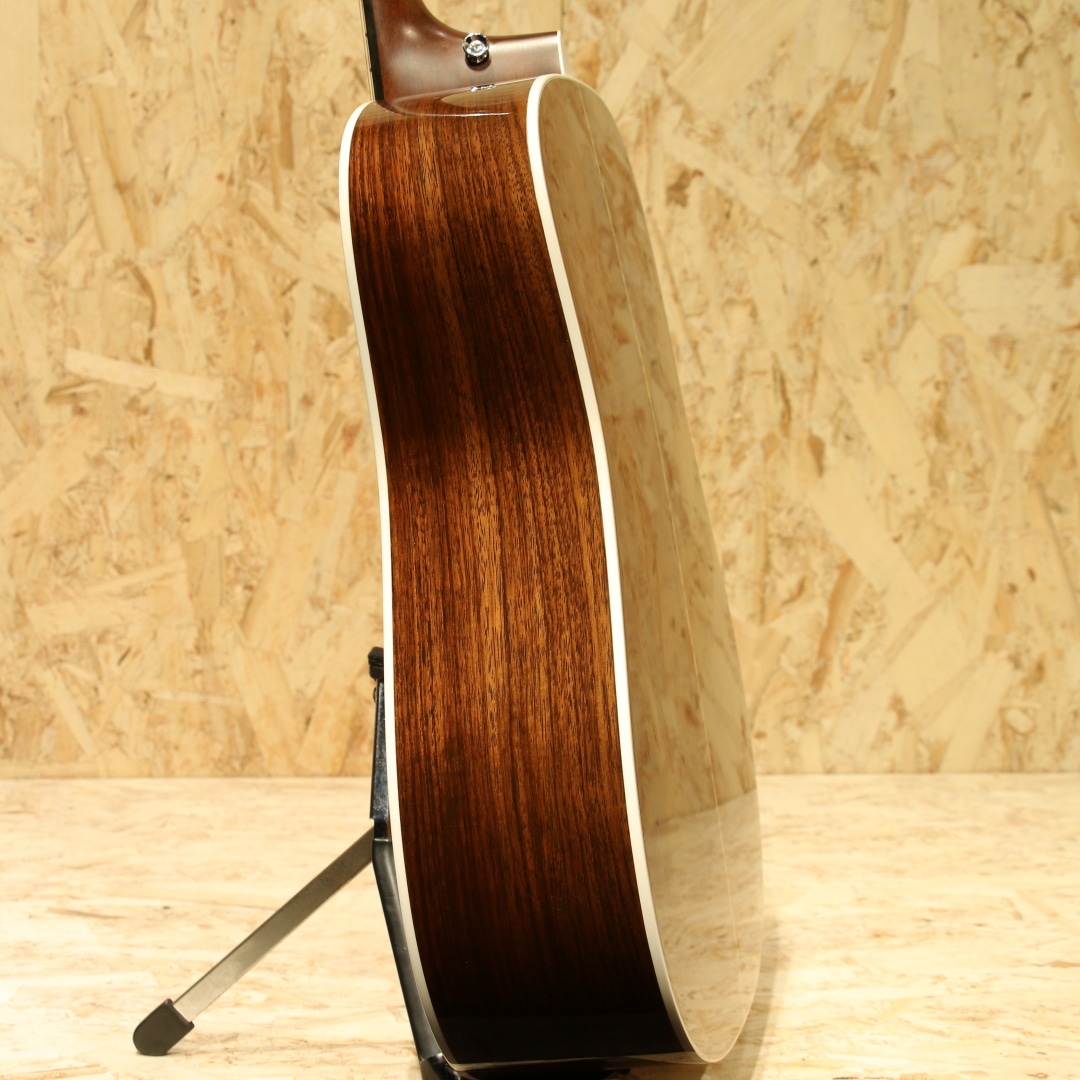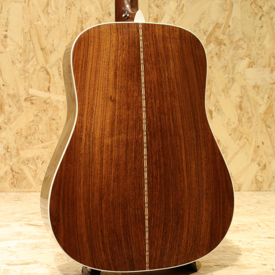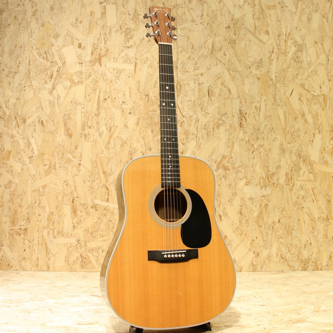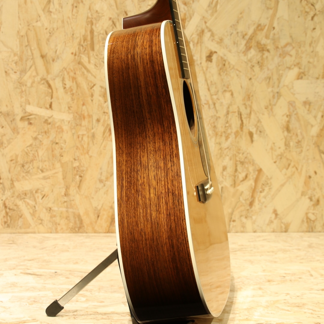 マーチンギターの中で最も有名なモデルといえば、この"D-28"。現在同様の14fジョイントのドレッドモデルとして1934年に誕生してから、時を超え今もなお愛されるワールドスタンダードモデルです。本器は2013年製USED品。シトカスプルーストップ、ローズウッドサイド&バック、エボニー指板&ブリッジ、グローバーロトマチックペグ、MOP指板ドット、ブラックピックガード、チェッカーフラッグバックストリップ、スタンダードノンスキャロップドXブレイシング。D-28は2017年に大きく仕様が変わり、よりオールドテイストを取り入れた姿へと変化しました。2025年にも細やかな個所が変更されゴールデンエラ期に近づいた特徴を与えられています。本器はそれらの変更が入る前の旧仕様。ナット幅は現行品と異なり42.9mm、ブレイシングはノンスキャロップのスタンダードX、ペグはグローバーのロトマチックタイプ。現行品のナット幅が広く握り込みにくいと感じられる方には一度体感して欲しいネック、親指を使った押弦にも対応しやすいグリップ。この仕様を探している方が一定数おられることにも納得です。そしてフォワードシフトではなくスタンダードXの為、ブリッジ付近の強度が高くなりより粒立ちの揃ったバランスの良いサウンド。ノンスキャロップでやや太いサウンド、音の輪郭も出しやすく制御しやすい辺り細かいニュアンスを表現できる可能性をもっています。ペグ自体も重量がある為に重たい響きとスーッと伸びるサスティーンを生み出しやすく、音を切る、伸ばすの加減も演奏者次第。自分が思い描く演奏へ応えてくれるであろう世界のスタンダードモデル。プレイスタイルも特段選ばず、ストロークでのパワフルなサウンド、フィンガーでの繊細な響きを堪能できる1本です。ボディトップ面の下部に6cm弱のセンターシーム剥がれの跡が見られますが、再接着とタッチアップが施され手触りでは段差を感じないほど丁寧な作業がされており、使用上は問題ございません。ボディバインディングは全体的に剥がれ修正をされた跡が見られますが、こちらも丁寧に修正されており手触り上段差も感じられず問題の無い状態。ペグに錆びが見られる点やボディバックの6弦側センター上部付近の僅かな塗装の反応跡、ネック裏からヘッド裏にかけてセンターに手で触っても分からないほどの薄い線キズなどの使用感が見られますが、その分お買い得なプライス。演奏性の面は非常に良く整えられており、トラスロッド残りやサドルの残りも充分、プレイヤーズコンディションの1本です。アコースティックギターの永遠のスタンダード。手入れの跡こそ見られますが、まだまだ使って頂ける1本です。キズや修正跡を気にせず使いたい方には是非オススメ。ワールドスタンダードの旧仕様、お買い得品をお探しだった方はお早めに。
