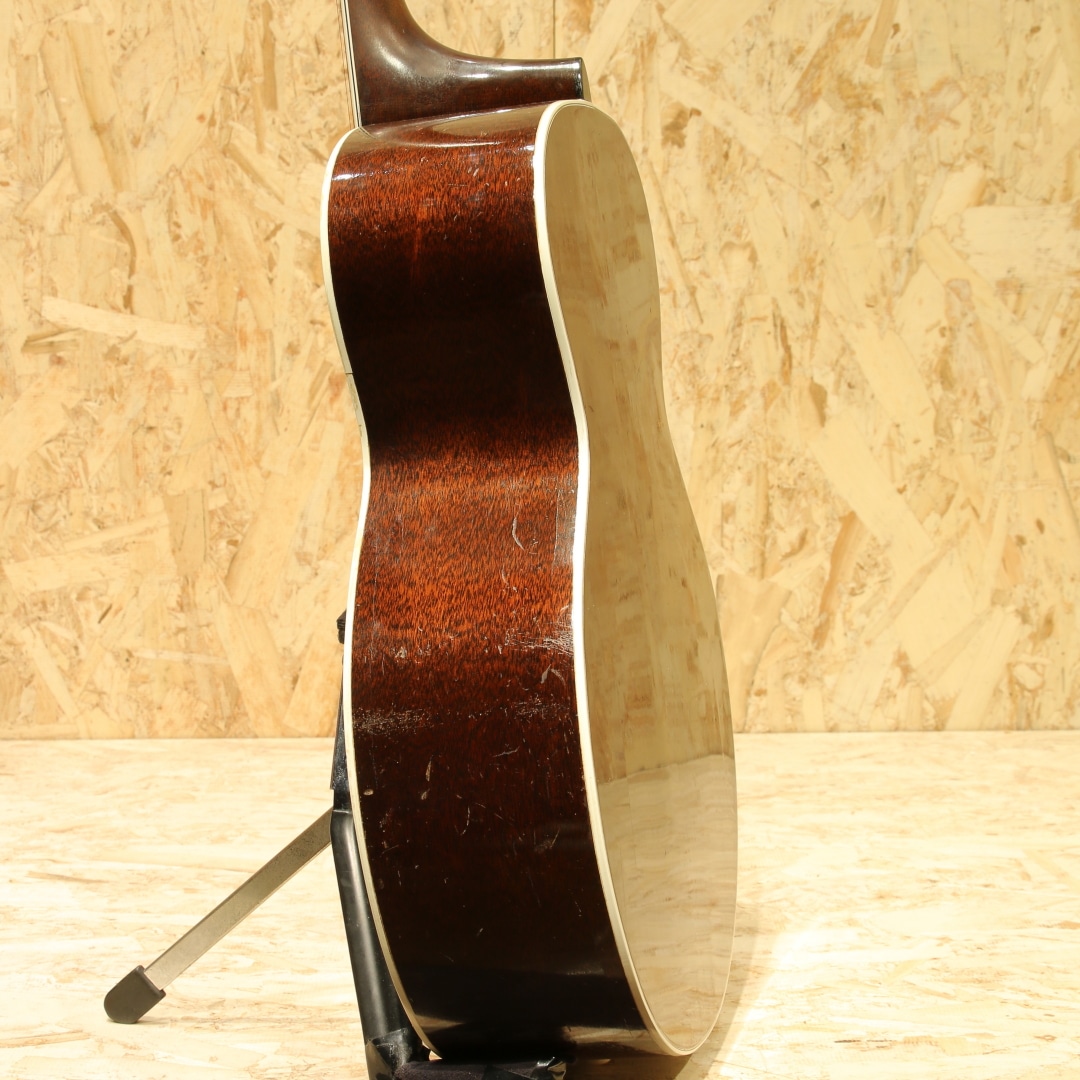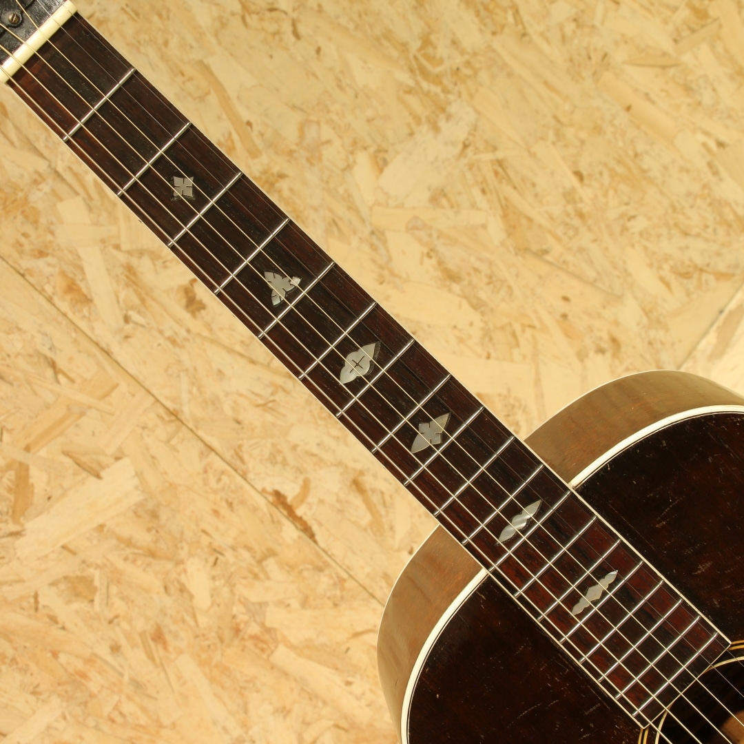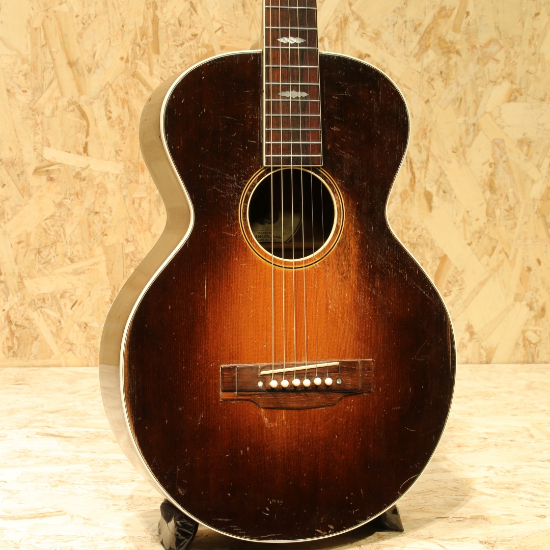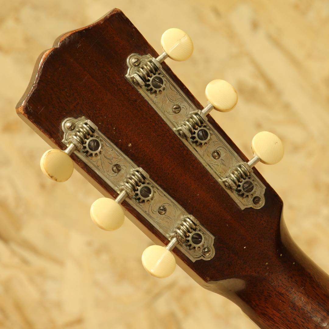 ギブソンを代表する名器Nick Lucas Special。その名の通り、当時のギター、ウクレレ演奏におけるスターであったニック・ルーカスの名前を冠にしたフラットトップ最高峰としてオリジナル品は1927年に登場し、1941年にその幕を閉じました。当時L-0は$35,L-1は$50だったのに対してNick Lucas Specialは$125。L-0のおよそ3.5倍、L-1のおよそ2.5倍もの高値で売られていたフラッグシップモデルです。本器は大変貴重な最初期の1928年製。13.5インチ(34.29cm)Lower bout、24.25インチ(615.95mm) スケール仕様。1929年以降より14 1/2インチ(36.83cm)Lower, 24.75インチ(628.65mm)スケール仕様になるため初期のみのレアスペックです。同様に初期仕様の2段層ブリッジ、ディープボディー。スプルーストップ、マホガニーサイドバック、ハカランダ指板&ブリッジ、オリジナル3連彫金チューナー、ファンシーなMOPフィンガーボードインレイ、トップ&バックホワイトバウンド、WBWの3リング ロゼッタ、サウンドホールバウンド、The gibsonヘッドロゴ。トップブリッジ6弦ピン下あたりにダメージ修正跡、指板下部両サイドトップ面に沿ったクラック修正、サウンドホールから6弦側サイド手前にクラック修正、トップ両サイドくびれから膨らみにかけての箇所にクラック修正、全体的な傷にサウンドホール周りの傷への部分的な薄掛けのフィニッシュ補正、バックのセンター上部に2箇所、下部膨らみに近い箇所6弦側に2箇所、1弦側に1箇所それぞれにクラック修正、バック全体に薄掛けのオーバーラッカーが施されています。所々に年数を物語る塗装の剥がれや傷は多く見られますが年代を考えると素晴らしいコンディションをキープしています。年代を考慮してエキストラライトゲージをマウントしていますが、もっとも気になるポイントのネックは驚くほどストレートで現代なみに弾きやすいコンディションをキープ。サドルも程よく残った状態で申し分ないプレイコンディションです。この先大変希少なニックルーカスでこれほどまでの演奏力をキープした個体を見つけるのは困難でしょう。この年代を求める弾き手にとってはほぼパーフェクトでしょう。国内のみならず海外でも稀にしかお目に掛かれないコレクターズピースの"ニックルーカススペシャル"。汎用ハードケース付属です。ぜひお早めに。