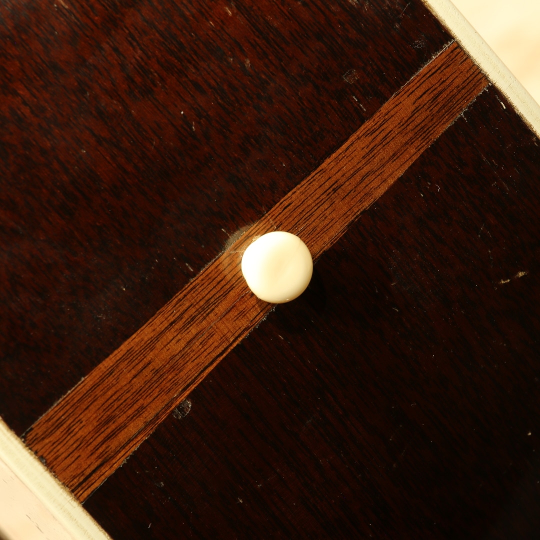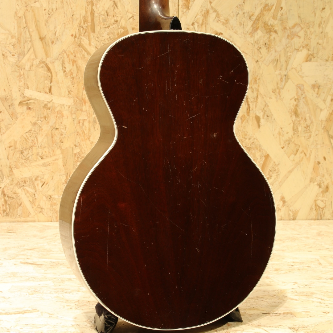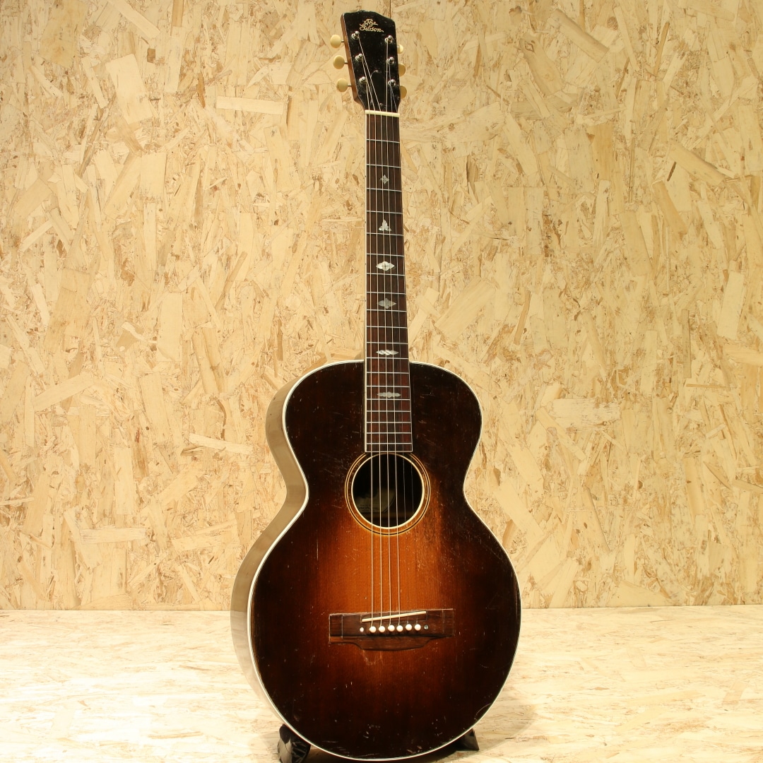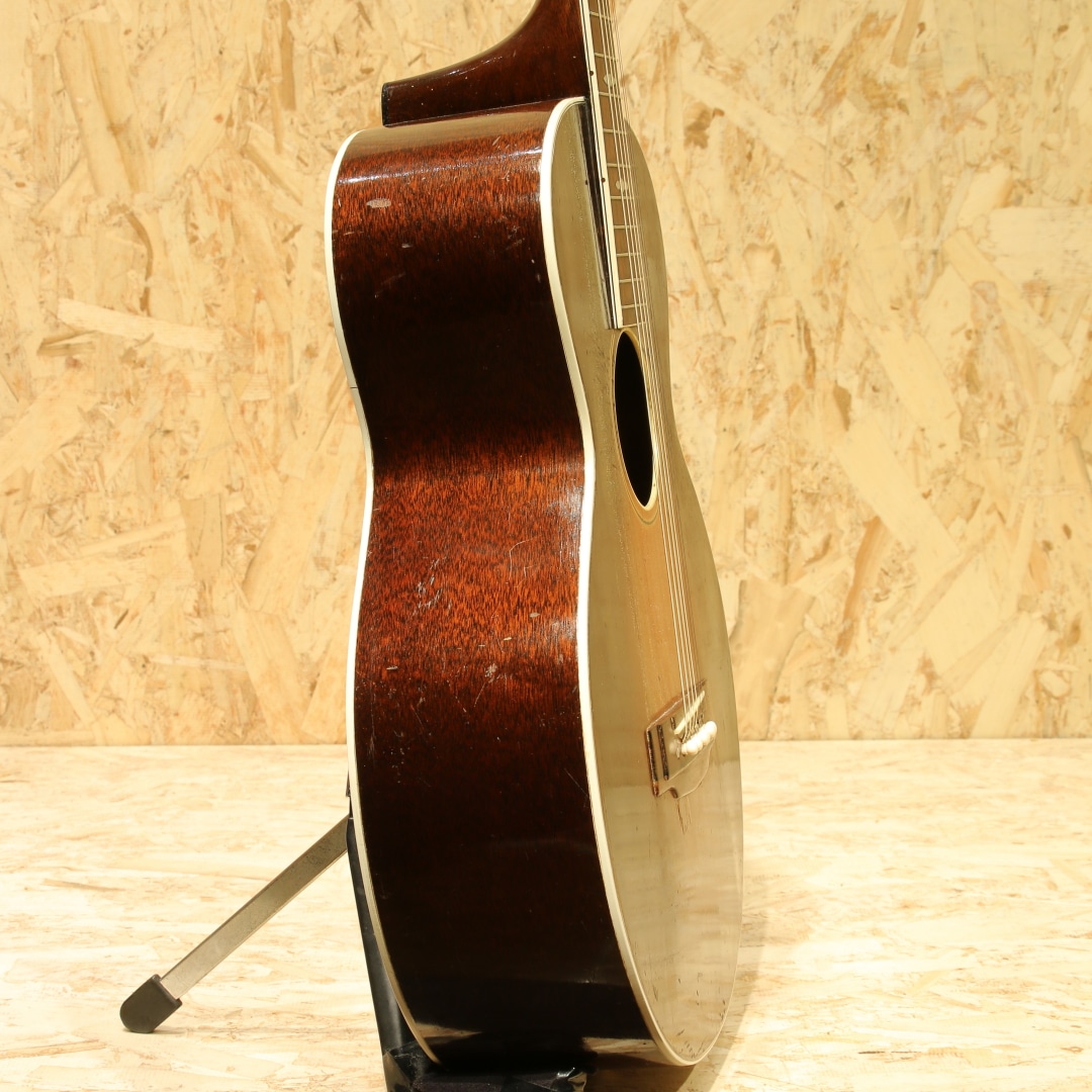 ギブソンを代表する名器Nick Lucas Special。その名の通り、当時のギター、ウクレレ演奏におけるスターであったニック・ルーカスの名前を冠にしたフラットトップ最高峰としてオリジナル品は1927年に登場し、1941年にその幕を閉じました。当時L-0は$35,L-1は$50だったのに対してNick Lucas Specialは$125。L-0のおよそ3.5倍、L-1のおよそ2.5倍もの高値で売られていたフラッグシップモデルです。本器は大変貴重な最初期の1928年製。13.5インチ(34.29cm)Lower bout、24.25インチ(615.95mm) スケール仕様。1929年以降より14 1/2インチ(36.83cm)Lower, 24.75インチ(628.65mm)スケール仕様になるため初期のみのレアスペックです。同様に初期仕様の2段層ブリッジ、ディープボディー。スプルーストップ、マホガニーサイドバック、ハカランダ指板&ブリッジ、オリジナル3連彫金チューナー、ファンシーなMOPフィンガーボードインレイ、トップ&バックホワイトバウンド、WBWの3リング ロゼッタ、サウンドホールバウンド、The gibsonヘッドロゴ。トップブリッジ6弦ピン下あたりにダメージ修正跡、指板下部両サイドトップ面に沿ったクラック修正、サウンドホールから6弦側サイド手前にクラック修正、トップ両サイドくびれから膨らみにかけての箇所にクラック修正、全体的な傷にサウンドホール周りの傷への部分的な薄掛けのフィニッシュ補正、バックのセンター上部に2箇所、下部膨らみに近い箇所6弦側に2箇所、1弦側に1箇所それぞれにクラック修正、バック全体に薄掛けのオーバーラッカーが施されています。所々に年数を物語る塗装の剥がれや傷は多く見られますが年代を考えると素晴らしいコンディションをキープしています。年代を考慮してエキストラライトゲージをマウントしていますが、もっとも気になるポイントのネックは驚くほどストレートで現代なみに弾きやすいコンディションをキープ。サドルも程よく残った状態で申し分ないプレイコンディションです。この先大変希少なニックルーカスでこれほどまでの演奏力をキープした個体を見つけるのは困難でしょう。この年代を求める弾き手にとってはほぼパーフェクトでしょう。国内のみならず海外でも稀にしかお目に掛かれないコレクターズピースの"ニックルーカススペシャル"。汎用ハードケース付属です。ぜひお早めに。