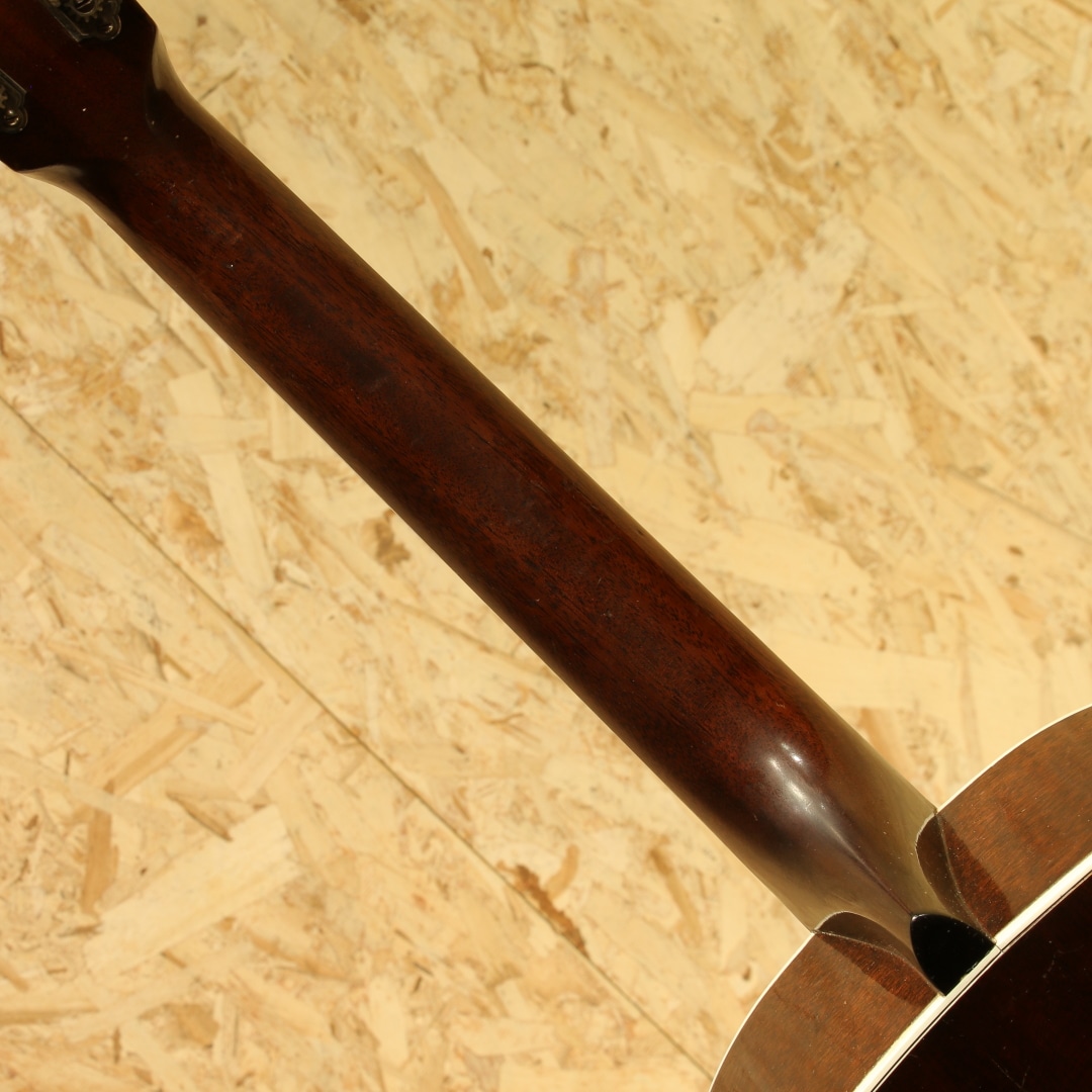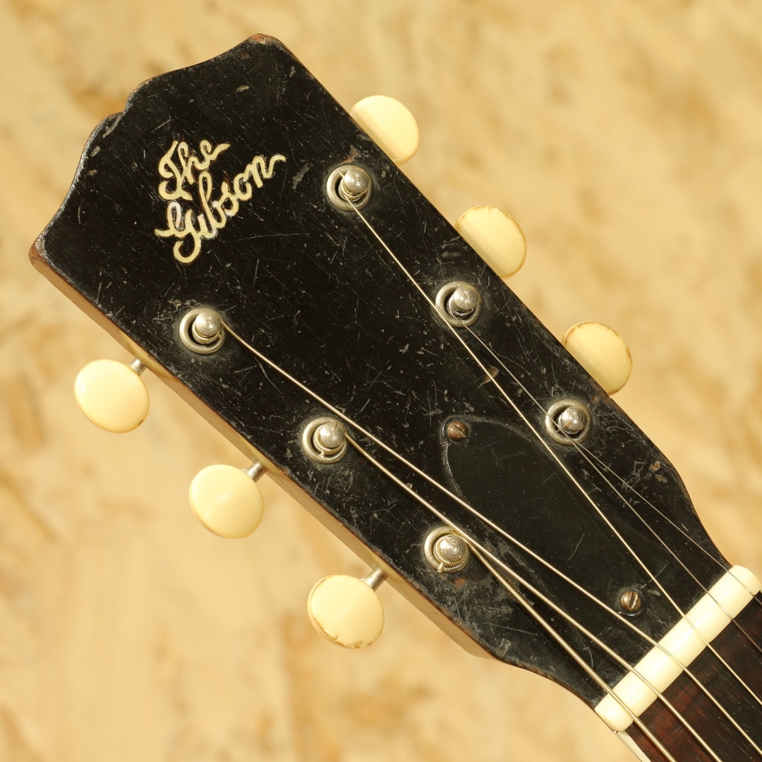 ギブソンを代表する名器Nick Lucas Special。その名の通り、当時のギター、ウクレレ演奏におけるスターであったニック・ルーカスの名前を冠にしたフラットトップ最高峰としてオリジナル品は1927年に登場し、1941年にその幕を閉じました。当時L-0は$35,L-1は$50だったのに対してNick Lucas Specialは$125。L-0のおよそ3.5倍、L-1のおよそ2.5倍もの高値で売られていたフラッグシップモデルです。本器は大変貴重な最初期の1928年製。13.5インチ(34.29cm)Lower bout、24.25インチ(615.95mm) スケール仕様。1929年以降より14 1/2インチ(36.83cm)Lower, 24.75インチ(628.65mm)スケール仕様になるため初期のみのレアスペックです。同様に初期仕様の2段層ブリッジ、ディープボディー。スプルーストップ、マホガニーサイドバック、ハカランダ指板&ブリッジ、オリジナル3連彫金チューナー、ファンシーなMOPフィンガーボードインレイ、トップ&バックホワイトバウンド、WBWの3リング ロゼッタ、サウンドホールバウンド、The gibsonヘッドロゴ。トップブリッジ6弦ピン下あたりにダメージ修正跡、指板下部両サイドトップ面に沿ったクラック修正、サウンドホールから6弦側サイド手前にクラック修正、トップ両サイドくびれから膨らみにかけての箇所にクラック修正、全体的な傷にサウンドホール周りの傷への部分的な薄掛けのフィニッシュ補正、バックのセンター上部に2箇所、下部膨らみに近い箇所6弦側に2箇所、1弦側に1箇所それぞれにクラック修正、バック全体に薄掛けのオーバーラッカーが施されています。所々に年数を物語る塗装の剥がれや傷は多く見られますが年代を考えると素晴らしいコンディションをキープしています。年代を考慮してエキストラライトゲージをマウントしていますが、もっとも気になるポイントのネックは驚くほどストレートで現代なみに弾きやすいコンディションをキープ。サドルも程よく残った状態で申し分ないプレイコンディションです。この先大変希少なニックルーカスでこれほどまでの演奏力をキープした個体を見つけるのは困難でしょう。この年代を求める弾き手にとってはほぼパーフェクトでしょう。国内のみならず海外でも稀にしかお目に掛かれないコレクターズピースの"ニックルーカススペシャル"。汎用ハードケース付属です。ぜひお早めに。