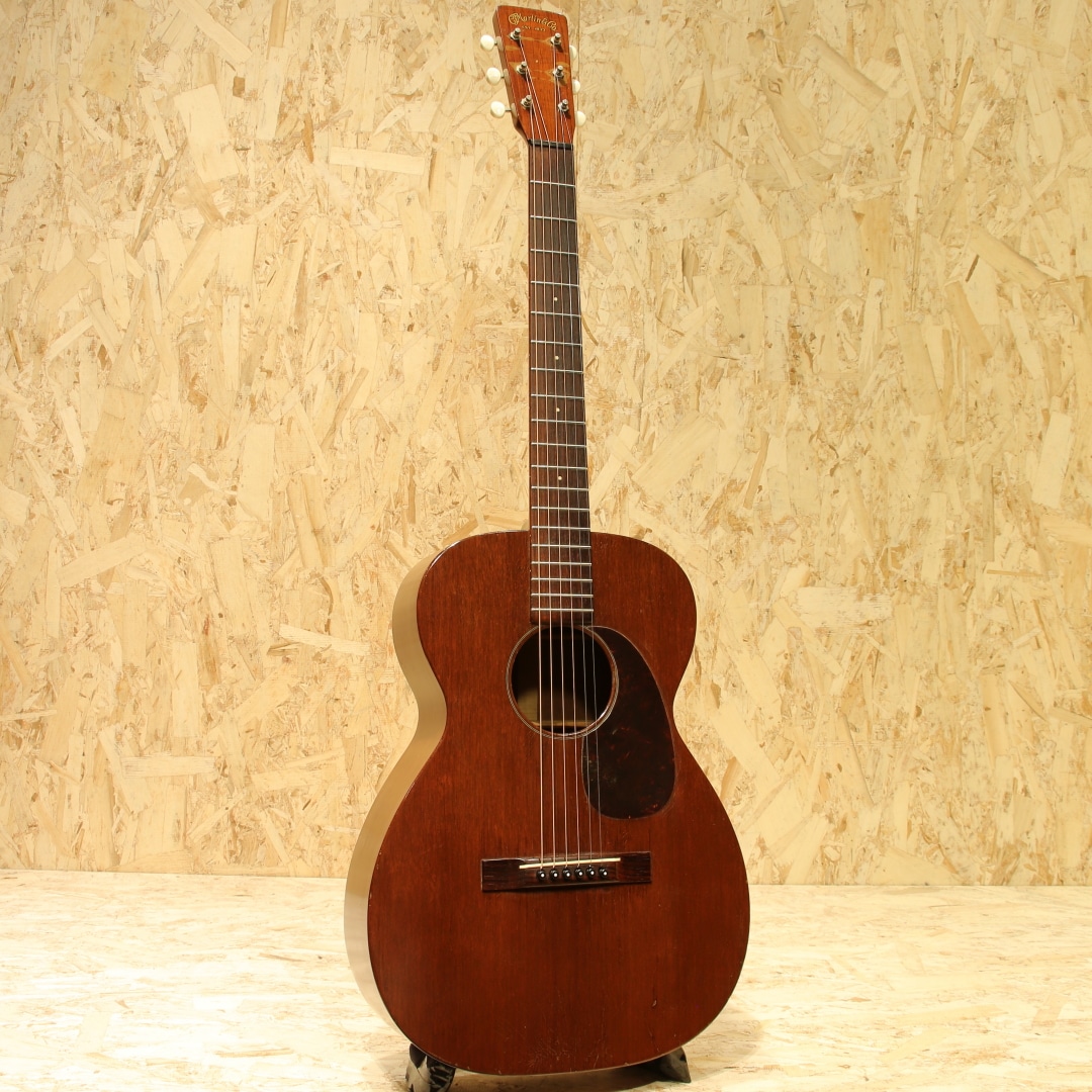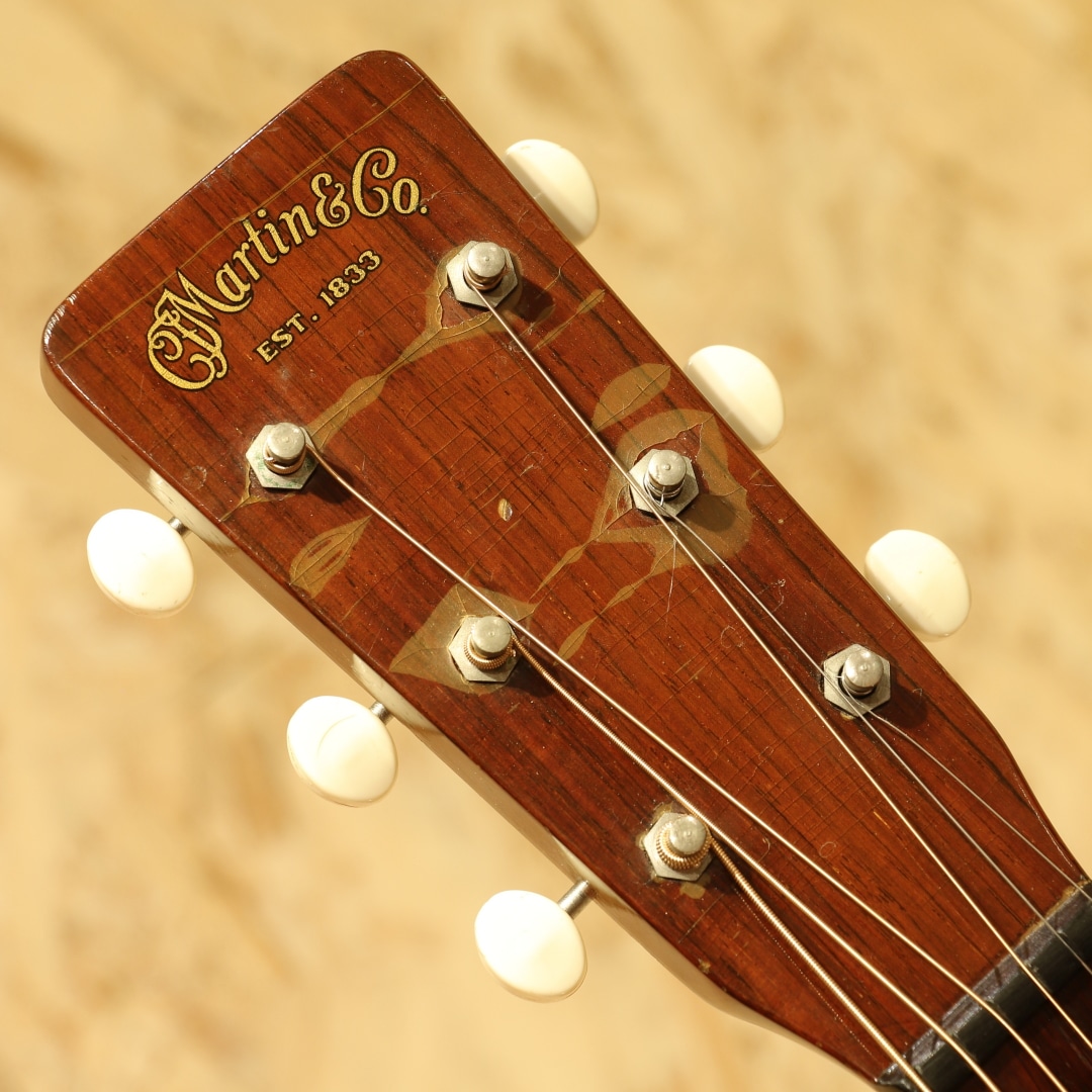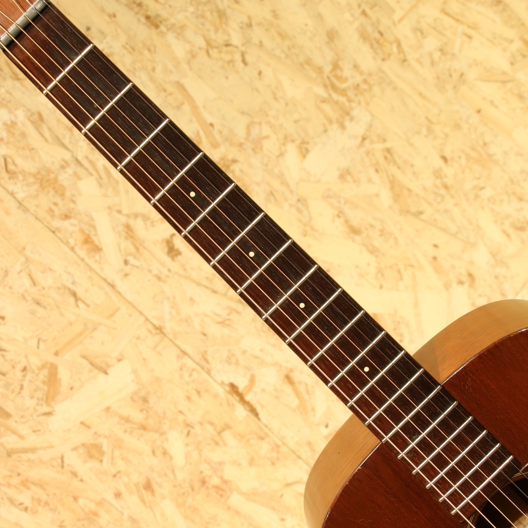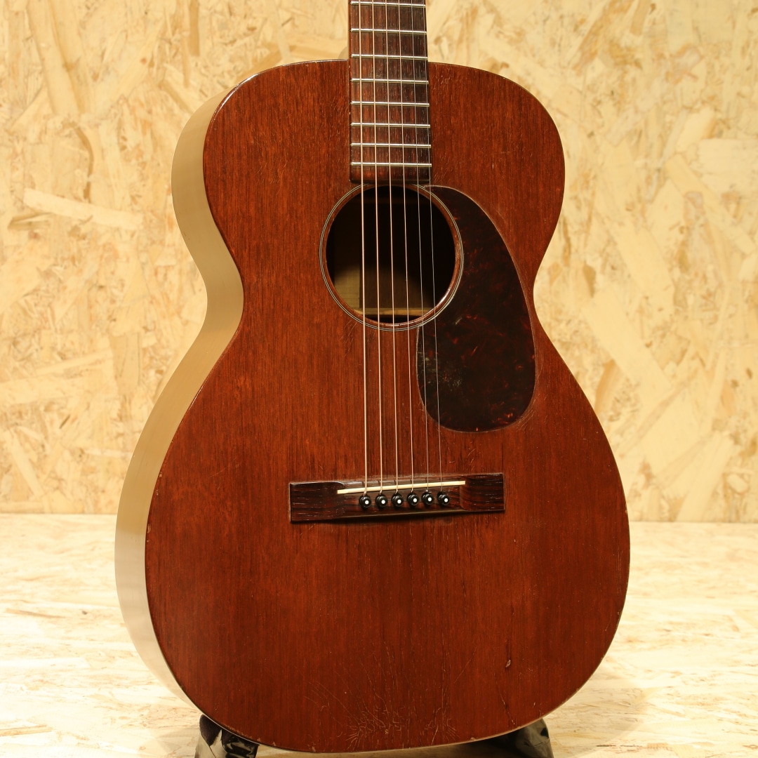 オールマホガニーボディ、セミグロス仕上げのStyle15。Style17から風合いと装飾を変更した仕様、製造開始から20年以上もの間マーチンの中でもリーズナブルな機種として愛されてきました。本器は1954年製の”O-15”。オールマホガニーボディ、14Fジョイント、マホガニーネック、スチールTバーネックロッド、ハカランダ指板&レクタングルブリッジ、べっ甲柄セルロイドピックガード、グローバーオープンバックペグ、ノンスキャロップドXブレイシング。Style17より若干光沢の少ないセミグロス仕様、指板ドットは全てシングル。1935年にStyle15は生まれ、1940年に馴染みのあるオールマホガニーボディの仕様へ。最終的には1963年にStyle15が廃止、O-15は1961年までの生産となり惜しくもラインナップから姿を消しました。この間ほとんど仕様の変更は行われず、登場時点でほぼ完成されていたモデルと言えるでしょう。1997年から再発売されたStyle15とは仕様も異なり、一線を画します。小型のボディでありつつも胴厚のあるO。これによってサイズ感以上にふくよかな響き、奥行き感を感じさせるトーンを生み出すボディサイズです。柔らかいタッチ感での演奏に対して反応が早く、粒立ちの揃った立ち上がり。中域の解像度の高さや押し出し感はこのサイズ特有です。マホガニーをトップに据えることで、中高域から高域にかけて強調されたようなサウンドへ。よりソリッドさやタイトな響き、中低域はややブーミーな暖かさを感じさせます。乾いた響きと甘いトーン、ブライトさを備えた趣深い秀逸器。ストロークでガシガシ弾くも良し、フィンガーでブルースもしくは繊細なタッチのソロなどオールマイティに使える1本です。ピックガード内側に僅かなピックガードクラックの修正跡こそ見られますが、その他にはクラックは見られません。ヘッドのペグ付近の塗装剥離や細やかなウェザーチェックはあれどグッドコンディションをキープされています。ネック周りの演奏性も若干フォーキーなセットアップとなっていますが、弾きづらさを覚えることはなく弾きやすい個体。昨今の価格が高騰しているヴィンテージの中では手の届きやすい1本。是非お試し下さいませ。