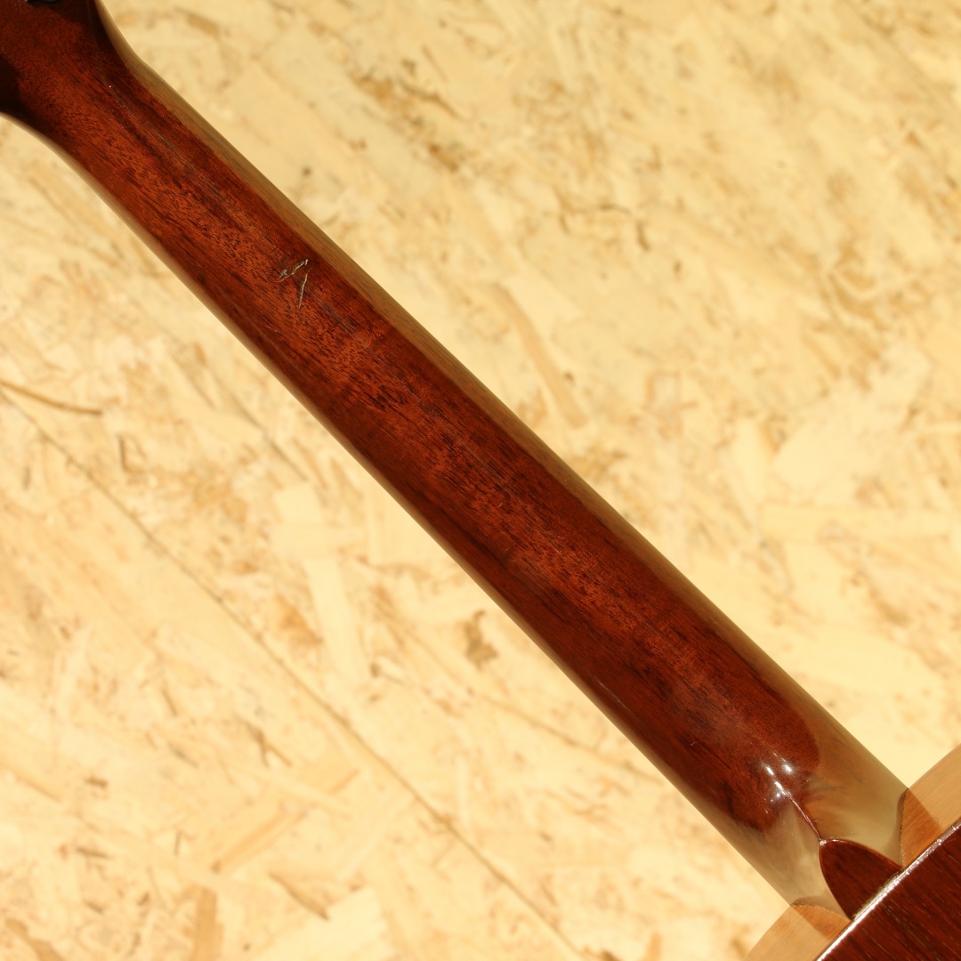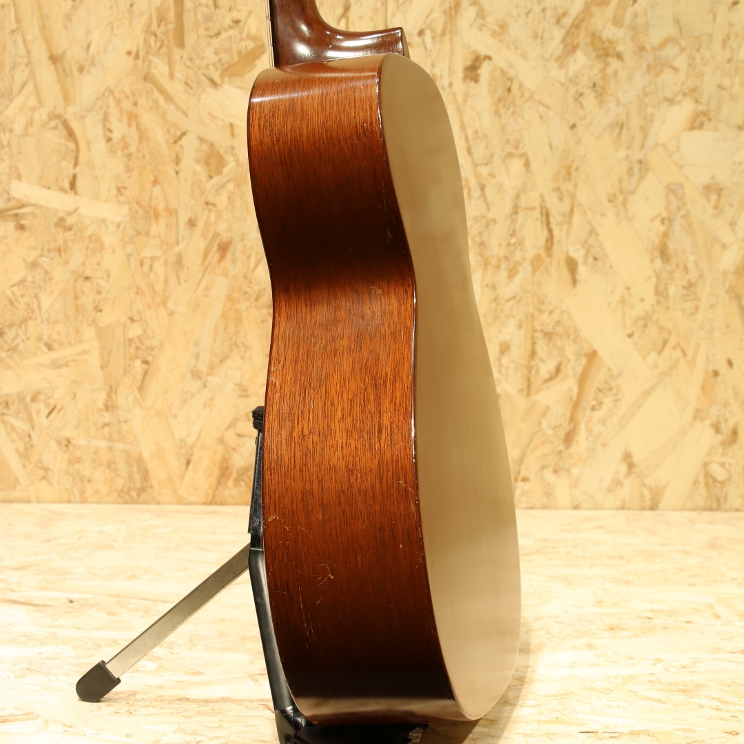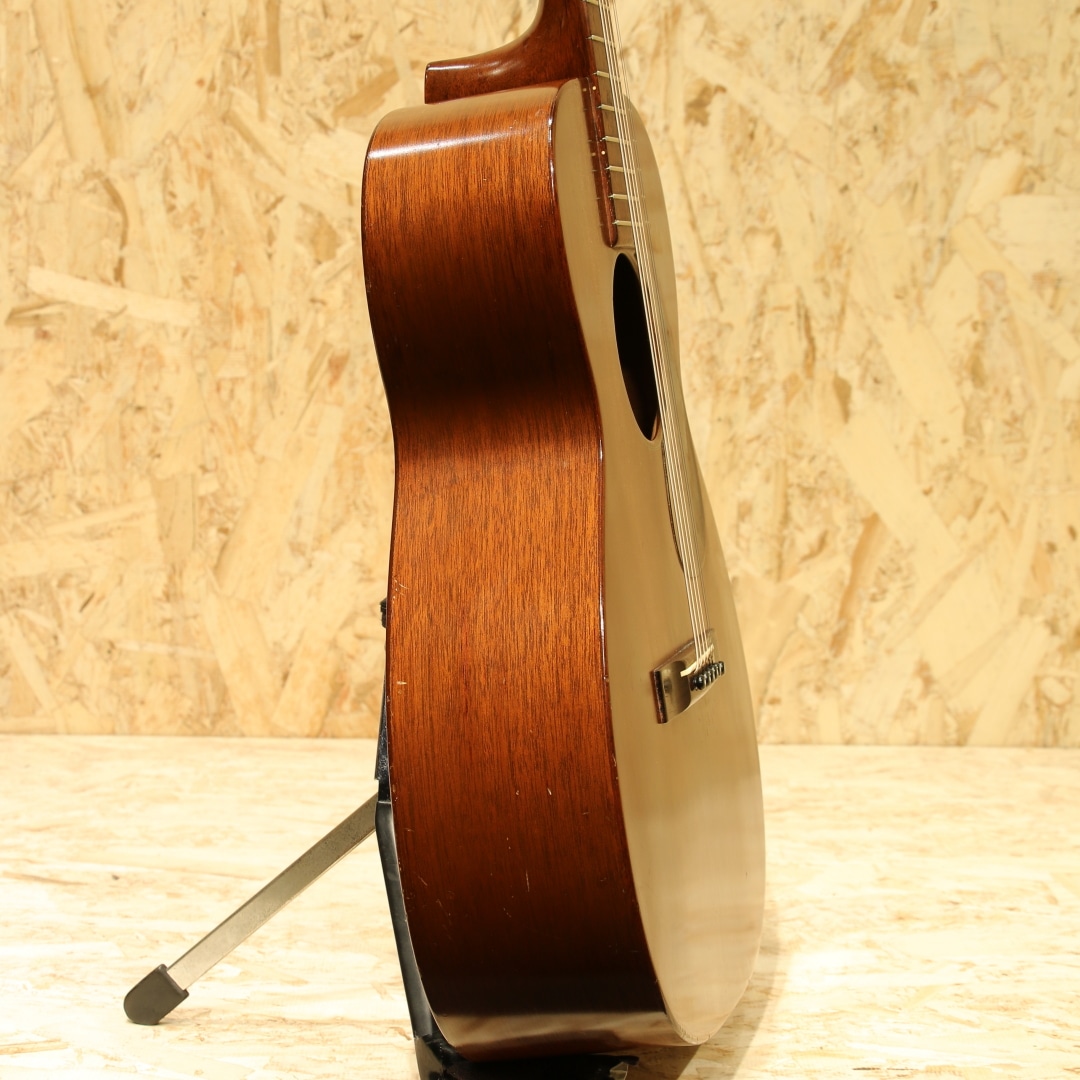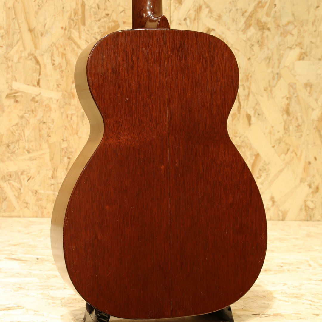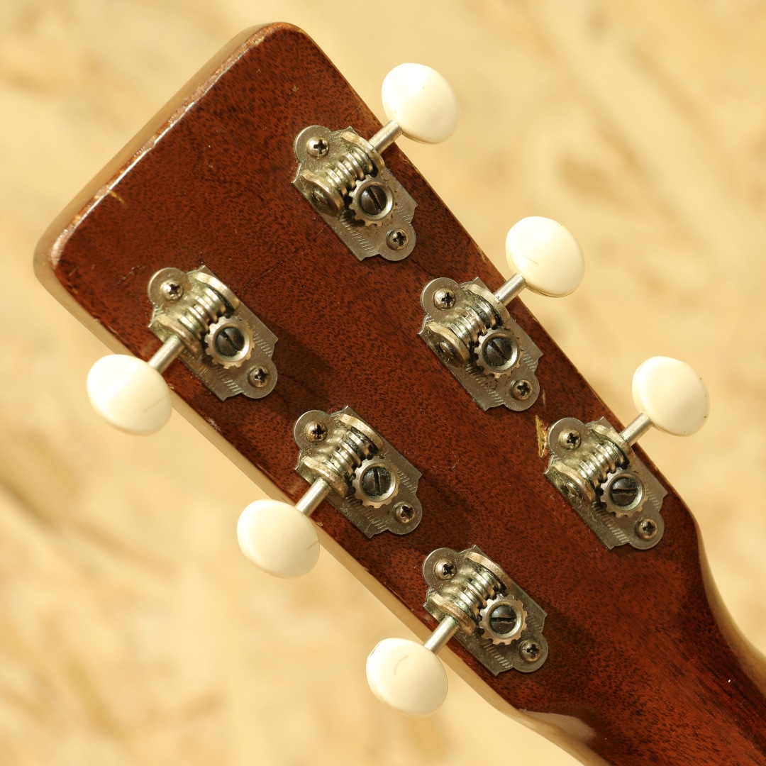オールマホガニーボディ、セミグロス仕上げのStyle15。Style17から風合いと装飾を変更した仕様、製造開始から20年以上もの間マーチンの中でもリーズナブルな機種として愛されてきました。本器は1954年製の”O-15”。オールマホガニーボディ、14Fジョイント、マホガニーネック、スチールTバーネックロッド、ハカランダ指板&レクタングルブリッジ、べっ甲柄セルロイドピックガード、グローバーオープンバックペグ、ノンスキャロップドXブレイシング。Style17より若干光沢の少ないセミグロス仕様、指板ドットは全てシングル。1935年にStyle15は生まれ、1940年に馴染みのあるオールマホガニーボディの仕様へ。最終的には1963年にStyle15が廃止、O-15は1961年までの生産となり惜しくもラインナップから姿を消しました。この間ほとんど仕様の変更は行われず、登場時点でほぼ完成されていたモデルと言えるでしょう。1997年から再発売されたStyle15とは仕様も異なり、一線を画します。小型のボディでありつつも胴厚のあるO。これによってサイズ感以上にふくよかな響き、奥行き感を感じさせるトーンを生み出すボディサイズです。柔らかいタッチ感での演奏に対して反応が早く、粒立ちの揃った立ち上がり。中域の解像度の高さや押し出し感はこのサイズ特有です。マホガニーをトップに据えることで、中高域から高域にかけて強調されたようなサウンドへ。よりソリッドさやタイトな響き、中低域はややブーミーな暖かさを感じさせます。乾いた響きと甘いトーン、ブライトさを備えた趣深い秀逸器。ストロークでガシガシ弾くも良し、フィンガーでブルースもしくは繊細なタッチのソロなどオールマイティに使える1本です。ピックガード内側に僅かなピックガードクラックの修正跡こそ見られますが、その他にはクラックは見られません。ヘッドのペグ付近の塗装剥離や細やかなウェザーチェックはあれどグッドコンディションをキープされています。ネック周りの演奏性も若干フォーキーなセットアップとなっていますが、弾きづらさを覚えることはなく弾きやすい個体。昨今の価格が高騰しているヴィンテージの中では手の届きやすい1本。是非お試し下さいませ。