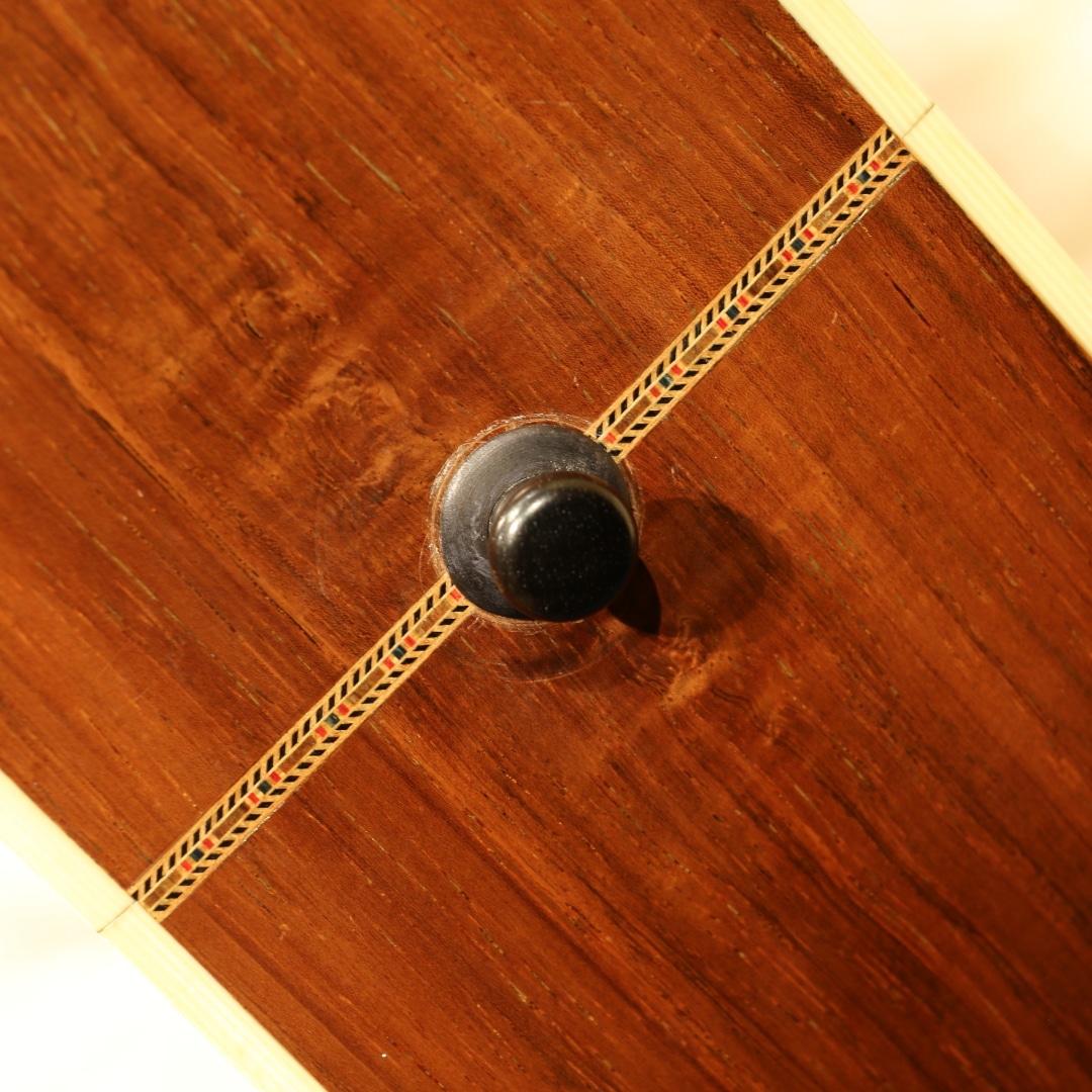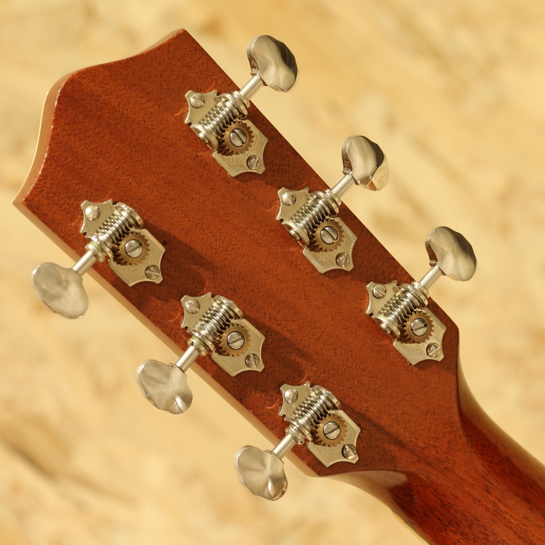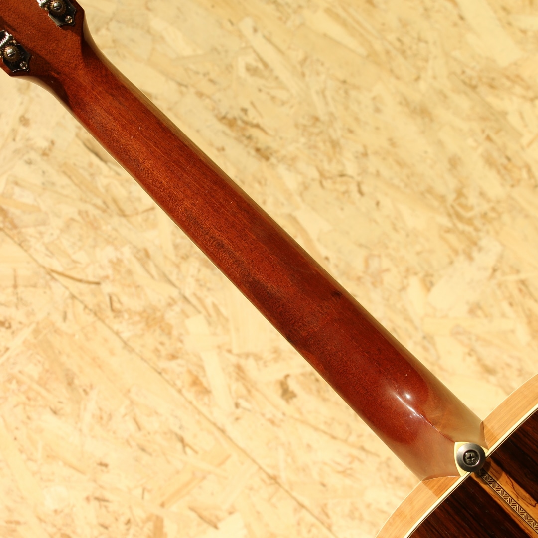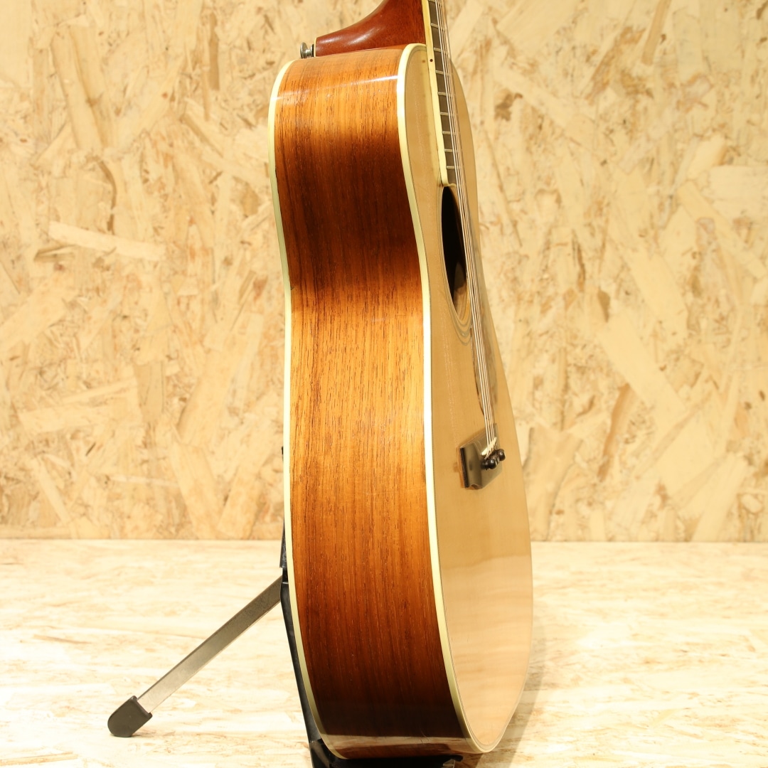過去五十年間、世界中から選ばれたミュージシャンのためのカスタムギターを作り続けてきたアメリカの巨匠、ジョン・グレーベン氏。著名作家の中では必ず名前が挙がる、言わずと知れた名工巨匠です。本器はの1991年の作品。端正なスプルーストップ、サップの入ったワイルドな杢目のハカランダサイド&バック、マホガニーネック、エボニー指板&ブリッジ、ダイアモンドスクエア指板ポジション、ベッコウ柄ピックガード、ヘリンボーントリム、アイボロイドバインディング、アバロンロゼッタ、スキャロップド・エックスブレイシング。ペグはWaverlyのオープンバックへと交換、ネックヒール裏にはシルバーのストラップピンが装着されています。トラディショナルなOOOスタイル、そして貴重なハカランダを使用して製作を行われた本器。Gruhnでリペアをしていた経験があるからこそ、ヘリンボーンを備えたトラディショナルなルックスに説得力が生まれます。グレーベン氏が作るギターに共通する弦の輪郭が横の弦の音と干渉しあっているような太く甘い響き、甘いだけでなく不思議と高音が抜けていく独特の倍音感。優しく柔らかい、やや憂いを帯びたようなトーン。暗い響きには感じず、華やかなサウンドで明るく聞こえますが耳にキンと来ない優しさを含んでいます。繊細さと骨太なサウンドが同居するTheグレーベンサウンド。ハカランダを使用している分よりクリアに、澄んだ響きを生み出してくれる秀逸な個体です。特段演奏スタイルを問わない響きを持ちますが、やはりフィンガースタイルでの人気が高いだけあり、繊細なタッチでの表現力、低音弦での力強い響きはつい爪弾きたくなる1本。柔らかくメロウな曲で一際個性を感じさせてくれるでしょう。トップ面センターシームの6弦側すぐ横にクラック修正跡が見られますが、裏からパッチも当てられており使用上問題はございません。ボディバックのボトム1弦側にクラックの修正跡が見られ、手で触るとほんの僅か段差こそ感じるモノの丁寧に直されており、反対の6弦側はクラック修正の後にタッチアップが施され光に透かしてよく見ないと分からない程の状態となっています。その他バックのセンターストリップ端に接着剤で付いたと思われる木の僅かなシミやボディトップピックガード付近のやや広い範囲の弾きキズとサウンドホール縁のキズ、8Fネック裏の僅かな塗装変質跡、全体的な細やかな当てキズと擦れキズなど年式相応の使用感は感じられますが存分にグレーベンサウンドを体感できる1本。ネックのコンディションも整えられ押弦時のアクションもスムーズで演奏性非常に良好、サドルの高さも若干残しており少ないながらも調整幅を残しています。本家グレーベンの個性的な響き、他では中々体感できないトーンは沼のように心を捉える魅力を持ちます。優しい人柄を感じさせるような人間味のある響き。是非お手元でご体感下さいませ。