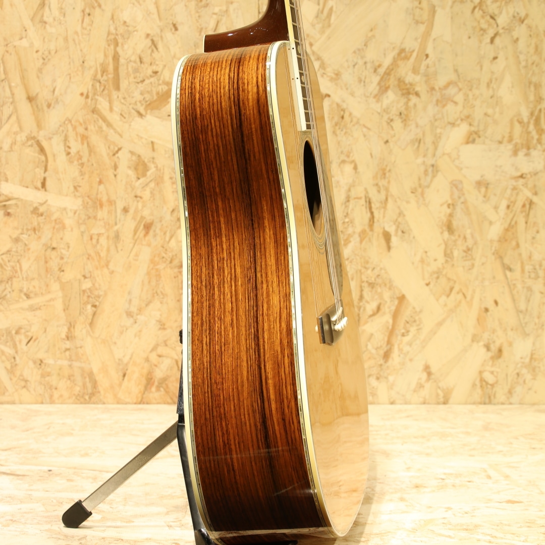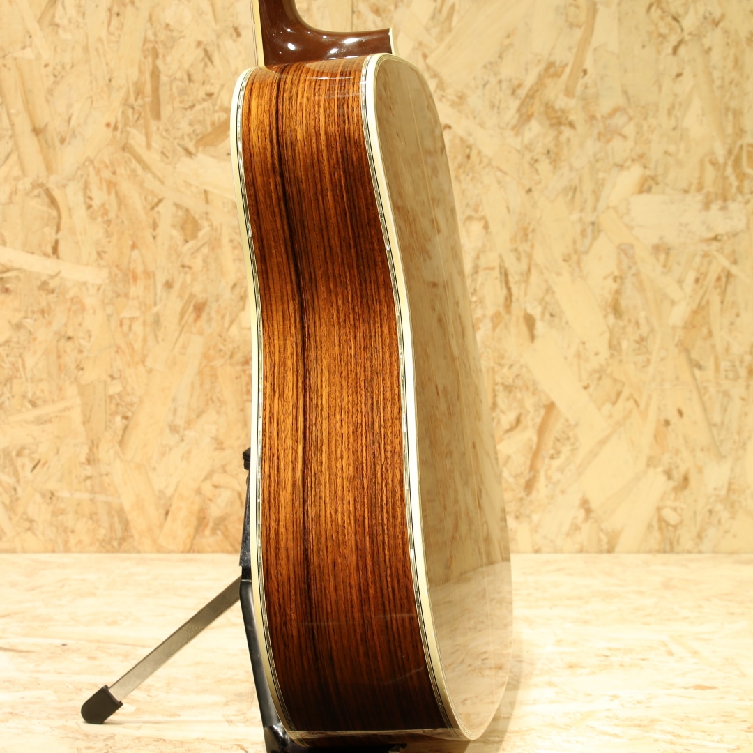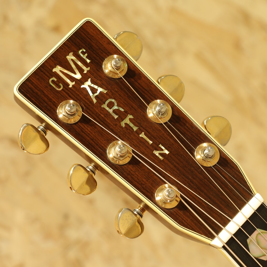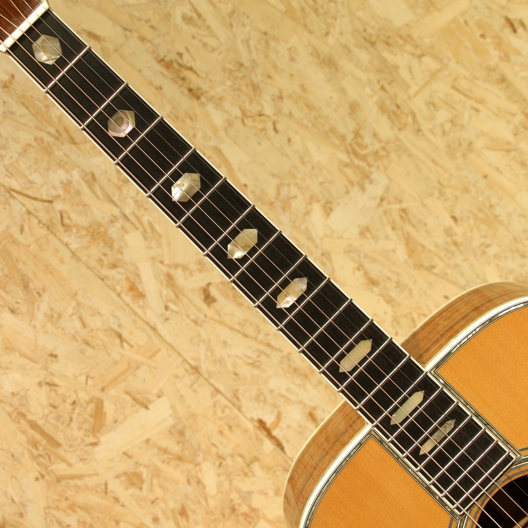 マーチン"D-45"はカントリーシンガー"Gene Autry(ジーン・オートリー)"からのからの特別オーダーから生まれたマーチンギターの最高級機種。1968年にマイク・ロングワース氏によって復活を遂げ、後のフォークシーンに多大な影響を与えました。本器は1974年製。復活を遂げたD-45がジャーマンスプルースをトップ材に使用されたのは1974年まで、本器はその最終年のもの。1975年以降のシトカスプルーストップとは音色も一線を画し、フォークシーンでは偉大なレジェンドが数えきれない名作を築き上げた名器のため、憧れの的になる存在です。往年のフォークファンの耳はこのギターに育て上げられたと言っても過言ではない、高い支持を得るレアアイテムです。淡い黄色味が美しいジャーマンスプルーストップ、細かく均一で真っ直ぐ目のそろった素晴らしい柾目のローズウッドサイド&バック、マホガニーネック、エボニー指板&ブリッジ、ミルクボトルゴールドグローバーペグ、バーチカルヘッドロゴ、アバロンヘキサゴン指板インレイ、ソリッドアバロンロゼッタ&トリム、スクエアネックトラスロッド。ノンスキャロップドXブレイシングが持つ重厚さと本来の音色が持つ基音の太さ。密度が高く、陶器を硬いもので弾いたような上品で硬質な倍音。一度爪弾けば途端にノスタルジックに切なく広がるその音色は瞬く間に古き良き時代、胸をときめかせ、夢中にレコードを聴いた頃にタイムスリップさせられます。これまでD-45に憧れを抱いた方が数々の年代のD-45を渡り歩き、この時代の正解を聴いて着地するというお姿を多く見てきました。ガードに沿ったマーティンクラック修正跡あり、裏面より補強されています。オリジナルのピックガードははがれやすく、ピックガードはマーティンクラックを隠すようにオーバーサイズにリプレイス。ボディー全体にリフィニッシュ。光に透かすとわずかに下層に弾き傷跡などが見える角度がありますが美しい仕上げでネックのジョイントや指板との接合面、ブリッジ接合面に関しても吹き溜まりもなく、各パーツを取り外して丁寧に行ったリフィニッシュです。D-45の美しい風合いを損なわずその美しさを閉じ込めています。ネックは美しい状態をキープ、サドルの出代の量、バランスも申し分なし。ストレスも全くなくとても弾きやすい状態をキープしており、大事に大事にされたギターだからこその費用をかけての手入れをされている個体です。1974年までの限られたジャーマントップ期のD45は年々入手困難となっており、往年フォーカーなら一度は夢見るギター。リフィニッシュモノのため、相場からは破格のご提示価格となります。高騰が進みすぎて諦めていた方にもぜひご検討をお勧めしたい一品。人生は一度、悔いなく手にしたい名器です。状態良好のマーチンブルーケース付属。早い者勝ちです。