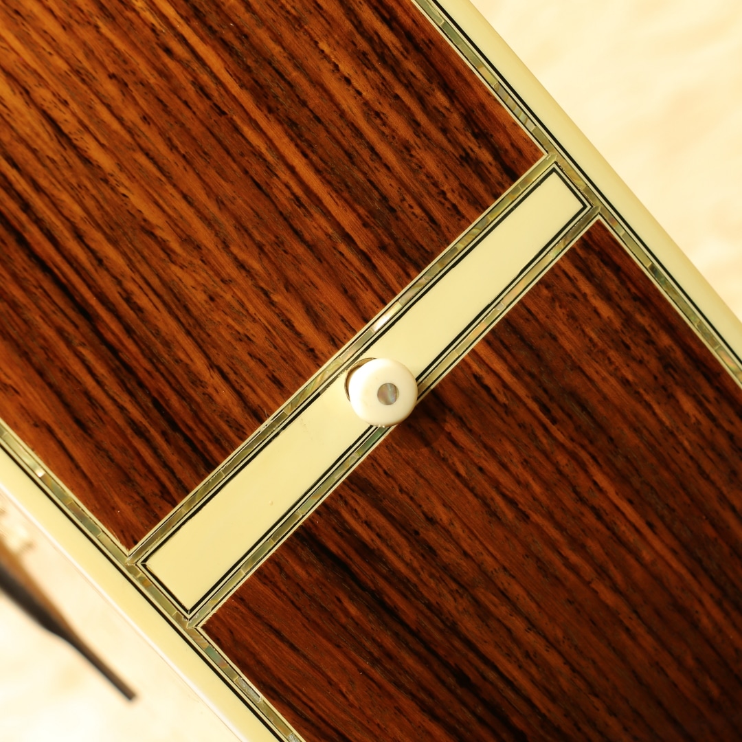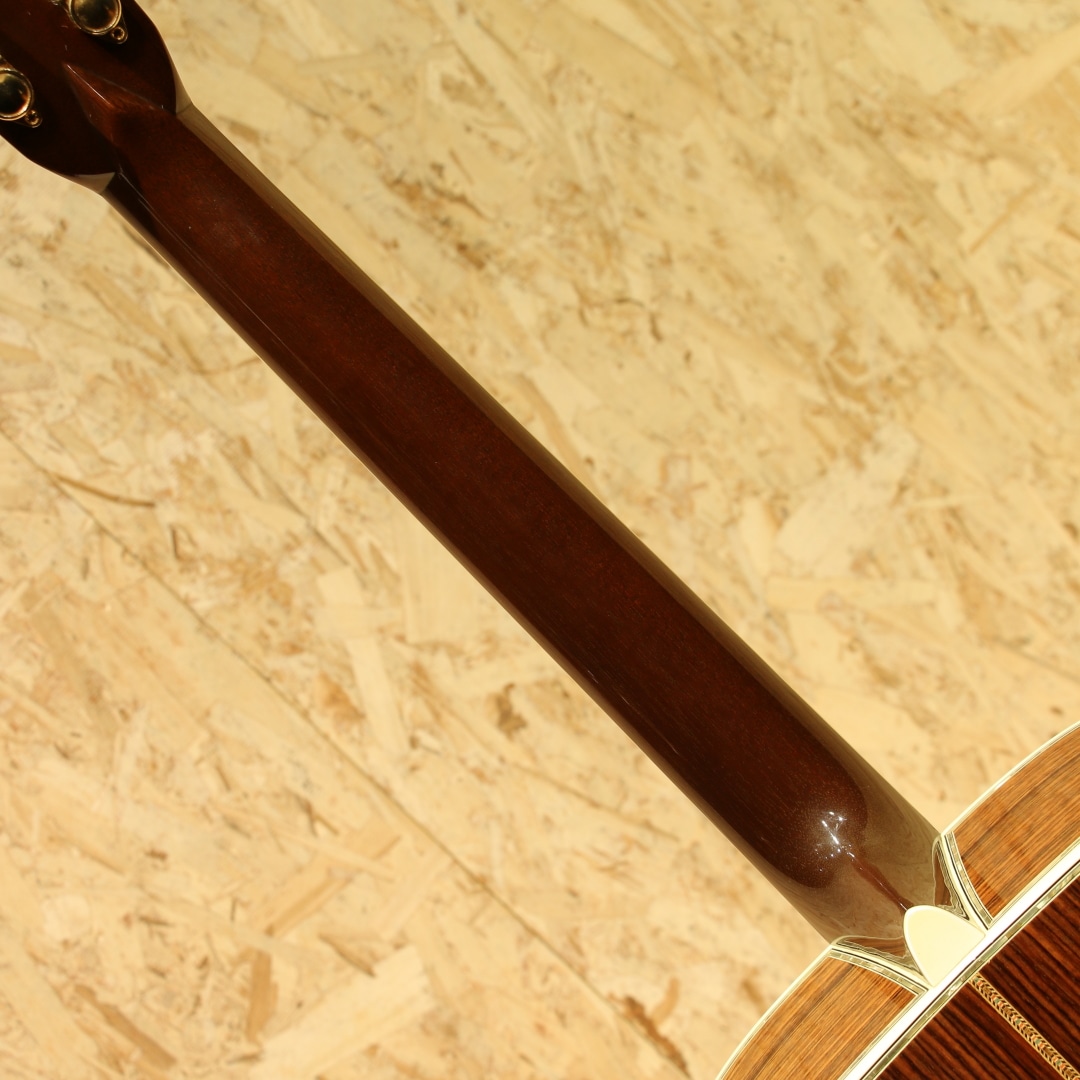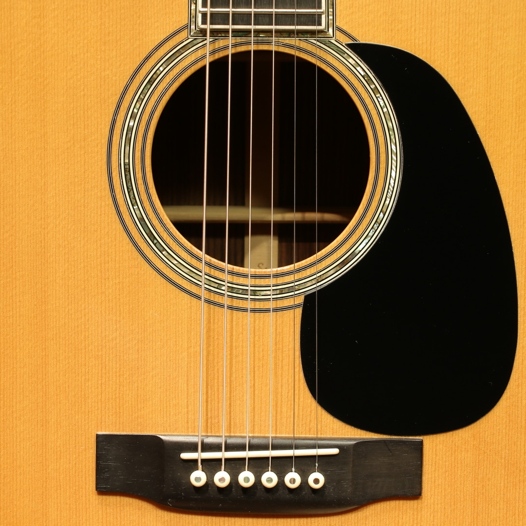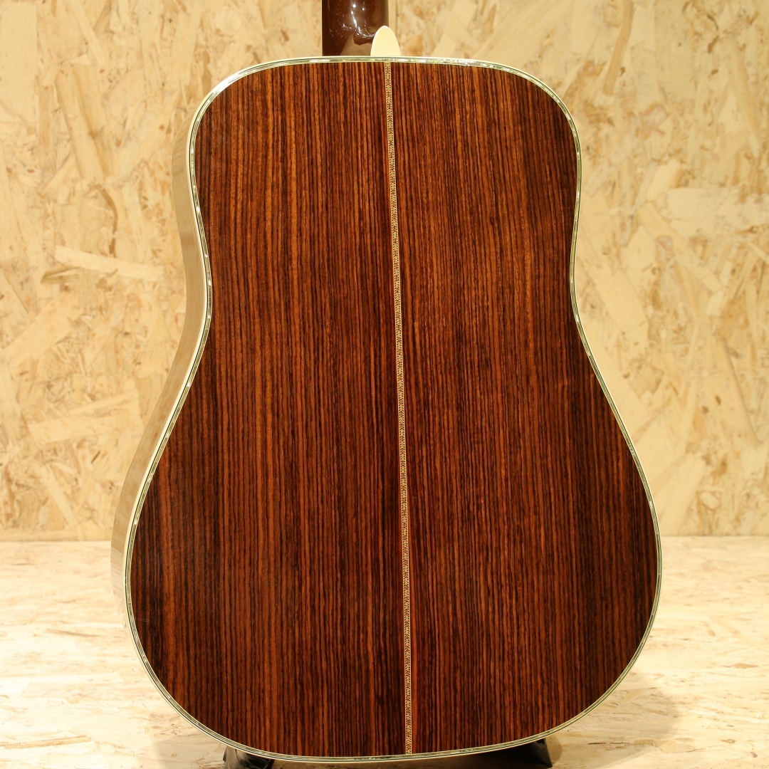 マーチン"D-45"はカントリーシンガー"Gene Autry(ジーン・オートリー)"からのからの特別オーダーから生まれたマーチンギターの最高級機種。1968年にマイク・ロングワース氏によって復活を遂げ、後のフォークシーンに多大な影響を与えました。本器は1974年製。復活を遂げたD-45がジャーマンスプルースをトップ材に使用されたのは1974年まで、本器はその最終年のもの。1975年以降のシトカスプルーストップとは音色も一線を画し、フォークシーンでは偉大なレジェンドが数えきれない名作を築き上げた名器のため、憧れの的になる存在です。往年のフォークファンの耳はこのギターに育て上げられたと言っても過言ではない、高い支持を得るレアアイテムです。淡い黄色味が美しいジャーマンスプルーストップ、細かく均一で真っ直ぐ目のそろった素晴らしい柾目のローズウッドサイド&バック、マホガニーネック、エボニー指板&ブリッジ、ミルクボトルゴールドグローバーペグ、バーチカルヘッドロゴ、アバロンヘキサゴン指板インレイ、ソリッドアバロンロゼッタ&トリム、スクエアネックトラスロッド。ノンスキャロップドXブレイシングが持つ重厚さと本来の音色が持つ基音の太さ。密度が高く、陶器を硬いもので弾いたような上品で硬質な倍音。一度爪弾けば途端にノスタルジックに切なく広がるその音色は瞬く間に古き良き時代、胸をときめかせ、夢中にレコードを聴いた頃にタイムスリップさせられます。これまでD-45に憧れを抱いた方が数々の年代のD-45を渡り歩き、この時代の正解を聴いて着地するというお姿を多く見てきました。ガードに沿ったマーティンクラック修正跡あり、裏面より補強されています。オリジナルのピックガードははがれやすく、ピックガードはマーティンクラックを隠すようにオーバーサイズにリプレイス。ボディー全体にリフィニッシュ。光に透かすとわずかに下層に弾き傷跡などが見える角度がありますが美しい仕上げでネックのジョイントや指板との接合面、ブリッジ接合面に関しても吹き溜まりもなく、各パーツを取り外して丁寧に行ったリフィニッシュです。D-45の美しい風合いを損なわずその美しさを閉じ込めています。ネックは美しい状態をキープ、サドルの出代の量、バランスも申し分なし。ストレスも全くなくとても弾きやすい状態をキープしており、大事に大事にされたギターだからこその費用をかけての手入れをされている個体です。1974年までの限られたジャーマントップ期のD45は年々入手困難となっており、往年フォーカーなら一度は夢見るギター。リフィニッシュモノのため、相場からは破格のご提示価格となります。高騰が進みすぎて諦めていた方にもぜひご検討をお勧めしたい一品。人生は一度、悔いなく手にしたい名器です。状態良好のマーチンブルーケース付属。早い者勝ちです。