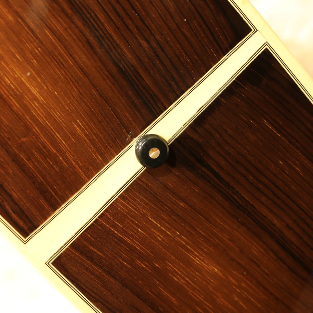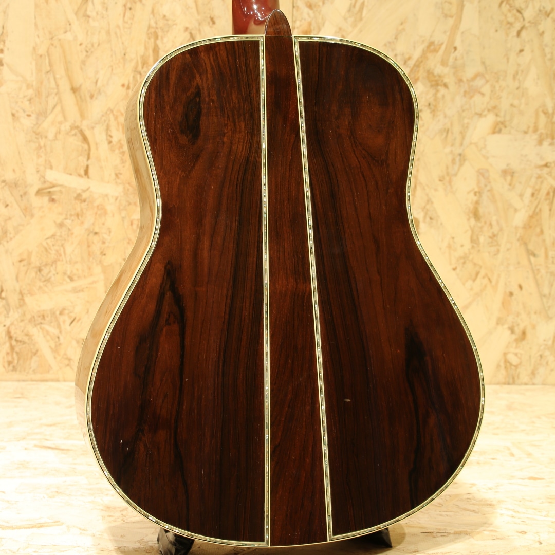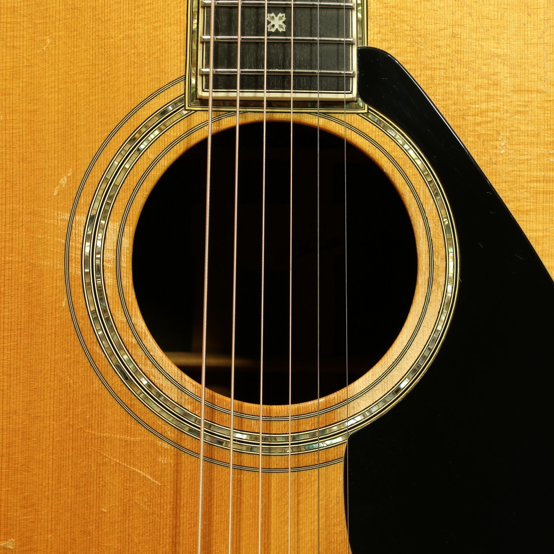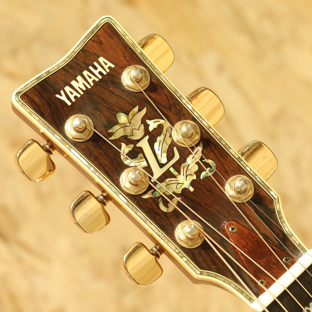 日本が世界に誇る楽器メーカー"YAMAHA”。ギターにおいても数々の銘器を産み出し、今なお進化を続ける日本発ブランド。日本におけるアコースティックギター黎明期よりその歩みを共にするヤマハフォークギター"FG"シリーズの上位モデルとして、1974年よりラインナップするLシリーズ。"豪華"を意味する"Luxury"の頭文字を冠し、その名の通りゴージャスなルックスとゴージャスなサウンドは、今も変わらずヤマハアコースティックギターのフラッグシップに位置する代表シリーズです。本器は"L-55 Custom"。1980年、最高の材を使い、当時の持てる技術をすべて注ぎ込んだLシリーズのフラッグシップモデルとして発売されたモデルで、他のモデルも変化を遂げラインナップが一新されました。本器はそんな発売初年度製造の1980年製の1本。トップには目の詰まった最高級エゾ松、サイド&バックは濃い色味の美しい最高級ハカランダで、バックは3ピースです。ワンピースマホガニーネック、エボニー指板&ブリッジ、TM-50Gペグ、ハカランダ化粧板、アバロンヘッド&指板インレイ、アバロンロゼッタ&トリム、ノンスキャロップド・Xブレイシング。ヤマハサウンドを語る上で外せない要素を詰め込んだ見事なサウンド。煌びやかでコシがあり、どこまでも届く様な芯のあるトーン。1弦から6弦までバランスよく淀みない響き、力強いジャンボサイズならではのボリューム。つま弾けば優しく色っぽく、叩けばドカンと来るレスポンスは、この当時のヤマハならではのサウンドです。しっかりと弾き込まれており、サウンドホール回りも塗装が剥げるほどのピックスクラッチやネック裏やボディー全体的にも多くの打痕傷やひっかき傷などがある事は否めませんがそのおかげで流石のサウンド、ファットで爆発的なサウンドは長年使用の賜物です。プレイアビリティーに関しましては幾らかのフレットの減りは見られますが、全く問題なくご使用に耐える範囲で、ネックコンディションも良好、弾きやすいアクションを保っています。幾分かの剥がれもありますがペグの光沢も保っており高ポイント。テリー中本氏のサイン入り期のヤマハの凄さを再認識させられます。初年度ものの流通は少なくレア。ヤマハファンは是非この機会に手に入れて頂きたい1本です。