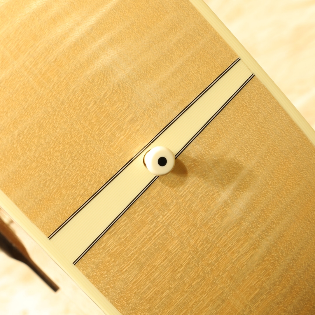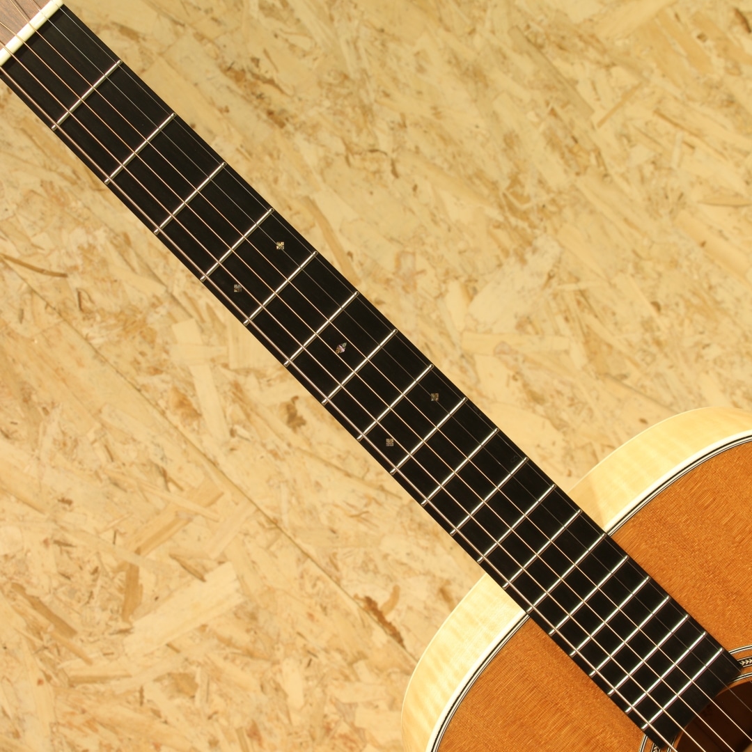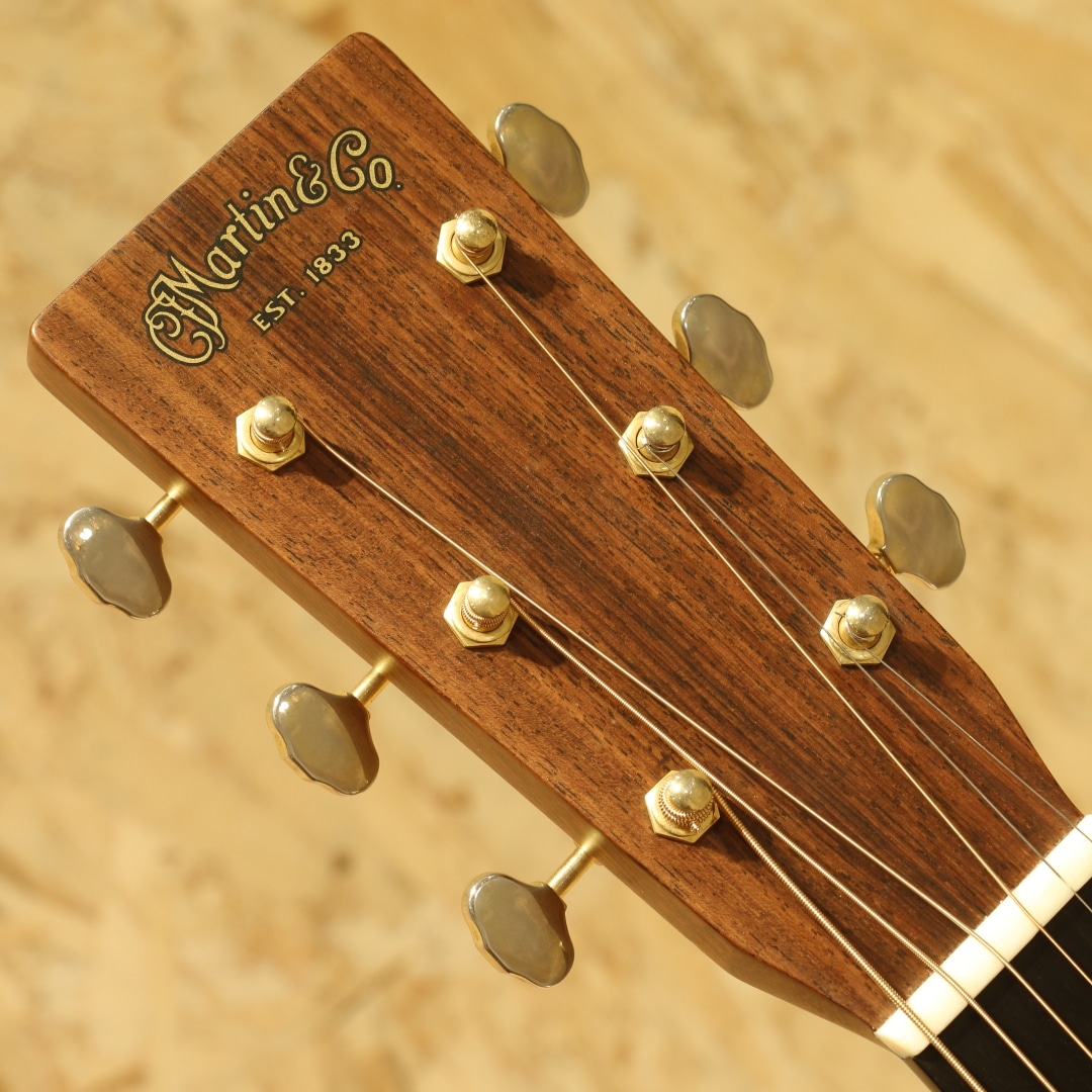 現マーチン工場の中でも、卓越した技術と豊富な経験から至極のギターを造り出す"Martin Custom Shop"。ここ数年一際話題を集めるオーセンティックシリーズの製作をはじめ、高い完成度を誇るカスタムモデルを製造するトップクラスの部門。レギュラーモデルとは一線を画す仕上がりを誇ります。本器はカスタムショップにて製作が行われた”CTM D-28 Premium Sitka European Flame Maple”。2014年製USED品。トップにはD45に使用されるプレミアムグレードのシトカスプルース、サイド&バックにはフレイム杢の入ったヨーロピアンメイプルを配した珍しい仕様。ジェニュインマホガニーネック、44.5mmナット幅、パフォーミングアーティストネックシェイプ、ブラックエボニー指板&ブリッジ、ロングサドル、アバロンダイアモンドスクエア指板ポジション、グローバーオープンバックバタービンノブゴールドペグ、ベッコウ柄ピックガード、オールドスタイルヘッドロゴ、アイボロイドバインディング、2wayアジャスタブルロッド、ノンスキャロップドXブレイシング。オールドの雰囲気を持ち、独自解釈のアレンジを施すことで珍しい仕様に仕上がっている本器。ロングサドルやアイボロイドバインディング、オープンバックペグなどはオールドスタイルを踏襲しています。何よりも特筆すべきはサイドバックのメイプル材でしょう。硬い特性としなやかさを両立する材であり、やや広めのレンジ感と中低域の甘さや暖かみを感じさせる響き、ラウドさを持った材です。その特性がサウンドに反映されており、通常のローズウッドに比べてウォームさが際立ったトーン。強くかき鳴らせば厚み感のあるラウドなサウンドを、繊細なタッチ感ではメロウさを伴った響きを生み出してくれます。作る環境や工程が違えば音にも変化が生まれており、音の情報量、密度が多くなりレンジ感も広く透明感のあるサウンドを獲得しています。レギュラーのD28とは異なった個性を与えられた1本です。ボディくびれ4か所は過去にバインディング剥がれを修正した跡が見られますが、近年マーチンではよく見られるモノで致し方ないものと言えるでしょう。ボディバック面6弦側ボトムに爪が当たったような当てキズ、ヘッドやボディの薄い擦れキズ、ペグつまみのゴールドは若干の経年感こそ感じられますが、比較的キレイなコンディションをキープ。ネック周りの状態はバッチリ良好に保たれており、演奏性良し。珍しい組み合わせのD28。カスタムならではの響きとメイプルらしいトーンを体感できる1本です。是非お試しくださいませ。