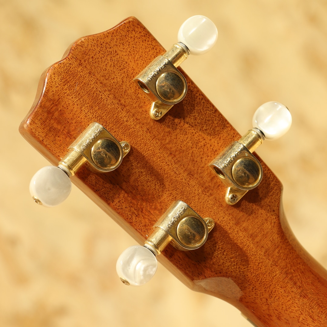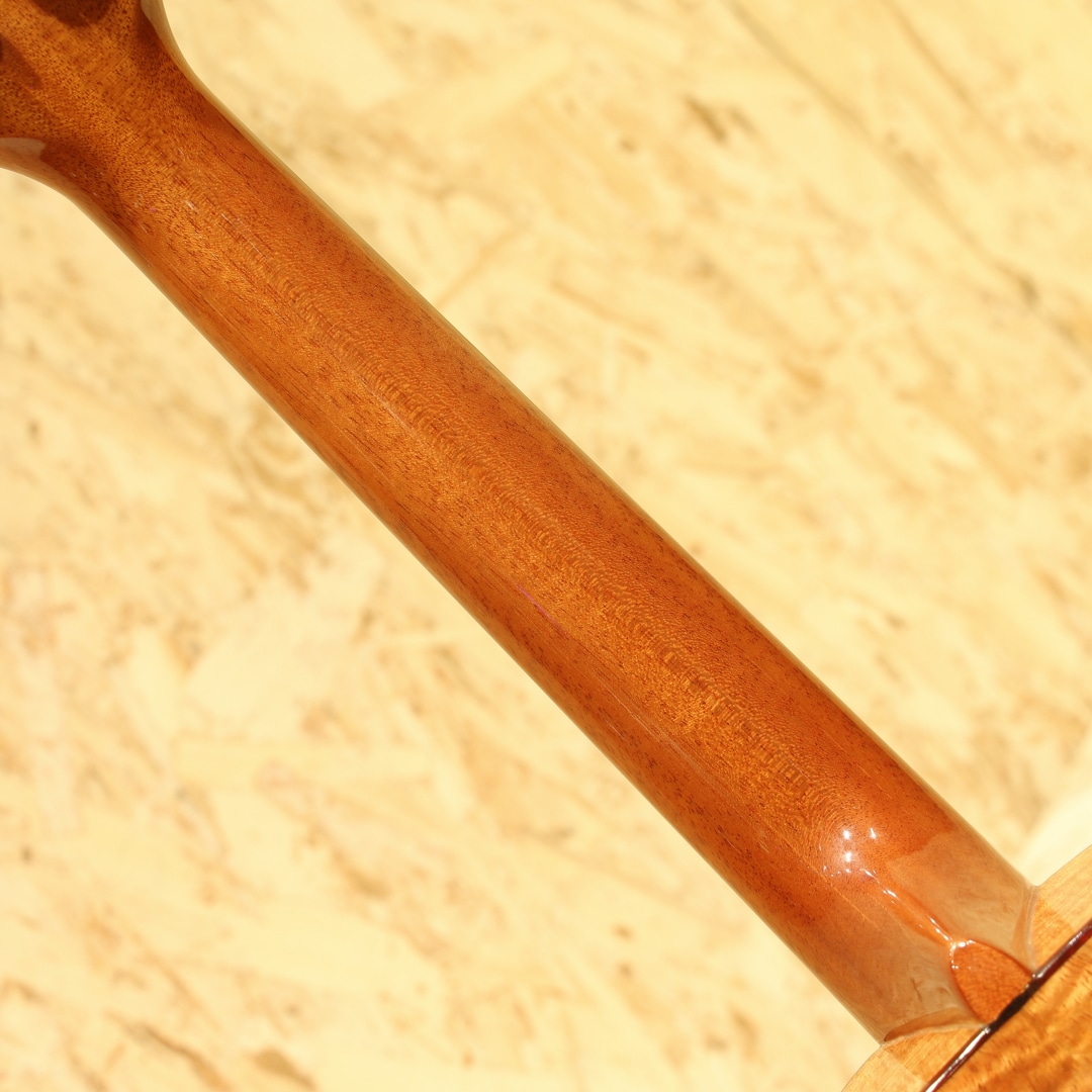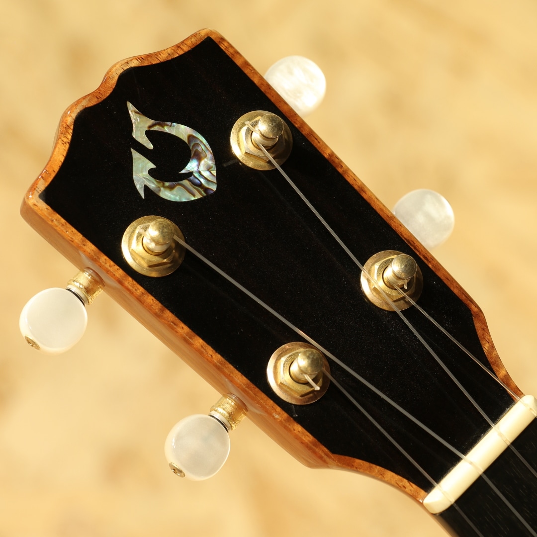 1993年に設立されたメイド・イン・ハワイブランド"G-string"。設立から2000年後期頃までは複数の職人によって手掛けられており、現在はアメリカ本土に工房を移しデレク・シミズ氏により製作されています。本器はラスベガスに移住してからの1本、ハワイアンコアボディのテナーモデルです。マホガニーネック、エボニー指板&ブリッジ、グローバー ゴールドペグ、アバロン指板ドットインレイ&ロゼッタ。以前は手の届きやすい価格帯にて幅広く展開しハワイアンブランドの3大ブランドと称されていました。現在は手工製作となり価格も高騰しています。ハワイブランドなだけありフィギュアード杢の入った良質な材を使用できる点も魅力の一つでもあります。本器も細かく揺らぐ杢目を持つ1本、デレク氏が一人になってからの手工作品。ハワイ時代とは変わり装飾などにも細やかな技術を見せるようになりました。テナーサイズのハリのある響き、ハワイアンコア特有の艶やかで甘い響き。甘いだけではなく、ハキハキとした押し出し感のあるサウンドを堪能できる1本です。弾け感の心地よい音色です。メロディラインを弾くソロウクレレにも十分に対応できるトーン、歌モノの後ろで弾いても良いでしょう。ボディエンドには過去ピックアップを取り付けていたのかエンドジャックサイズに拡張されていますが、現在では同径のピンを装着されています。ボディ表面に極薄い擦れキズこそ見られますが、非常に状態良く保たれている個体。当てキズも目立つものは見られずでキレイなまま保たれています。ネックも程よい丸み、薄平の若干薄めグリップで演奏性も申し分ありません。デレク氏の創る手工テナーウクレレ、個人になってからのウクレレです。その弾きごたえのあるサウンドを是非お手元でご堪能下さいませ。