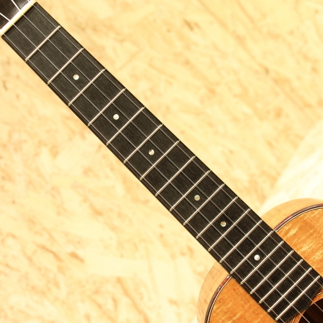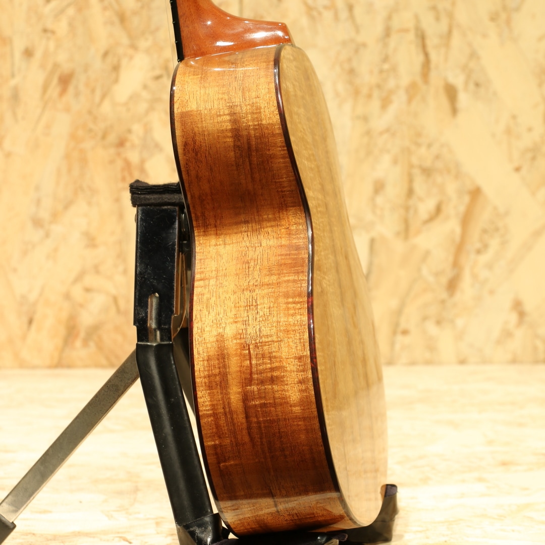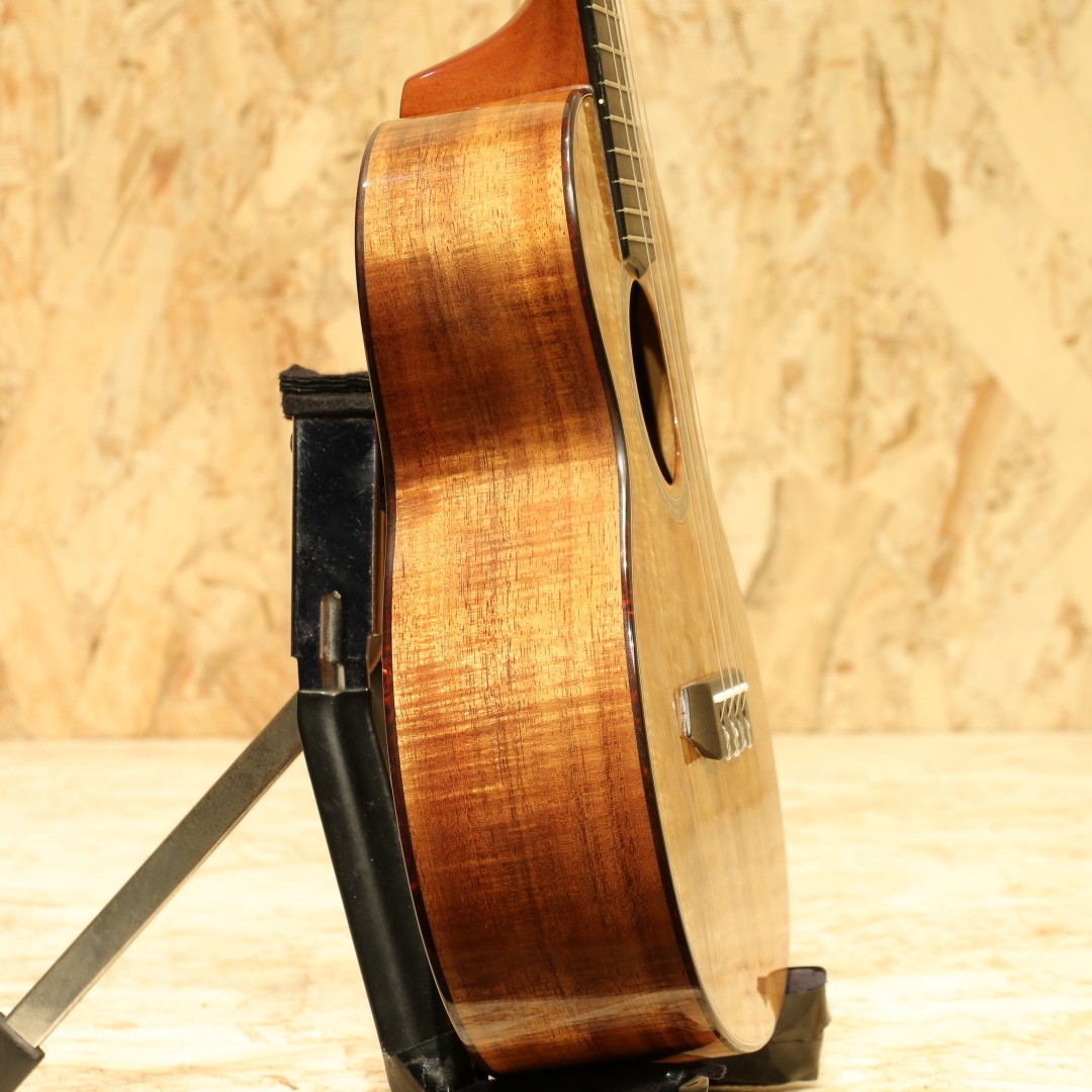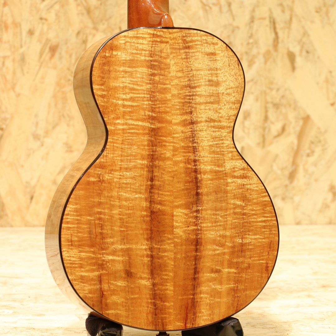 1993年に設立されたメイド・イン・ハワイブランド"G-string"。設立から2000年後期頃までは複数の職人によって手掛けられており、現在はアメリカ本土に工房を移しデレク・シミズ氏により製作されています。本器はラスベガスに移住してからの1本、ハワイアンコアボディのテナーモデルです。マホガニーネック、エボニー指板&ブリッジ、グローバー ゴールドペグ、アバロン指板ドットインレイ&ロゼッタ。以前は手の届きやすい価格帯にて幅広く展開しハワイアンブランドの3大ブランドと称されていました。現在は手工製作となり価格も高騰しています。ハワイブランドなだけありフィギュアード杢の入った良質な材を使用できる点も魅力の一つでもあります。本器も細かく揺らぐ杢目を持つ1本、デレク氏が一人になってからの手工作品。ハワイ時代とは変わり装飾などにも細やかな技術を見せるようになりました。テナーサイズのハリのある響き、ハワイアンコア特有の艶やかで甘い響き。甘いだけではなく、ハキハキとした押し出し感のあるサウンドを堪能できる1本です。弾け感の心地よい音色です。メロディラインを弾くソロウクレレにも十分に対応できるトーン、歌モノの後ろで弾いても良いでしょう。ボディエンドには過去ピックアップを取り付けていたのかエンドジャックサイズに拡張されていますが、現在では同径のピンを装着されています。ボディ表面に極薄い擦れキズこそ見られますが、非常に状態良く保たれている個体。当てキズも目立つものは見られずでキレイなまま保たれています。ネックも程よい丸み、薄平の若干薄めグリップで演奏性も申し分ありません。デレク氏の創る手工テナーウクレレ、個人になってからのウクレレです。その弾きごたえのあるサウンドを是非お手元でご堪能下さいませ。