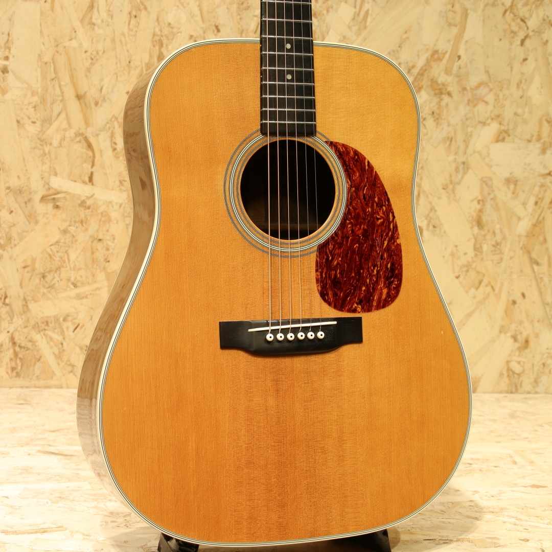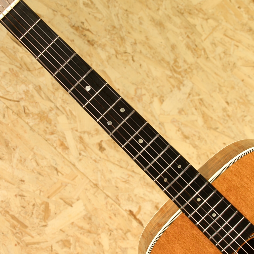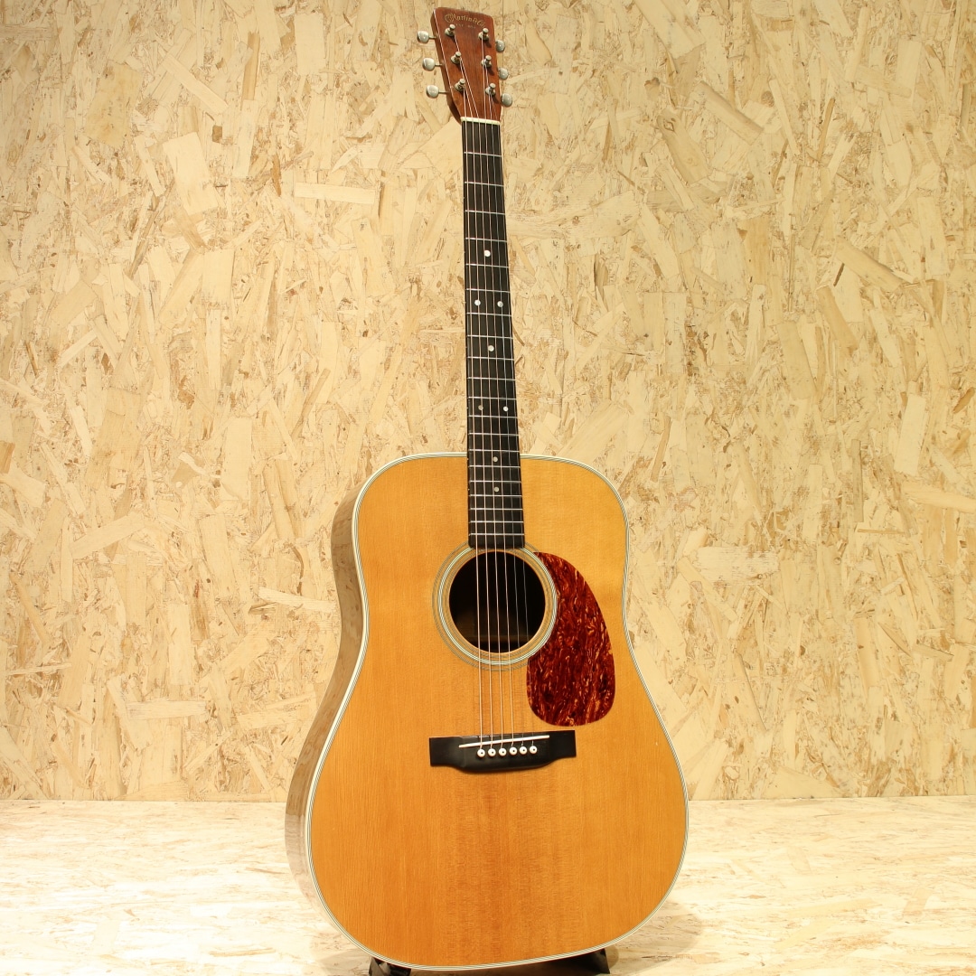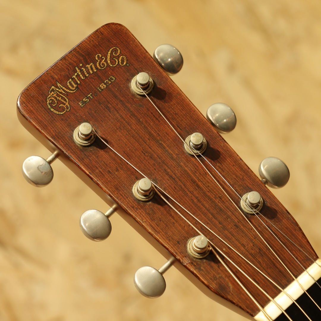マーチンギターの中で最も有名なモデル"D-28"。現在同様の14fジョイントのドレッドモデルとして1934年に誕生してから、時を超え今もなお愛されるワールドスタンダードモデル。本器は1957年製Vintage品の"D-28"。スプルーストップ、美事な柾目杢のハカランダサイド&バック、マホガニーネック、エボニー指板&ブリッジ、ロングサドル、ワッフルバッククルーソンペグ、ハカランダ化粧板、MOP指板ドット、べっ甲柄セルロイドピックガード、スチールTバーロッド、スモールメイプルブリッジプレート、ノンスキャロップドXブレイシング。1957年はXブレイシングのクロス位置が約46mmのリアシフトから約38mm位置のスタンダードXシフト(どちらもひと括りでローXとして認知されているが)に変更された過渡期の年で本器はスタンダードXに変更後の個体。どちらの時代もノンスキャロッドの仕様ですが、本器はスキャロップド加工の手入れが施されており、70年代以降にアメリカで流行った改造です。ボディー全体、ネック裏はリフィニッシュが施され、ボディーは艶あり仕上げ、ネックは艶消しのマットな仕上げ、フィニッシュに伴いピックガードもべっこう柄の近年のタイプに交換されています。サウンドはオールド50sサウンドに滑らかさを加えたようなサウンド。本来太くガチッとしたサウンドが特徴の50sですが、スキャロップの効果もあり、空気を多く含んだファットで奥行きがあるサウンド。ブライトでパンチがあり、分離のよいドライでレンジ感のあります。大事が故のお金をかけた手入れ、長年しっかりとセットアップされた個体ならでは、コシのある音色は立ち上がりもよくサスティンのきいた心地よい音色です。50sのD28はアメリカを中心にどんどん高騰を見せており、リフィニッシュもので手入れがあるからこその価格ですが、楽器としての状態、演奏性は抜群です。汎用のハードケースが付属しています。