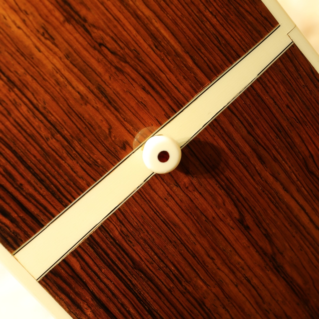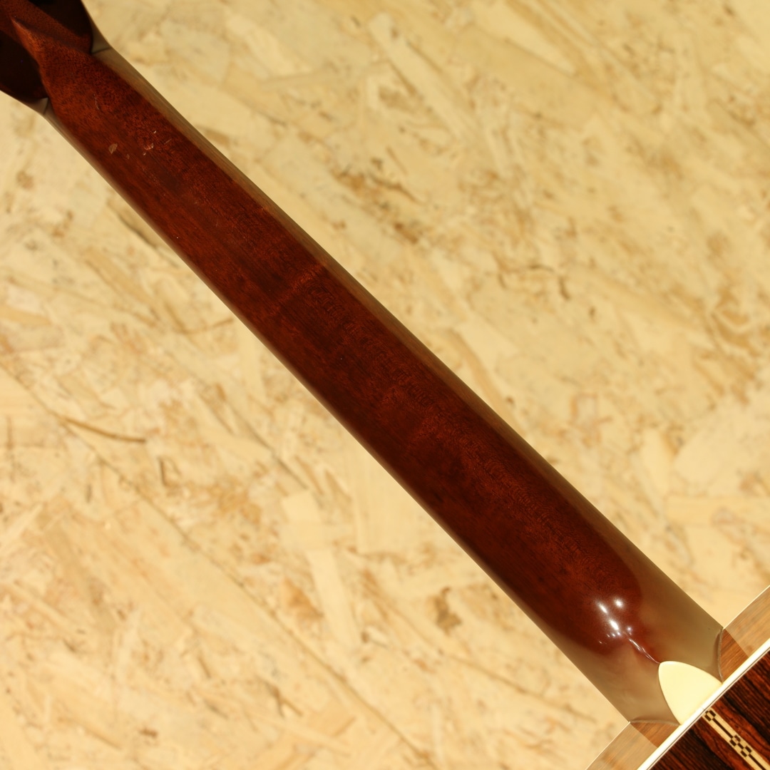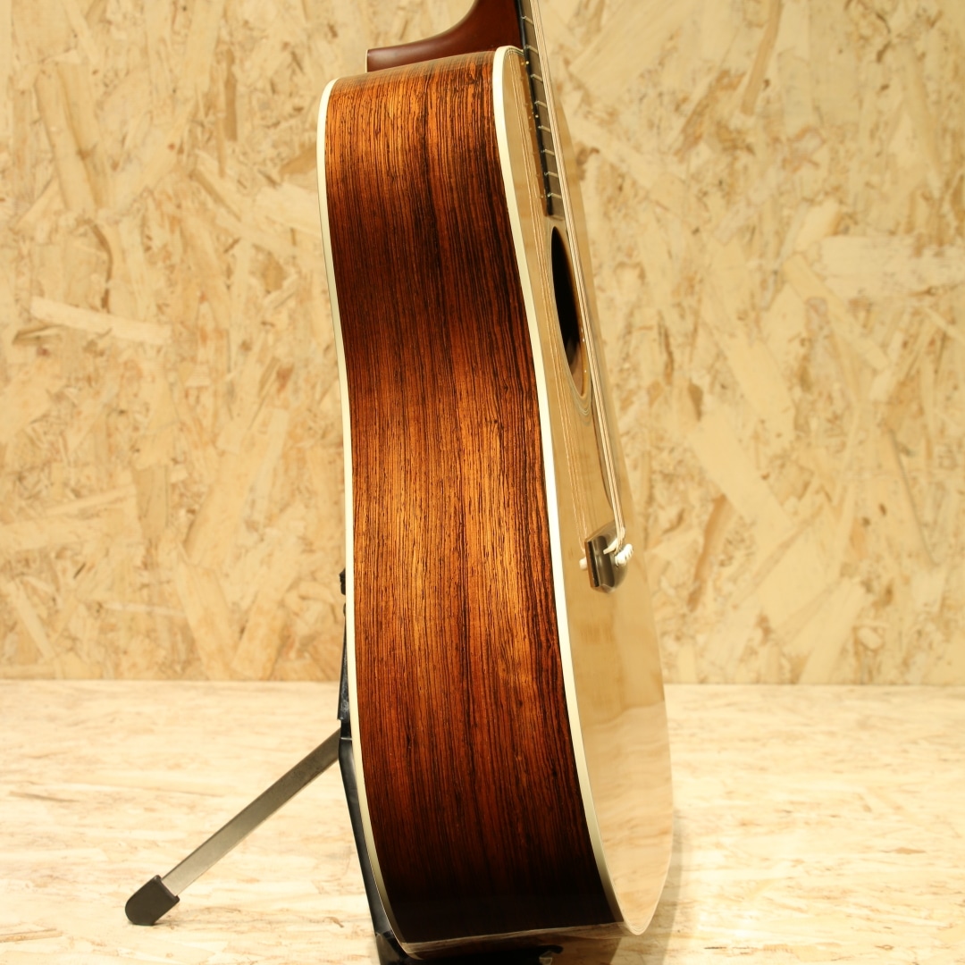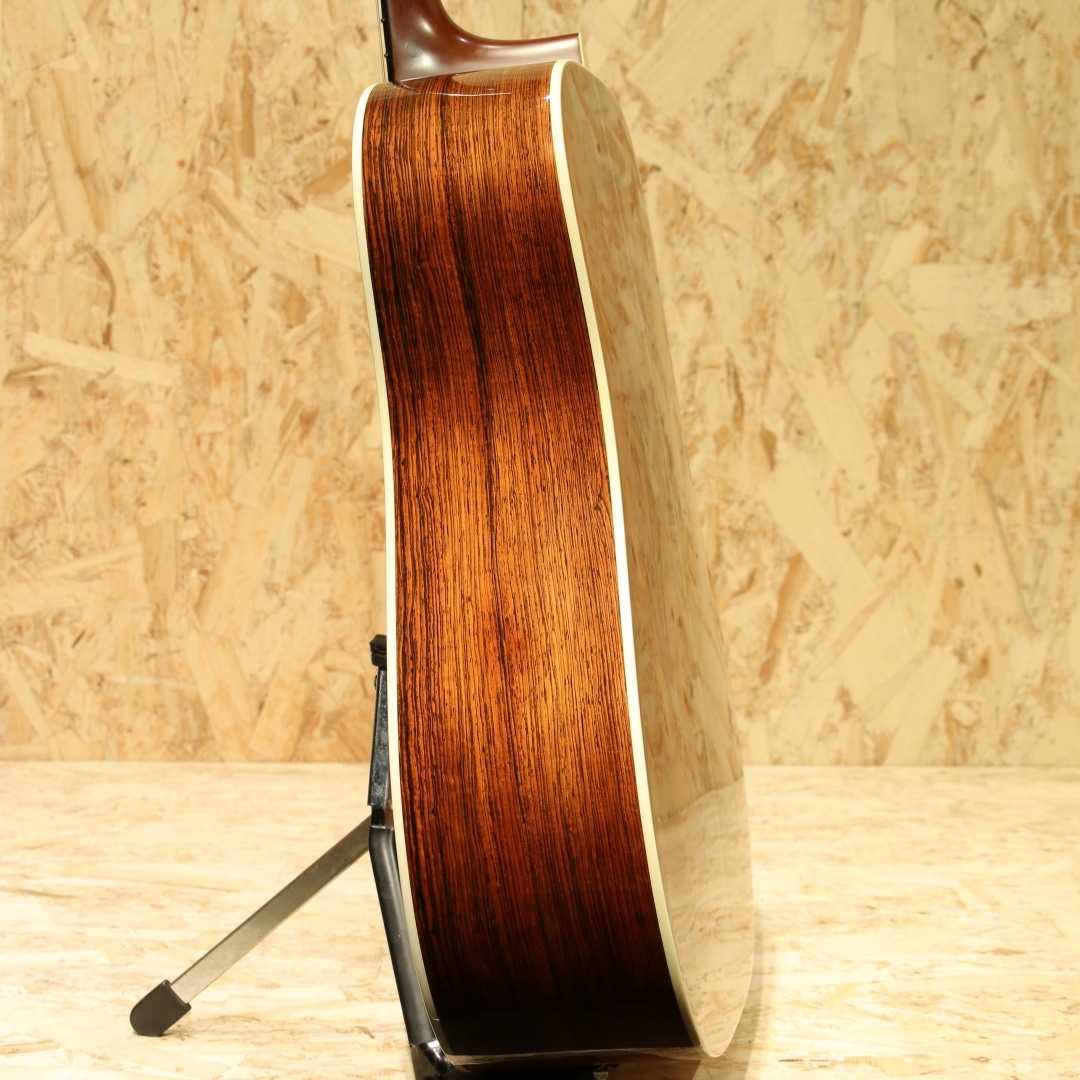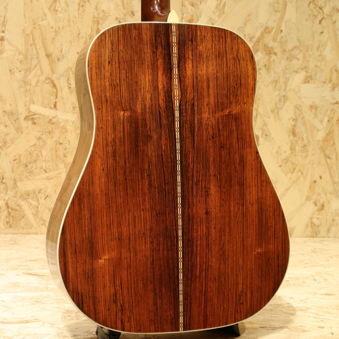 マーチンギターの中で最も有名なモデル"D-28"。現在同様の14fジョイントのドレッドモデルとして1934年に誕生してから、時を超え今もなお愛されるワールドスタンダードモデル。本器は1957年製Vintage品の"D-28"。スプルーストップ、美事な柾目杢のハカランダサイド&バック、マホガニーネック、エボニー指板&ブリッジ、ロングサドル、ワッフルバッククルーソンペグ、ハカランダ化粧板、MOP指板ドット、べっ甲柄セルロイドピックガード、スチールTバーロッド、スモールメイプルブリッジプレート、ノンスキャロップドXブレイシング。1957年はXブレイシングのクロス位置が約46mmのリアシフトから約38mm位置のスタンダードXシフト(どちらもひと括りでローXとして認知されているが)に変更された過渡期の年で本器はスタンダードXに変更後の個体。どちらの時代もノンスキャロッドの仕様ですが、本器はスキャロップド加工の手入れが施されており、70年代以降にアメリカで流行った改造です。ボディー全体、ネック裏はリフィニッシュが施され、ボディーは艶あり仕上げ、ネックは艶消しのマットな仕上げ、フィニッシュに伴いピックガードもべっこう柄の近年のタイプに交換されています。サウンドはオールド50sサウンドに滑らかさを加えたようなサウンド。本来太くガチッとしたサウンドが特徴の50sですが、スキャロップの効果もあり、空気を多く含んだファットで奥行きがあるサウンド。ブライトでパンチがあり、分離のよいドライでレンジ感のあります。大事が故のお金をかけた手入れ、長年しっかりとセットアップされた個体ならでは、コシのある音色は立ち上がりもよくサスティンのきいた心地よい音色です。50sのD28はアメリカを中心にどんどん高騰を見せており、リフィニッシュもので手入れがあるからこその価格ですが、楽器としての状態、演奏性は抜群です。汎用のハードケースが付属しています。