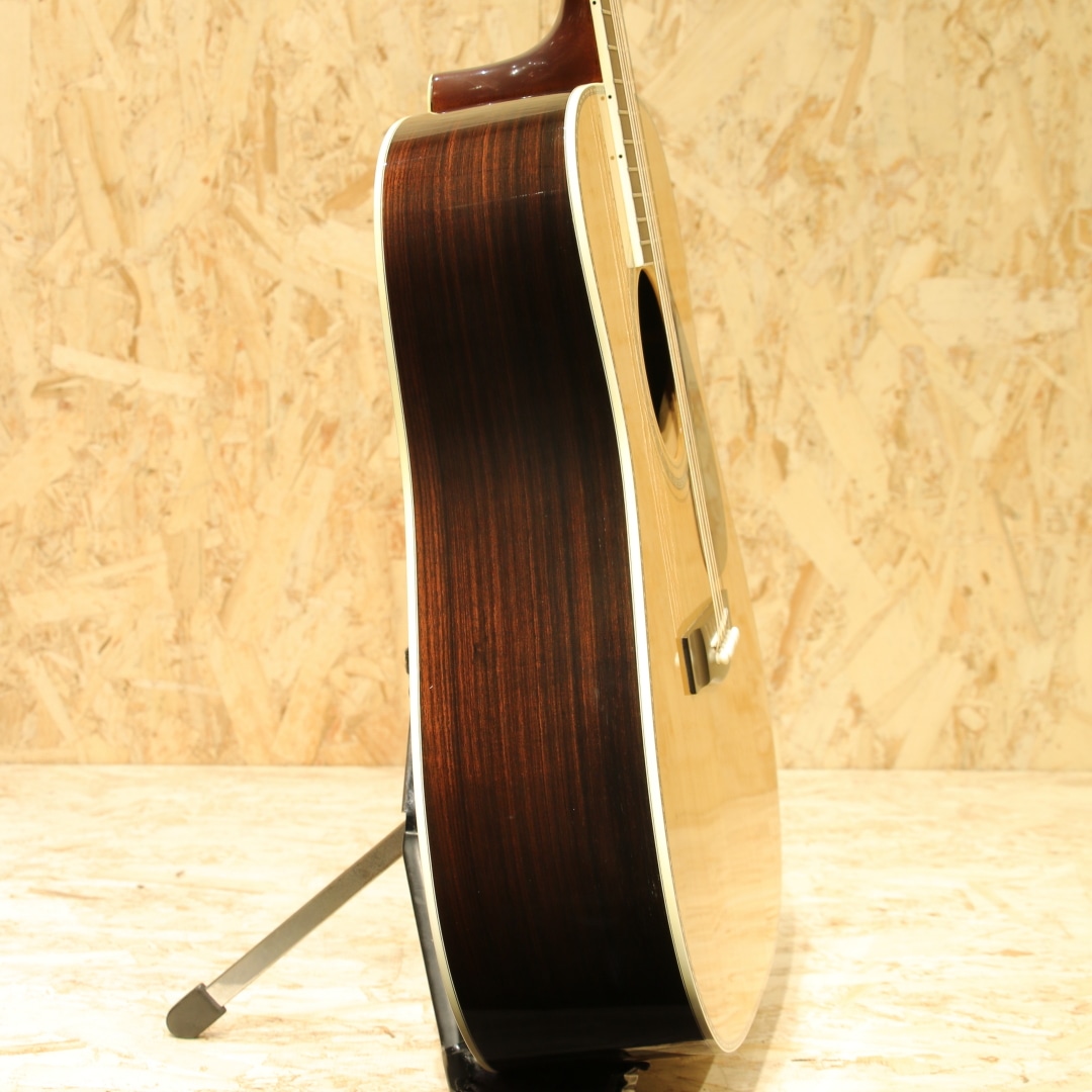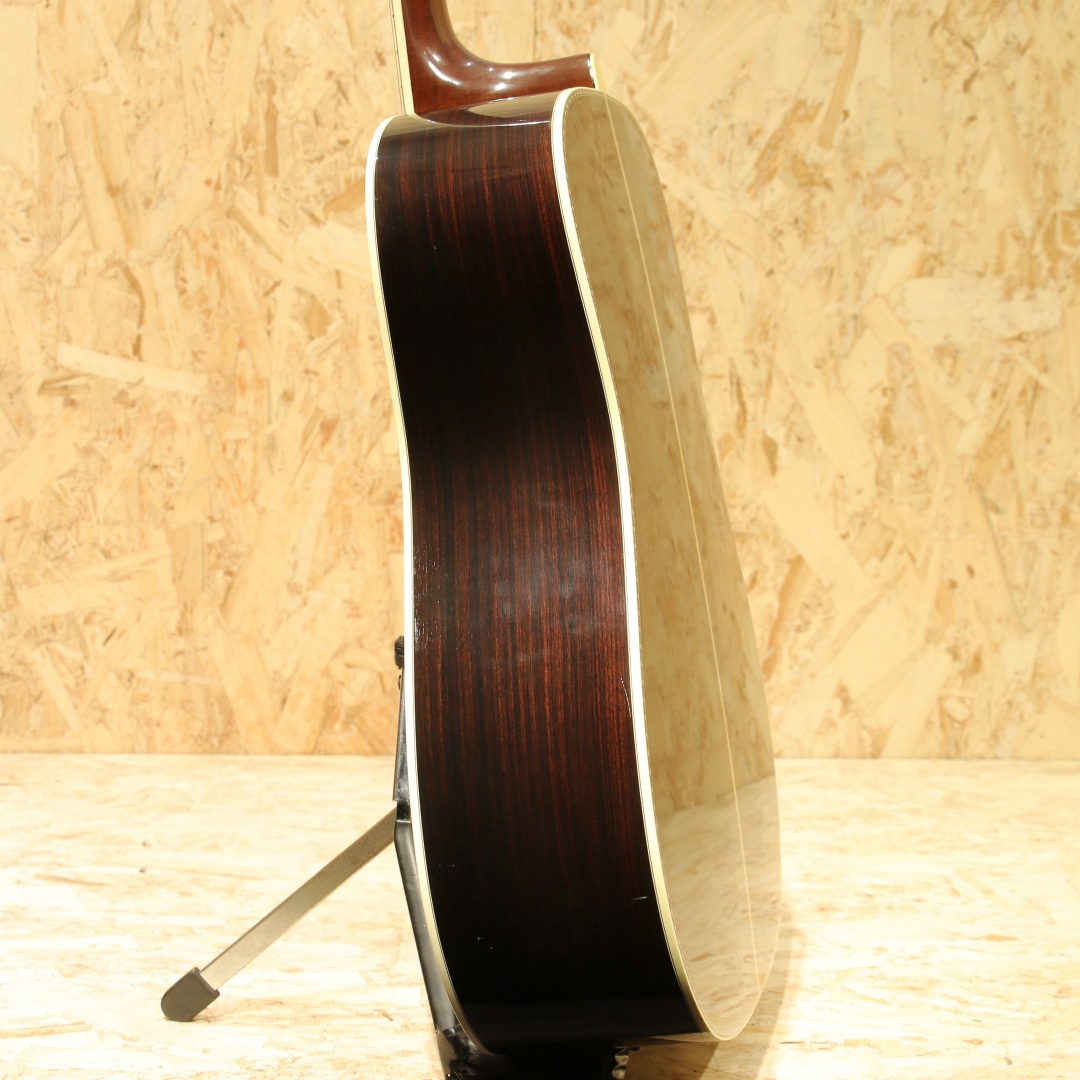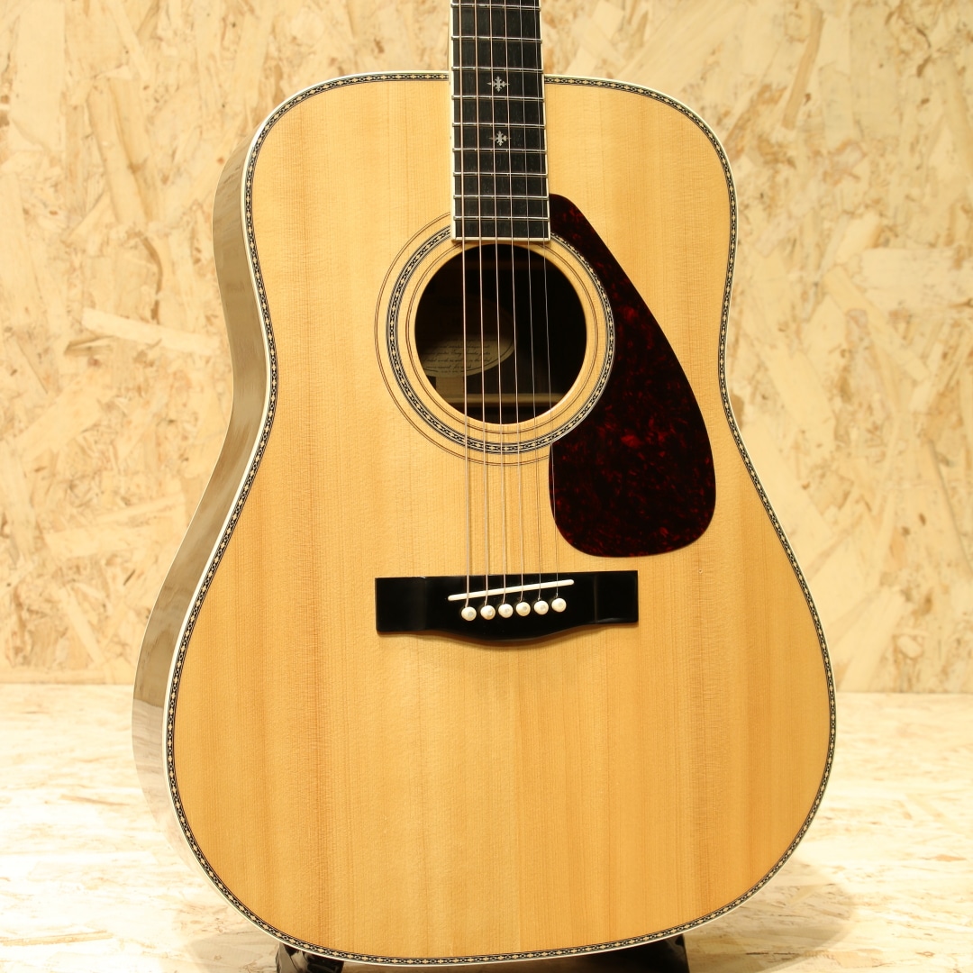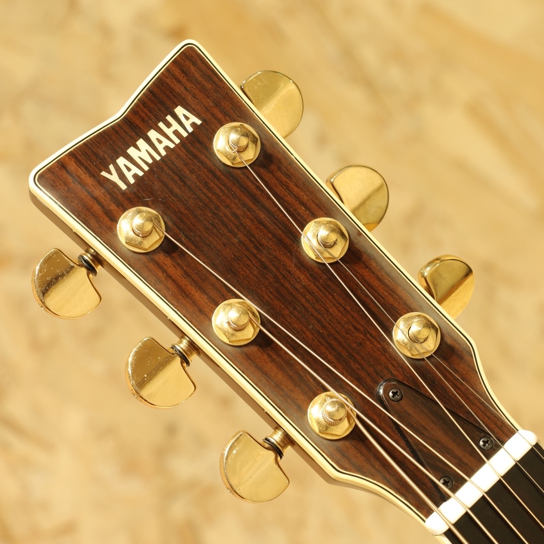 ヤマハLシリーズはLuxuryの名を冠された高級シリーズ。現在でも脈々とLシリーズは受け継がれており、その名に恥じないヤマハ独自の仕様をふんだんに盛り込んだ人気のシリーズです。L-10は1975年に発売開始された人気の単板ドレッドノートモデル。本器は後期型の1983年製です。エゾ松トップ、パリサンドルサイド&バック、マホガニーネック、黒檀指板&ブリッジ、オリジナルゴールドロトマチックペグ、オリジナル音叉マーク入りロッドカバー、オリジナルダイアモンド指板インレイ、寄木ロゼッタ、ベッコウ柄ピックガード、ノンスキャロップブレイシング。ブリッジピンは牛骨製のものへと交換されています。この時期のヤマハ独特のバリンとガラスを割ったような、クリアでボリューミなサウンドが持ち味な本器。太く芯が強いサウンドで非常に煌びやか、重厚さもありフォーキーなサウンドを奏でることが出来ます。日本のフォークを弾くにはベターになり得る1本。僅かな擦り跡や極僅かな当てキズがトップ面やバック面に見られますが、年式を考えると非常にキレイな状態をキープされています。ネックコンディションも非常に良く保たれており、サドル高も充分とまだまだ使っていけるコンディション。演奏性良好なジャパンオールドギターです。製造から40年ほど経過していることを考えると、現在なかなか見かけることも少ないほどの綺麗なコンディションのLシリーズ。当時憧れだった方、古き良きジャパンフォークがお好きな方に一度体感して頂きたい1本です。是非お手元で体感して下さい。