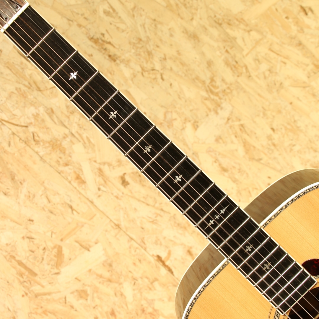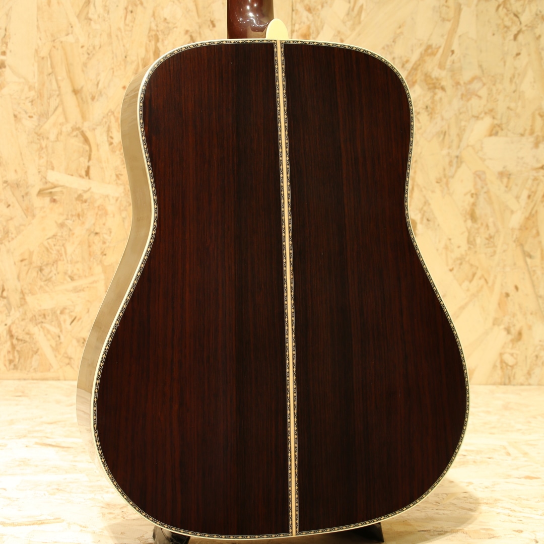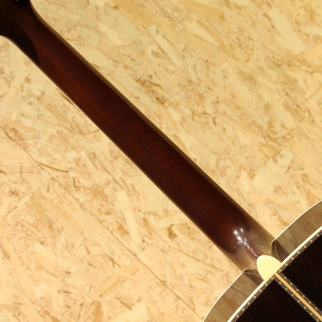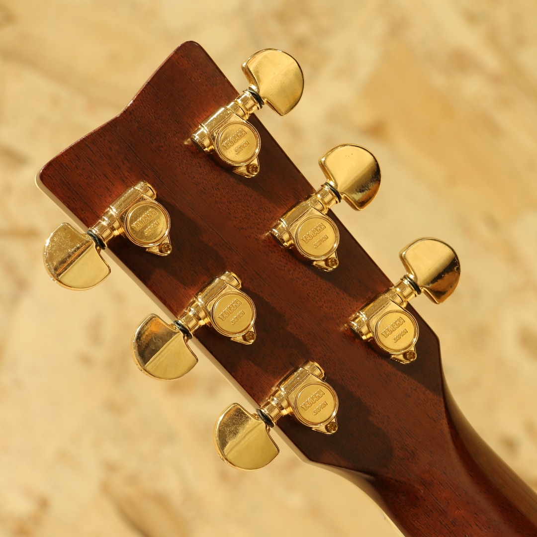 ヤマハLシリーズはLuxuryの名を冠された高級シリーズ。現在でも脈々とLシリーズは受け継がれており、その名に恥じないヤマハ独自の仕様をふんだんに盛り込んだ人気のシリーズです。L-10は1975年に発売開始された人気の単板ドレッドノートモデル。本器は後期型の1983年製です。エゾ松トップ、パリサンドルサイド&バック、マホガニーネック、黒檀指板&ブリッジ、オリジナルゴールドロトマチックペグ、オリジナル音叉マーク入りロッドカバー、オリジナルダイアモンド指板インレイ、寄木ロゼッタ、ベッコウ柄ピックガード、ノンスキャロップブレイシング。ブリッジピンは牛骨製のものへと交換されています。この時期のヤマハ独特のバリンとガラスを割ったような、クリアでボリューミなサウンドが持ち味な本器。太く芯が強いサウンドで非常に煌びやか、重厚さもありフォーキーなサウンドを奏でることが出来ます。日本のフォークを弾くにはベターになり得る1本。僅かな擦り跡や極僅かな当てキズがトップ面やバック面に見られますが、年式を考えると非常にキレイな状態をキープされています。ネックコンディションも非常に良く保たれており、サドル高も充分とまだまだ使っていけるコンディション。演奏性良好なジャパンオールドギターです。製造から40年ほど経過していることを考えると、現在なかなか見かけることも少ないほどの綺麗なコンディションのLシリーズ。当時憧れだった方、古き良きジャパンフォークがお好きな方に一度体感して頂きたい1本です。是非お手元で体感して下さい。