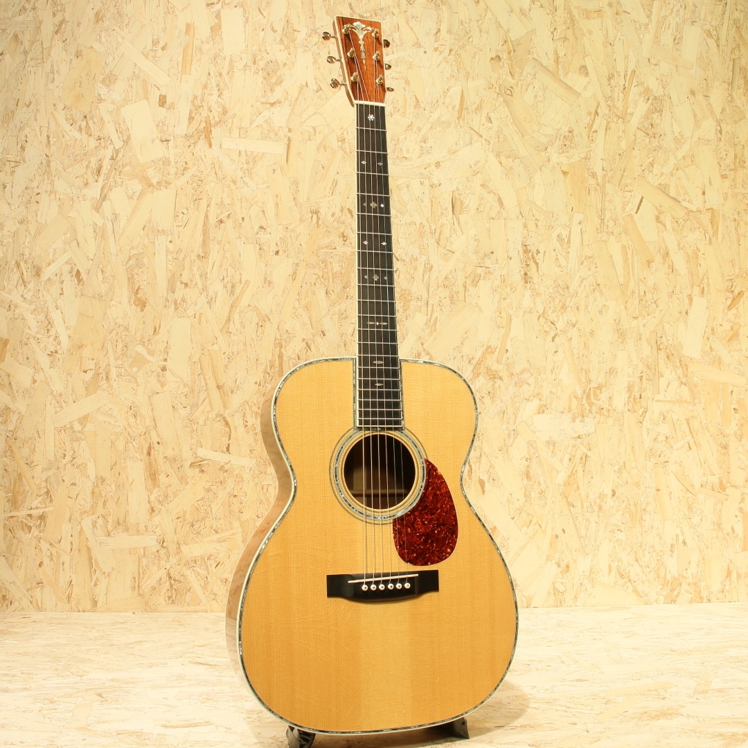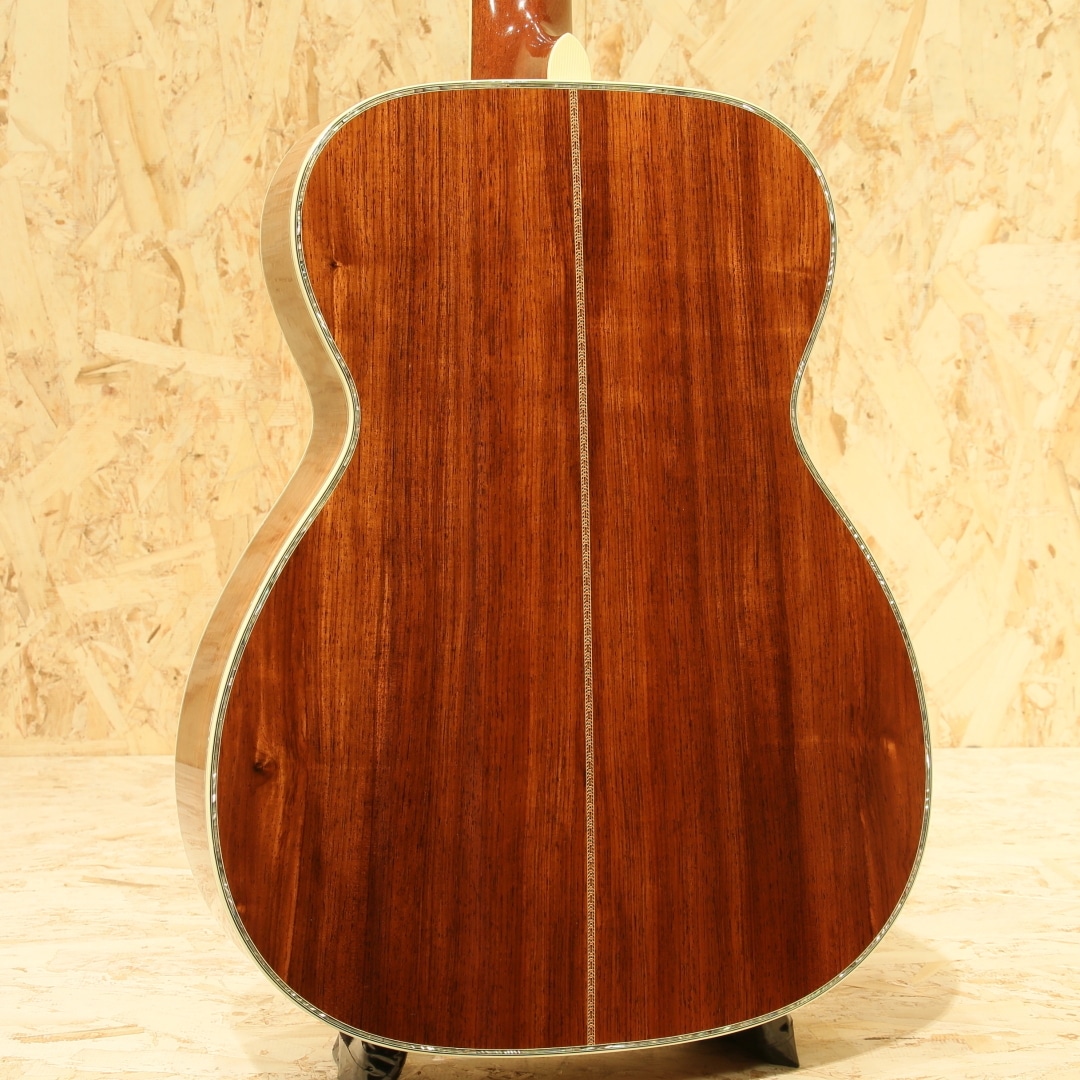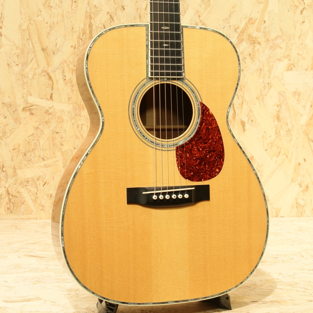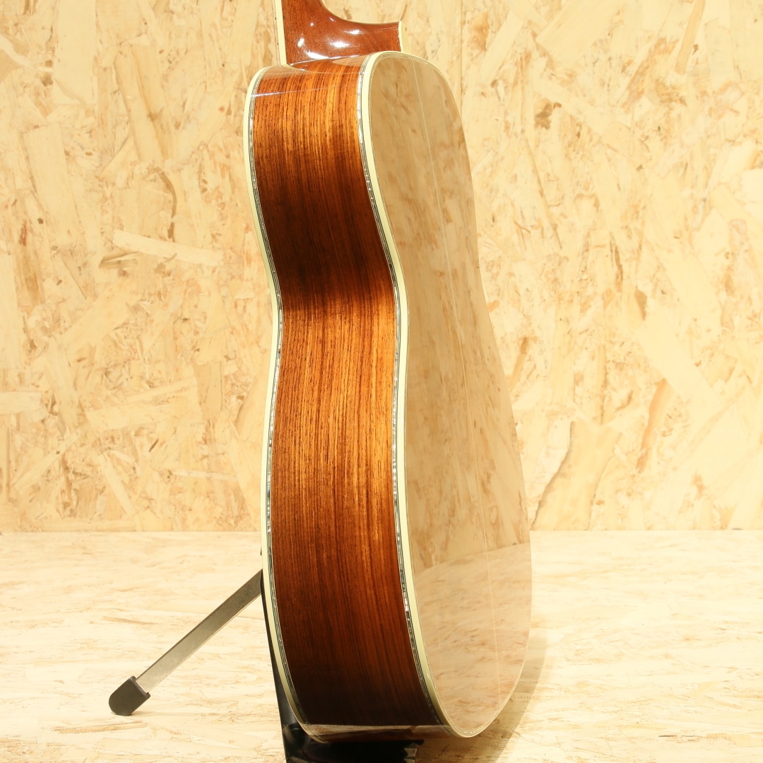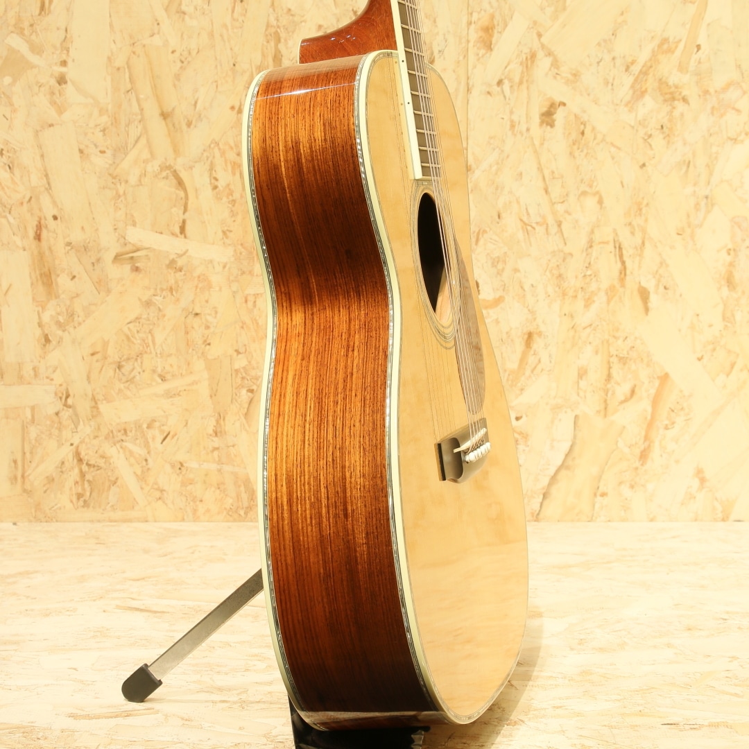 国内有数のベテランルシアー、エム・シオザキ弦楽器工房の塩﨑雅亮氏によるシーガルギター。塩﨑氏は現在世界屈指のマーティン研究家としても知られています。本器は2004年製USED品"OM-85"。最も得意とするスタイルの一つであるマーチンスタイル45の飾りを設えたゴージャスなOMモデル。トップには経年で良い色味に焼けた端正で美しいジャーマンスプルース、サイド&バックには淡い色味で重厚で比重の高い柾目杢のホンジュラスローズウッドを使用。ワンピースマホガニーネック、エボニー指板&ブリッジ、ロングサドル、ゴトー製ゴールドオープンバックペグ、スノーフレークスキャッツアイ指板インレイ、アバロンロゼッタ、トップサイドバックにあしらわれたアバロントリム、トーチインレイヘッドプレート、塗り込みのOMサイズべっ甲柄ピックガード、アイボロイドバインディング、モザイクバックストリップ、フォワードシフテッド・スキャロップド・Xブレイシング。凛としたコシの入ったサウンドで艶やかでまっすぐに減衰が少なく持続性のあるサスティン、倍音豊かで埋もれないトーン。サウンドのエッジははっきりしていながら、耳当たりはまろやか、解像度の高い音色が心地よくとても反応の良いサウンドで爪弾きでもしっかりとした音像をアウトしてくれます。ボディー箇所箇所に僅かな打痕などの小傷は見られ、オリジナルの極薄のラッカーフィニッシュにはびっしりとウェザーチェックが張り巡らされていますが、むしろオールドテイスト溢れる外観にはクールさが増しています。弦高は標準的な数値にセットアップされ、サドルマージンもかなり余裕があり今後の使用にも安心です。わずかにフレット減りも見られますが使用上問題ないレベルです。憧れのスタイル45モデル、世界にも名を馳せる実力の塩崎氏の1本。是非お手元でご体感ください。ハードケース付属。