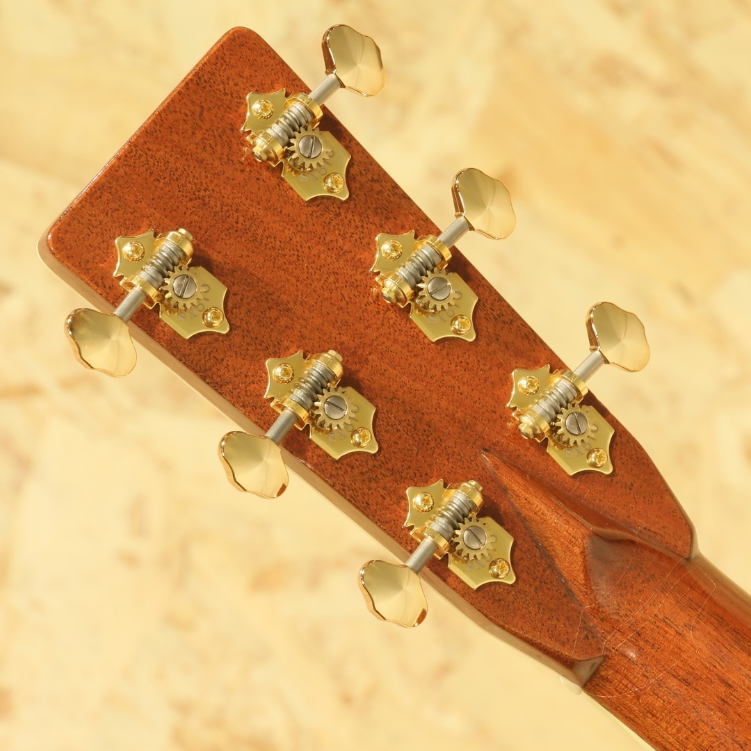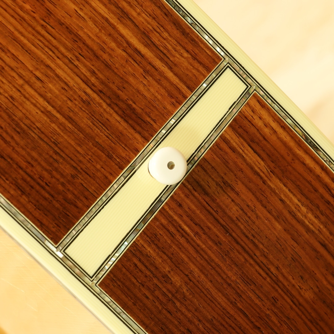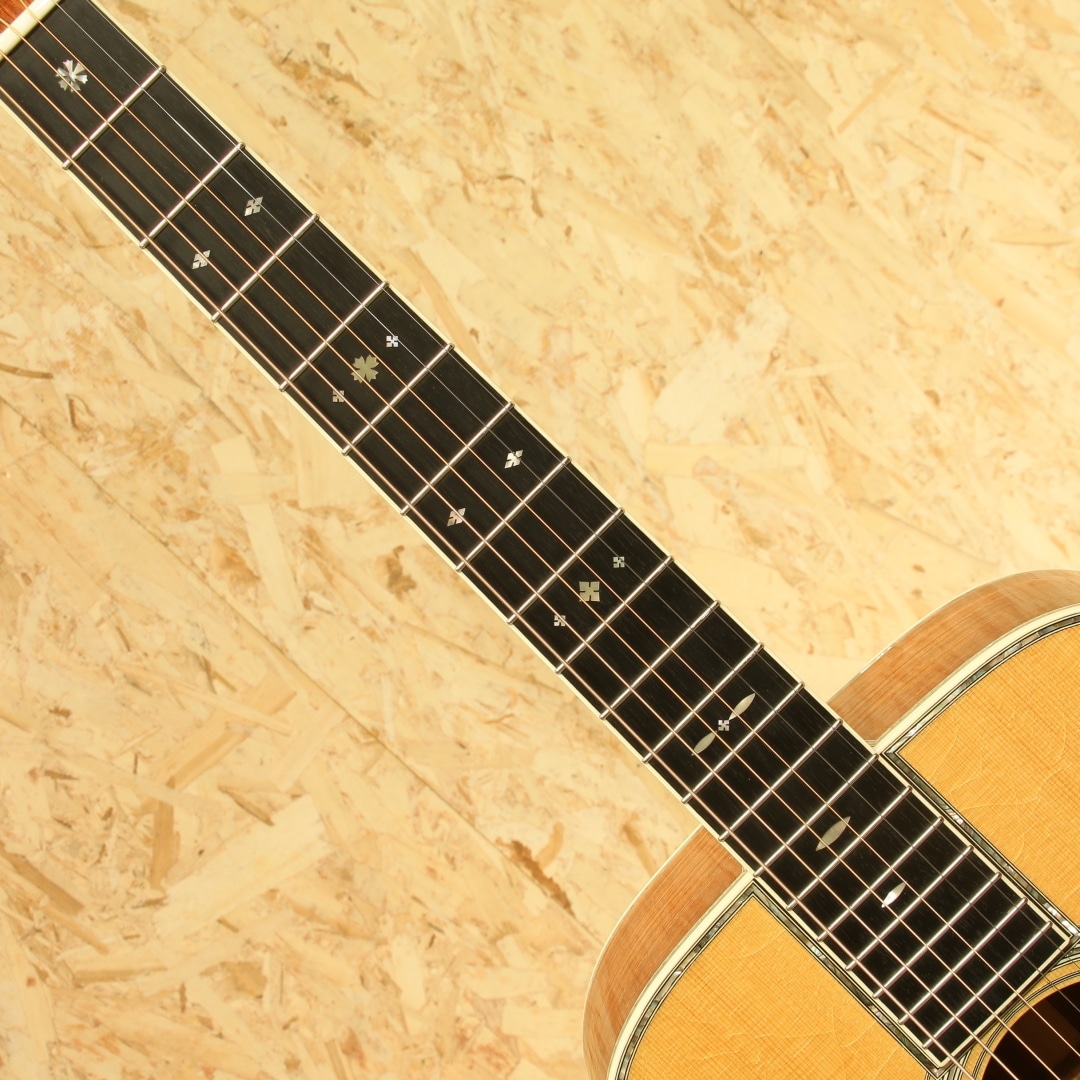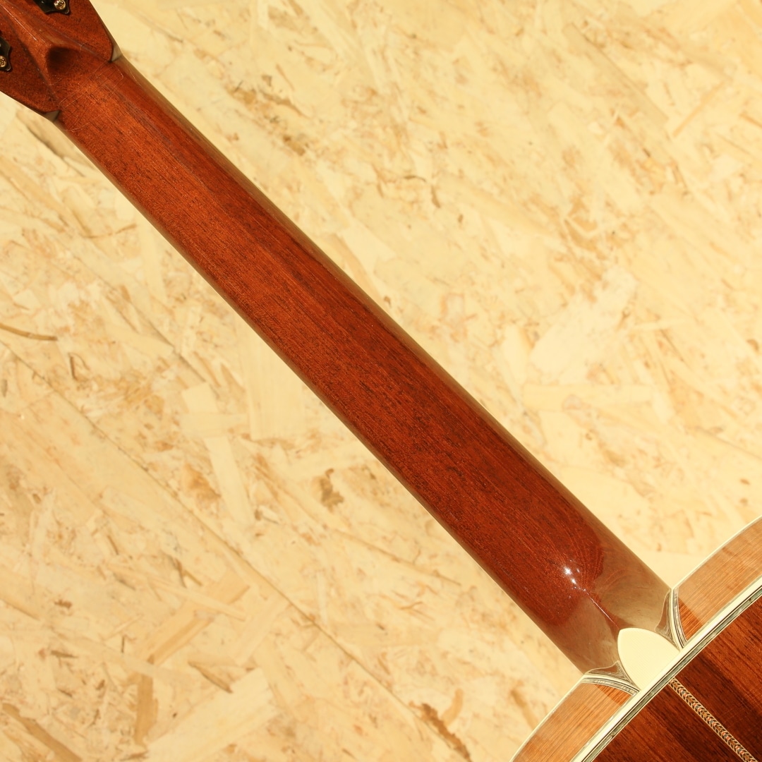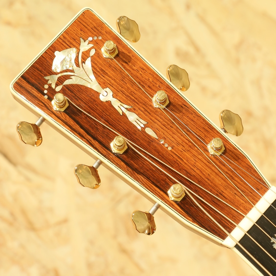 国内有数のベテランルシアー、エム・シオザキ弦楽器工房の塩﨑雅亮氏によるシーガルギター。塩﨑氏は現在世界屈指のマーティン研究家としても知られています。本器は2004年製USED品"OM-85"。最も得意とするスタイルの一つであるマーチンスタイル45の飾りを設えたゴージャスなOMモデル。トップには経年で良い色味に焼けた端正で美しいジャーマンスプルース、サイド&バックには淡い色味で重厚で比重の高い柾目杢のホンジュラスローズウッドを使用。ワンピースマホガニーネック、エボニー指板&ブリッジ、ロングサドル、ゴトー製ゴールドオープンバックペグ、スノーフレークスキャッツアイ指板インレイ、アバロンロゼッタ、トップサイドバックにあしらわれたアバロントリム、トーチインレイヘッドプレート、塗り込みのOMサイズべっ甲柄ピックガード、アイボロイドバインディング、モザイクバックストリップ、フォワードシフテッド・スキャロップド・Xブレイシング。凛としたコシの入ったサウンドで艶やかでまっすぐに減衰が少なく持続性のあるサスティン、倍音豊かで埋もれないトーン。サウンドのエッジははっきりしていながら、耳当たりはまろやか、解像度の高い音色が心地よくとても反応の良いサウンドで爪弾きでもしっかりとした音像をアウトしてくれます。ボディー箇所箇所に僅かな打痕などの小傷は見られ、オリジナルの極薄のラッカーフィニッシュにはびっしりとウェザーチェックが張り巡らされていますが、むしろオールドテイスト溢れる外観にはクールさが増しています。弦高は標準的な数値にセットアップされ、サドルマージンもかなり余裕があり今後の使用にも安心です。わずかにフレット減りも見られますが使用上問題ないレベルです。憧れのスタイル45モデル、世界にも名を馳せる実力の塩崎氏の1本。是非お手元でご体感ください。ハードケース付属。