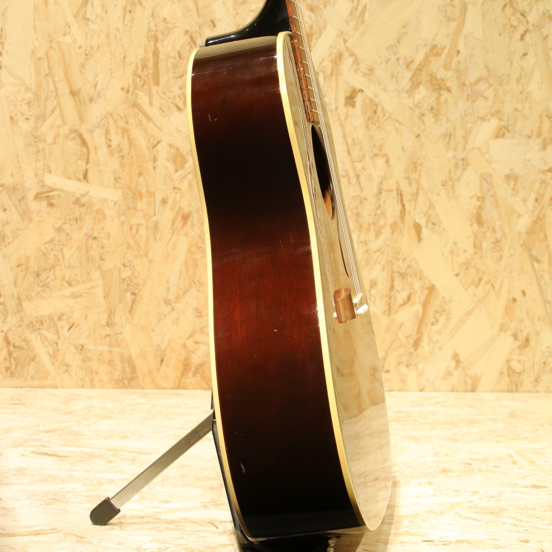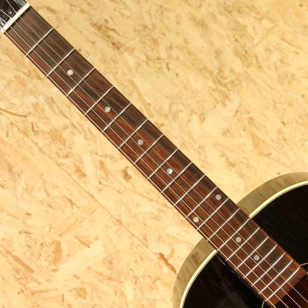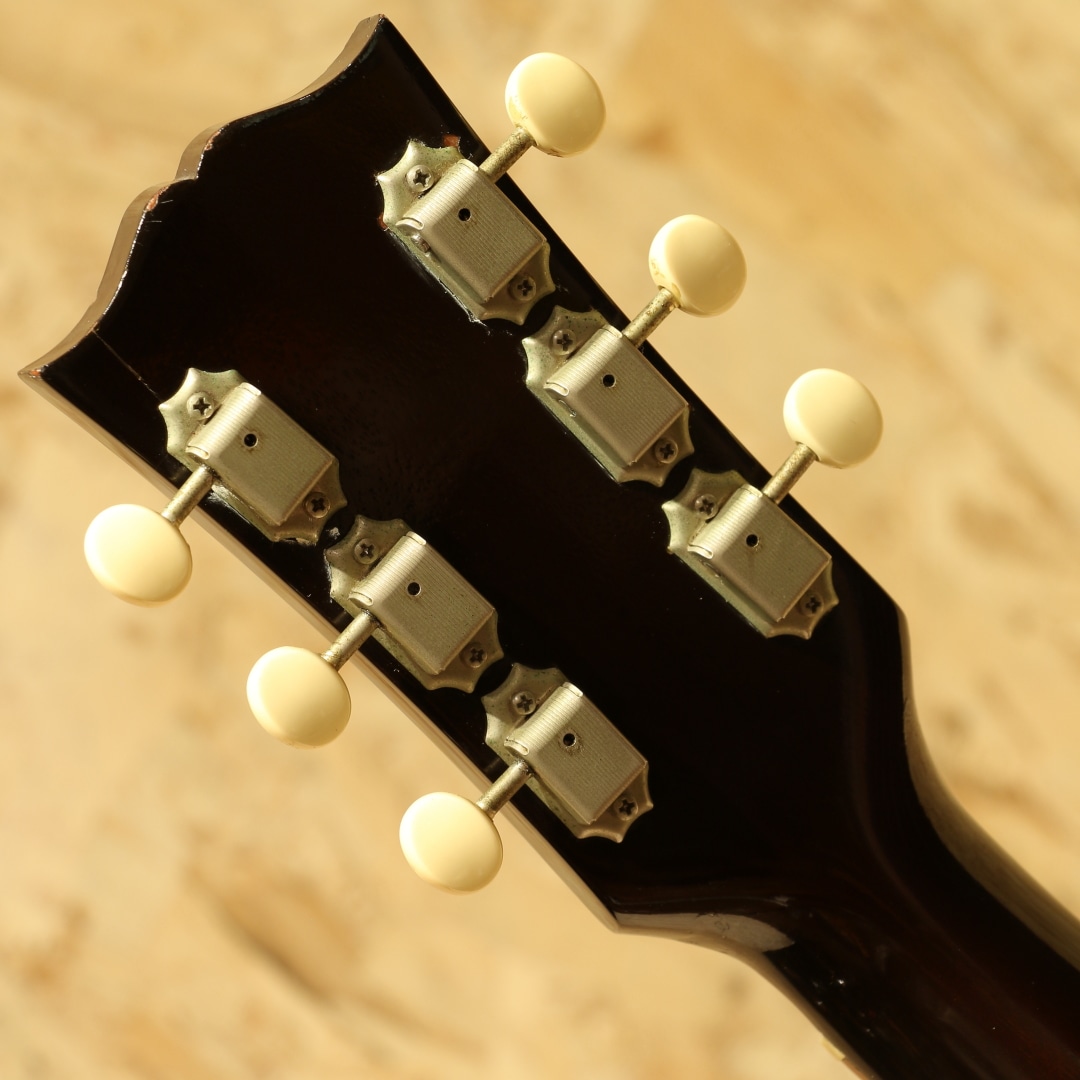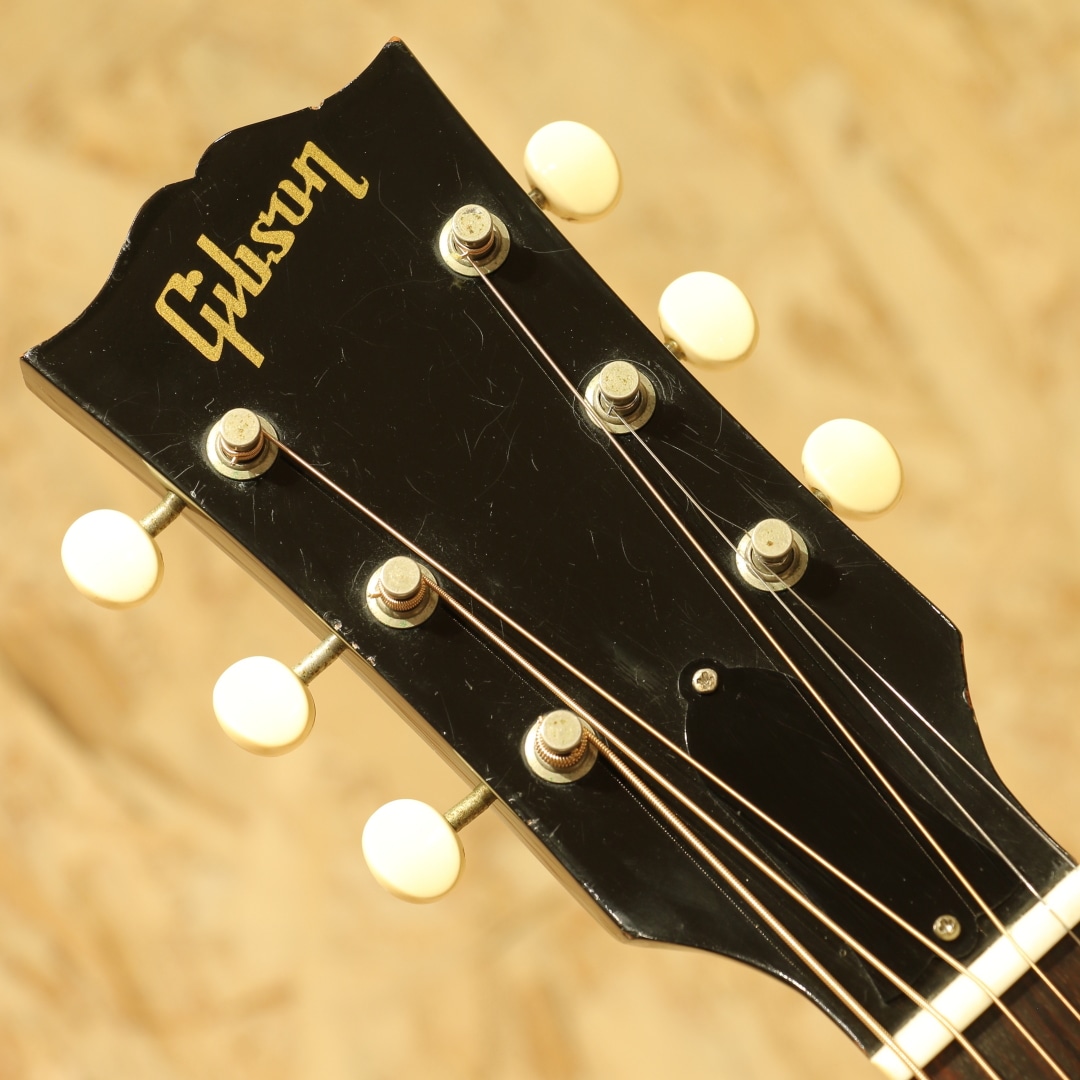 世界中のミュージシャンが愛用するギブソンフラットトップの銘器、"J-45"。発売当時からの伝統的なスタイルを踏襲しながら、時代ごとのニーズに合わせた仕様変更を繰り返し製造を続けています。本器は1963年スタイルを踏襲した"1963 J-45"1995年製USED品。シトカスプルーストップ、マホガニーサイド&バック、マホガニーネック、ローズウッド指板&ブリッジ、クルーソンタイプノーラインホワイトノブペグ、MOP指板ドット、べっ甲柄スモールガード、ビンテージサンバーストフィニッシュ。ワーキングホースの2つ名の通り、ダイナミックなストロークからフィンガープレイまで幅広く応えてくれるオールラウンドな1本。当時はノンスキャロップドXブレイシングですが、現代のニーズに合わせスキャロップされたXブレイシングとなっています。1942年の発売から80年ほどのあいだ数々のマイナーチェンジがなされましたが、基本的なスタイルは不変です。ブライトで気っ風の良いレスポンス、ドライでどこか泥臭さを感じさせる倍音、外観と違わぬ荒削りなサウンド。やはり歌モノで弾きたくなるギターです。ピックガードはラージタイプからティアドロップに交換されていますが、焼け跡等は見られず違和感のない仕上がりです。60年前期に見られる薄型のラウンドシェイプネックとなっており、馴染みやすい印象、握り込みでの演奏も容易に行えます。また、60年代製の特徴であるアジャスタブルブリッジをノーマルストレートサドル仕様で製作、ファットでボリューミーなサウンドを獲得、またADJサドルに比べサウンドレンジもやや広くミッドレンジにコシがあり厚みのあるトーンを得ます。以前にピックアップが装着されていましたが現在は取り外されており、エンドには12mm径のコンバージョンピンが付けられています。トップ面6弦側指板横、その延長線上のサウンドホール箇所に割れ修正がなされており、それに伴いタッチアップが施されております。トラスロッドカバーのネジ穴(ネック側)が拡がっていた為、埋め直し後再度適正なサイズに開けなおしされています。ヘッド根本のスタンドによる塗装焼け、経年によるウェザーチェックや打痕などしっかりと使い込まれていたのか全体的な使用感は多いですが、ネック&プレイコンディションはしっかりと整えられており約30年の歴史を物語る貫禄たっぷりの個体です。発表以来、数々の名演を支えてきた"J-45"、スタンダードとは異なるスペック、ルックスをお探しの方は是非お試しください。先述の修理跡ありの為、お買い得なプライスです!オリジナルハードケースが付属します。