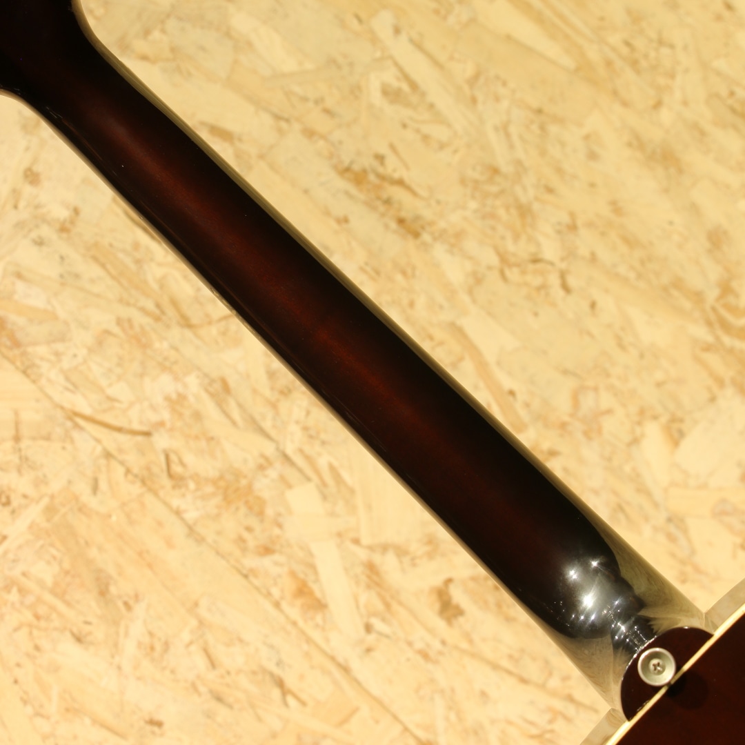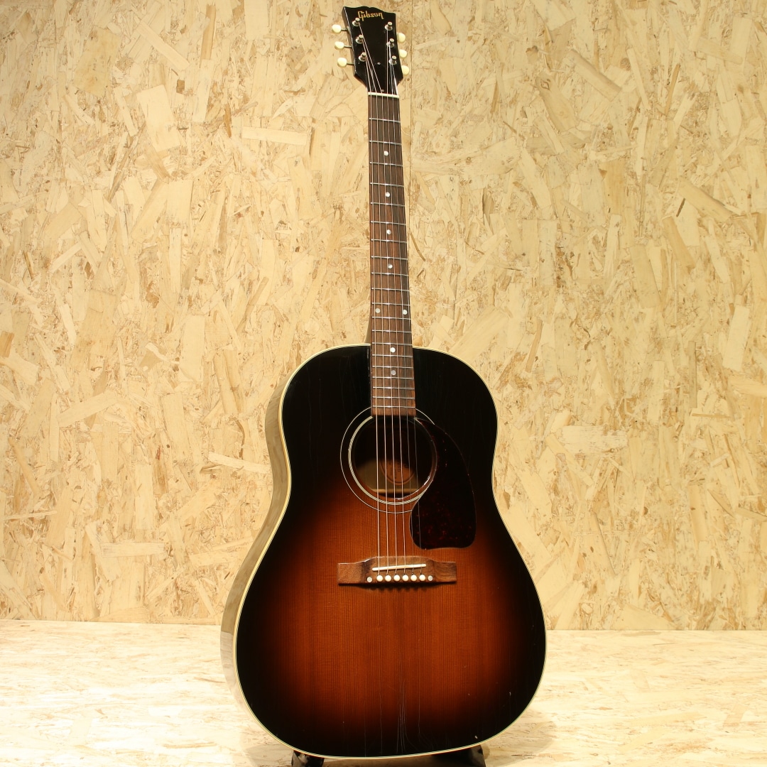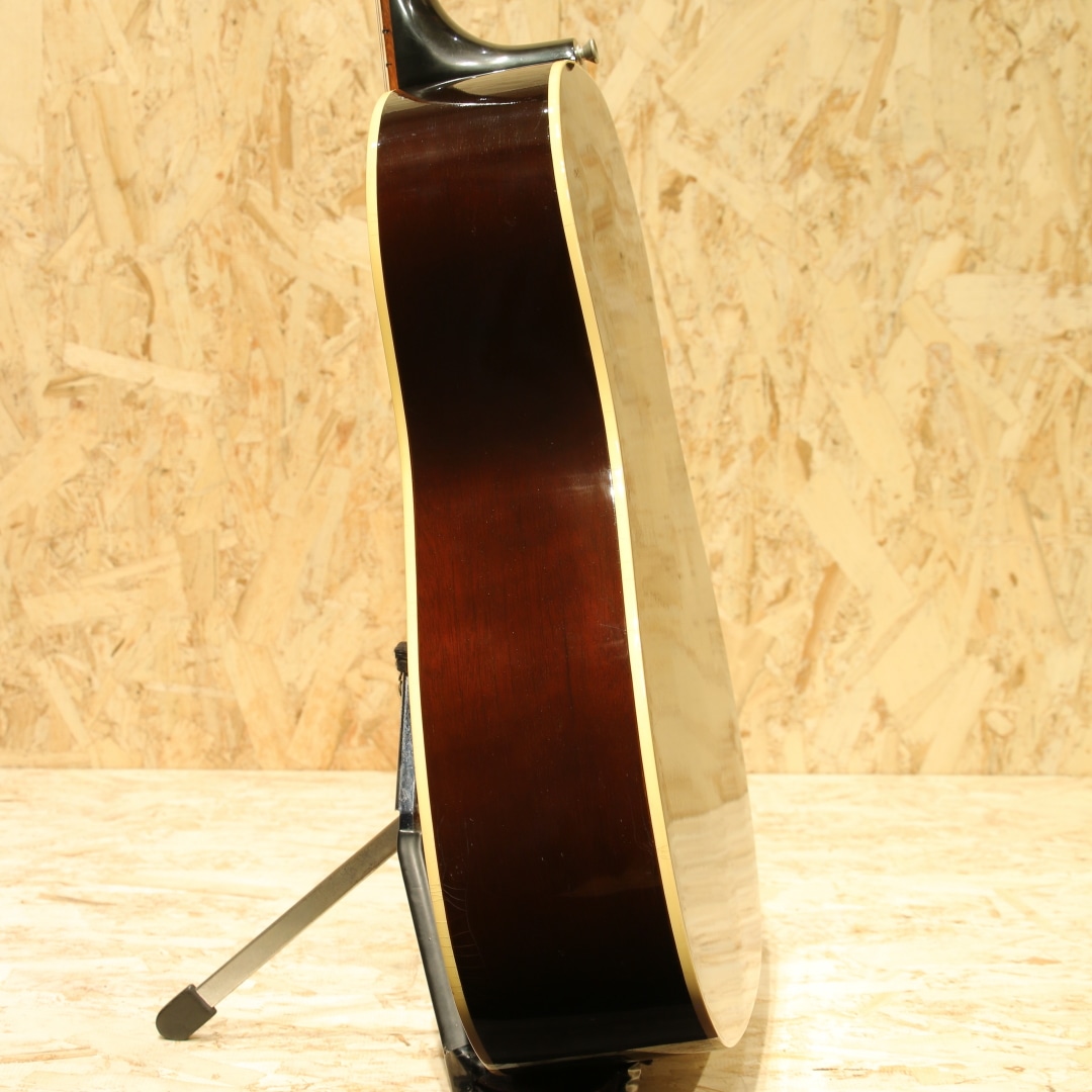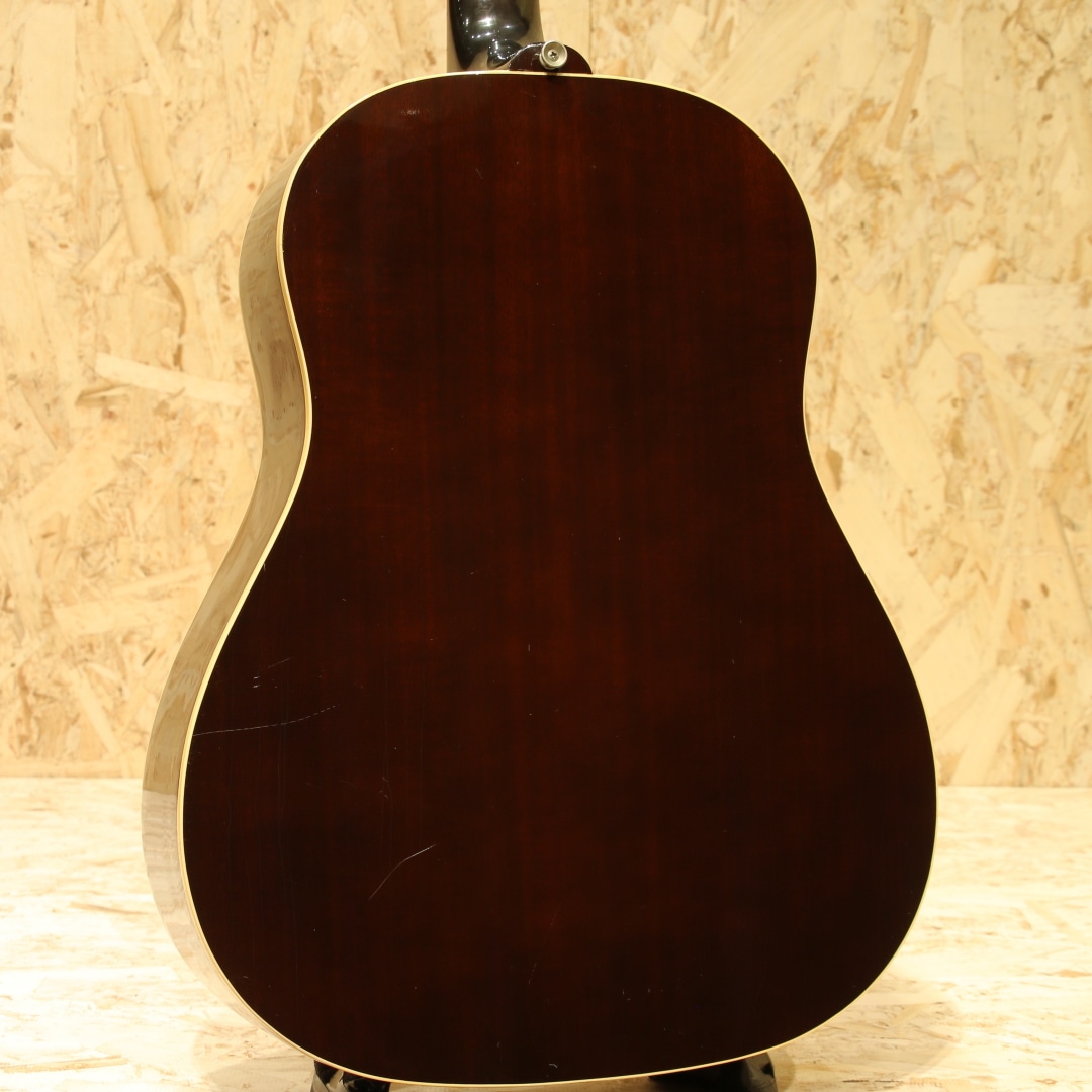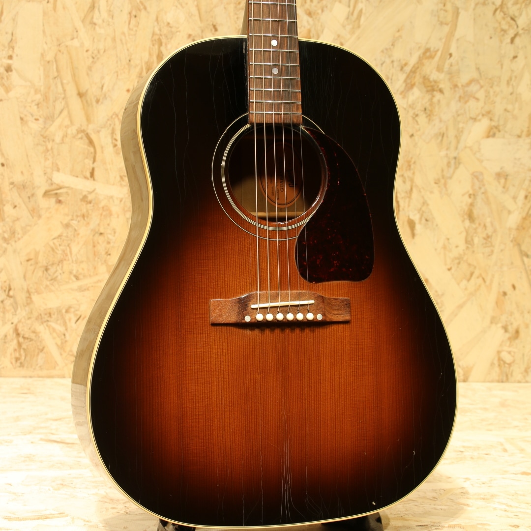 世界中のミュージシャンが愛用するギブソンフラットトップの銘器、"J-45"。発売当時からの伝統的なスタイルを踏襲しながら、時代ごとのニーズに合わせた仕様変更を繰り返し製造を続けています。本器は1963年スタイルを踏襲した"1963 J-45"1995年製USED品。シトカスプルーストップ、マホガニーサイド&バック、マホガニーネック、ローズウッド指板&ブリッジ、クルーソンタイプノーラインホワイトノブペグ、MOP指板ドット、べっ甲柄スモールガード、ビンテージサンバーストフィニッシュ。ワーキングホースの2つ名の通り、ダイナミックなストロークからフィンガープレイまで幅広く応えてくれるオールラウンドな1本。当時はノンスキャロップドXブレイシングですが、現代のニーズに合わせスキャロップされたXブレイシングとなっています。1942年の発売から80年ほどのあいだ数々のマイナーチェンジがなされましたが、基本的なスタイルは不変です。ブライトで気っ風の良いレスポンス、ドライでどこか泥臭さを感じさせる倍音、外観と違わぬ荒削りなサウンド。やはり歌モノで弾きたくなるギターです。ピックガードはラージタイプからティアドロップに交換されていますが、焼け跡等は見られず違和感のない仕上がりです。60年前期に見られる薄型のラウンドシェイプネックとなっており、馴染みやすい印象、握り込みでの演奏も容易に行えます。また、60年代製の特徴であるアジャスタブルブリッジをノーマルストレートサドル仕様で製作、ファットでボリューミーなサウンドを獲得、またADJサドルに比べサウンドレンジもやや広くミッドレンジにコシがあり厚みのあるトーンを得ます。以前にピックアップが装着されていましたが現在は取り外されており、エンドには12mm径のコンバージョンピンが付けられています。トップ面6弦側指板横、その延長線上のサウンドホール箇所に割れ修正がなされており、それに伴いタッチアップが施されております。トラスロッドカバーのネジ穴(ネック側)が拡がっていた為、埋め直し後再度適正なサイズに開けなおしされています。ヘッド根本のスタンドによる塗装焼け、経年によるウェザーチェックや打痕などしっかりと使い込まれていたのか全体的な使用感は多いですが、ネック&プレイコンディションはしっかりと整えられており約30年の歴史を物語る貫禄たっぷりの個体です。発表以来、数々の名演を支えてきた"J-45"、スタンダードとは異なるスペック、ルックスをお探しの方は是非お試しください。先述の修理跡ありの為、お買い得なプライスです!オリジナルハードケースが付属します。