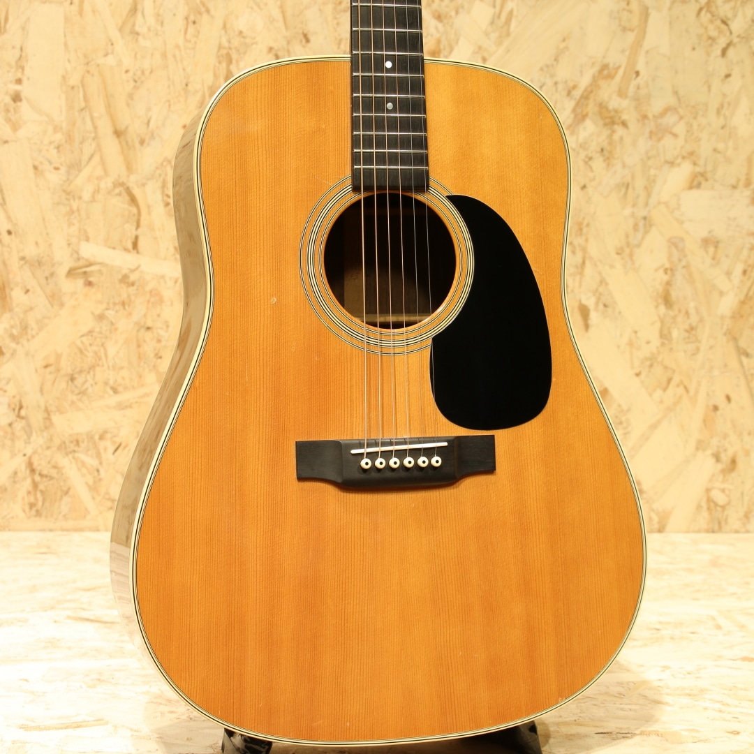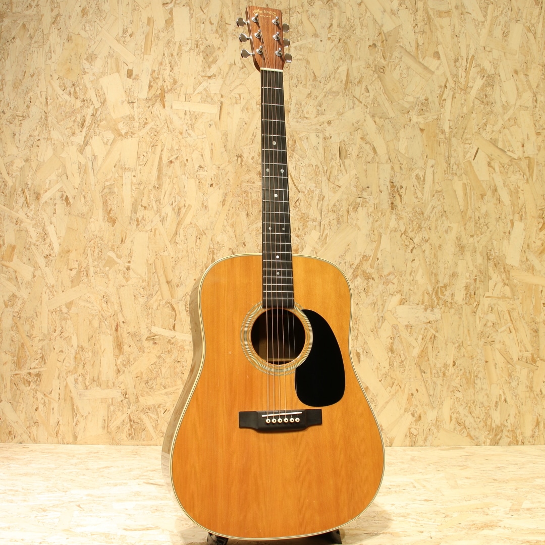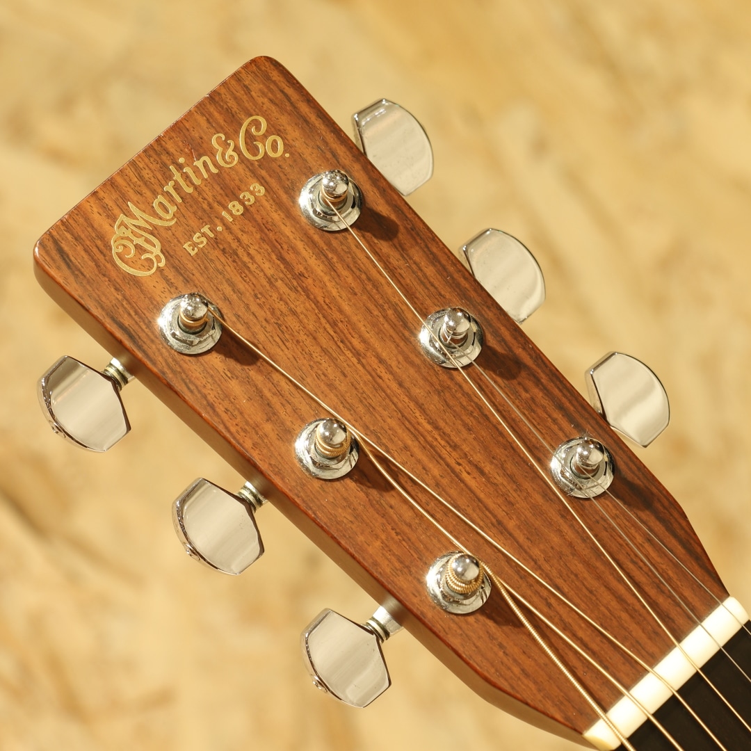 マーチンギターの中で最も有名なモデルといえば、この"D-28"。現在同様の14fジョイントのドレッドモデルとして1934年に誕生してから、時を超え今もなお愛されるワールドスタンダードモデルです。本器は2001年製USED品。シトカスプルーストップ、ローズウッドサイド&バック、エボニー指板&ブリッジ、グローバーロトマチックペグ、MOP指板ドット、ブラックピックガード、チェッカーフラッグバックストリップ、スタンダードノンスキャロップドXブレイシング。ネックヒールバックにはストラップピンが装着されています。D-28は2017年に大きく仕様が変わり、よりオールドテイストを取り入れた姿へと変化しました。2025年にも細やかな個所が変更されゴールデンエラ期に近づいた特徴を与えられています。本器はそれらの変更が入る前の旧仕様。ナット幅は現行品と異なり42.9mm、ブレイシングはノンスキャロップのスタンダードX、ペグはグローバーのロトマチックタイプ。現行品のナット幅が広く握り込みにくいと感じられる方には一度体感して欲しいネック、親指を使った押弦にも対応しやすいグリップ。この仕様を探している方が一定数おられることにも納得です。そしてフォワードシフトではなくスタンダードXの為、ブリッジ付近の強度が高くなりより粒立ちの揃ったバランスの良いサウンド。ノンスキャロップでやや太いサウンド、音の輪郭も出しやすく制御しやすい辺り細かいニュアンスを表現できる可能性をもっています。ペグ自体も重量がある為に重たい響きとスーッと伸びるサスティーンを生み出しやすく、音を切る、伸ばすの加減も演奏者次第。自分が思い描く演奏へ応えてくれるであろう世界のスタンダードモデル。プレイスタイルも特段選ばず、ストロークでのパワフルなサウンド、フィンガーでの繊細な響きを堪能できる1本です。後付けにてL.R Baggs i-Beam Activeを搭載。マイクで拾ったようなナチュラルなエア感のある響き、ピックアップ自体も軽量の為生音への影響も最小限。出力も充分稼げるアクティブ仕様の為、扱いやすさも良し。優秀なシステムと言えるピックアップです。ボディトップ面1弦側ショルダー箇所やサウンドホール6弦側横、ボディトップ下部の当てキズ、ボディバック面の細やかなバックルキズ、ボディサイド6弦側ショルダーとネックヒールに当てキズ等の使用感こそ見られますが、年式を考えると比較的キレイな状態をキープされている個体。ネックの状態は良いままに保たれ、サドルの残り代も問題なしと演奏性良好な1本です。現行品のナット幅が合わなかった方には是非一度お試し頂きたい旧仕様品。ワールドスタンダードたりえる理由を是非ご体感下さいませ。