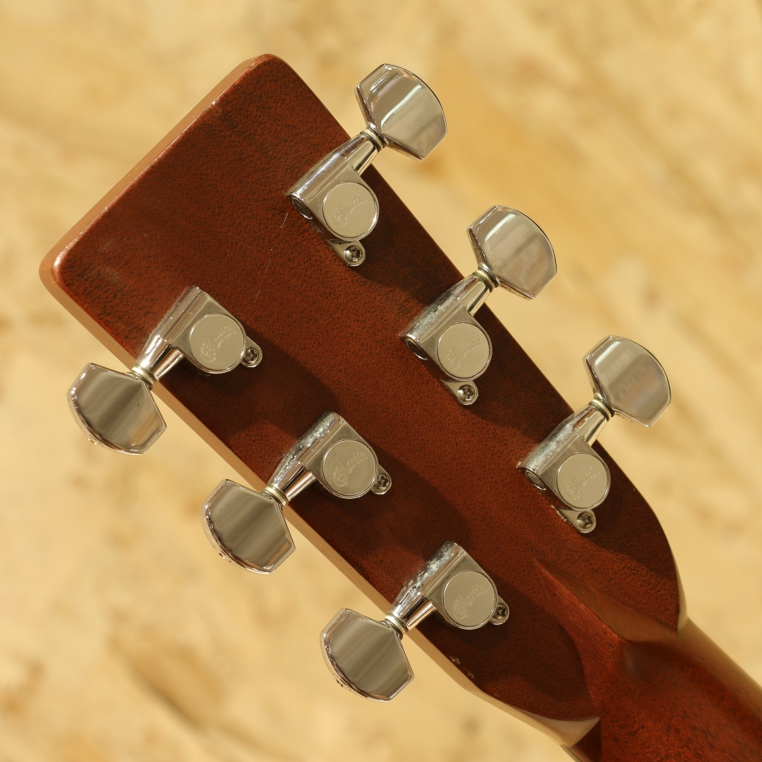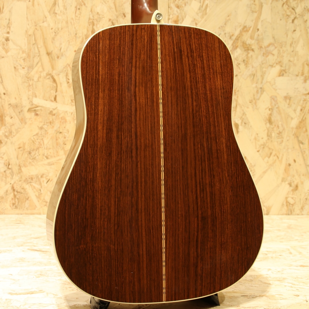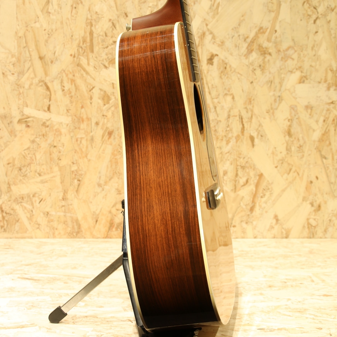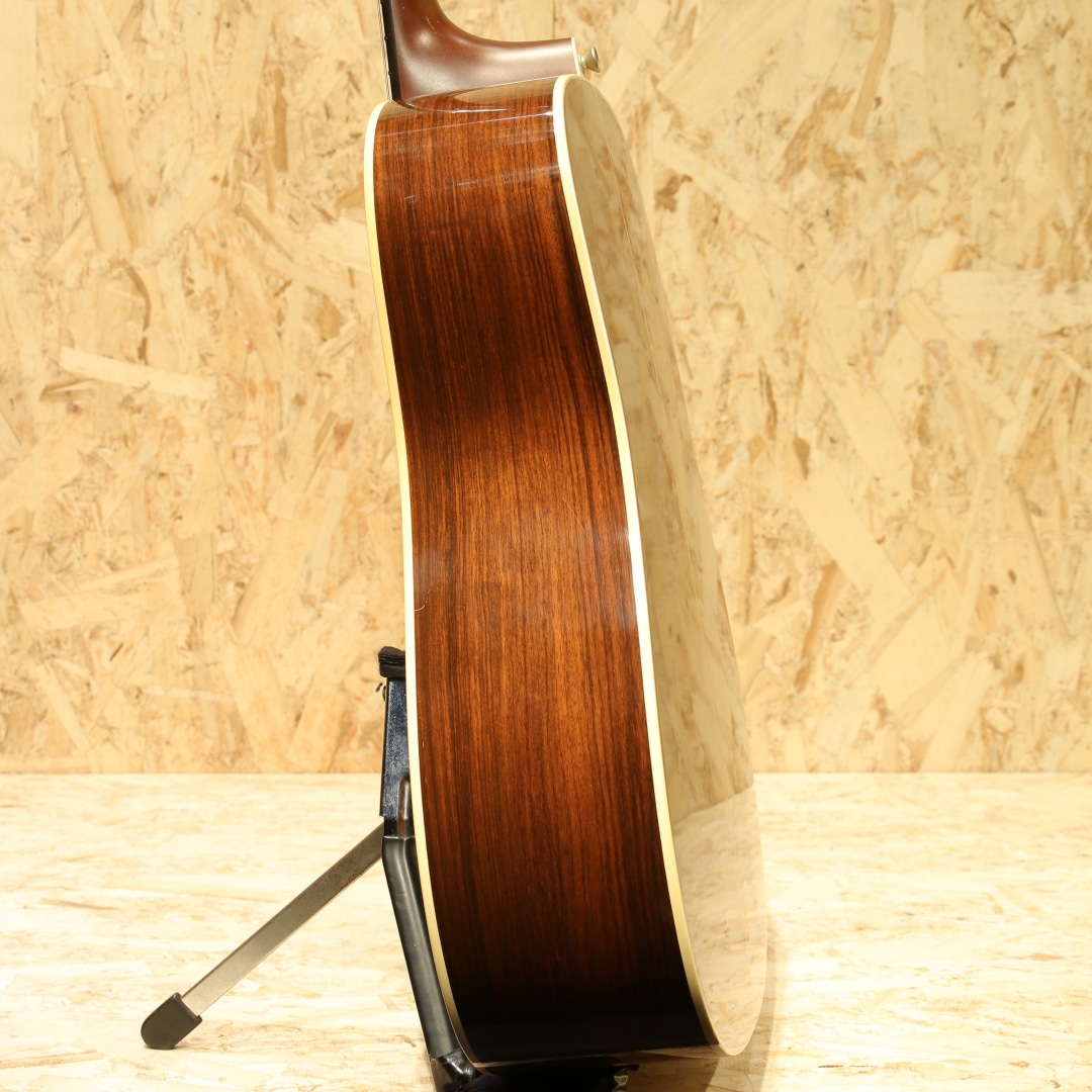 マーチンギターの中で最も有名なモデルといえば、この"D-28"。現在同様の14fジョイントのドレッドモデルとして1934年に誕生してから、時を超え今もなお愛されるワールドスタンダードモデルです。本器は2001年製USED品。シトカスプルーストップ、ローズウッドサイド&バック、エボニー指板&ブリッジ、グローバーロトマチックペグ、MOP指板ドット、ブラックピックガード、チェッカーフラッグバックストリップ、スタンダードノンスキャロップドXブレイシング。ネックヒールバックにはストラップピンが装着されています。D-28は2017年に大きく仕様が変わり、よりオールドテイストを取り入れた姿へと変化しました。2025年にも細やかな個所が変更されゴールデンエラ期に近づいた特徴を与えられています。本器はそれらの変更が入る前の旧仕様。ナット幅は現行品と異なり42.9mm、ブレイシングはノンスキャロップのスタンダードX、ペグはグローバーのロトマチックタイプ。現行品のナット幅が広く握り込みにくいと感じられる方には一度体感して欲しいネック、親指を使った押弦にも対応しやすいグリップ。この仕様を探している方が一定数おられることにも納得です。そしてフォワードシフトではなくスタンダードXの為、ブリッジ付近の強度が高くなりより粒立ちの揃ったバランスの良いサウンド。ノンスキャロップでやや太いサウンド、音の輪郭も出しやすく制御しやすい辺り細かいニュアンスを表現できる可能性をもっています。ペグ自体も重量がある為に重たい響きとスーッと伸びるサスティーンを生み出しやすく、音を切る、伸ばすの加減も演奏者次第。自分が思い描く演奏へ応えてくれるであろう世界のスタンダードモデル。プレイスタイルも特段選ばず、ストロークでのパワフルなサウンド、フィンガーでの繊細な響きを堪能できる1本です。後付けにてL.R Baggs i-Beam Activeを搭載。マイクで拾ったようなナチュラルなエア感のある響き、ピックアップ自体も軽量の為生音への影響も最小限。出力も充分稼げるアクティブ仕様の為、扱いやすさも良し。優秀なシステムと言えるピックアップです。ボディトップ面1弦側ショルダー箇所やサウンドホール6弦側横、ボディトップ下部の当てキズ、ボディバック面の細やかなバックルキズ、ボディサイド6弦側ショルダーとネックヒールに当てキズ等の使用感こそ見られますが、年式を考えると比較的キレイな状態をキープされている個体。ネックの状態は良いままに保たれ、サドルの残り代も問題なしと演奏性良好な1本です。現行品のナット幅が合わなかった方には是非一度お試し頂きたい旧仕様品。ワールドスタンダードたりえる理由を是非ご体感下さいませ。