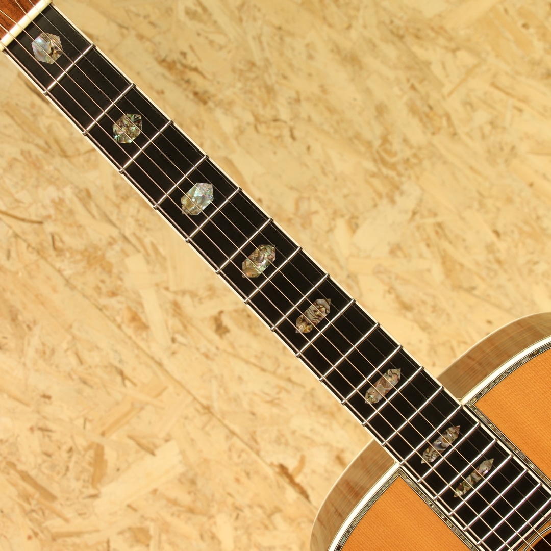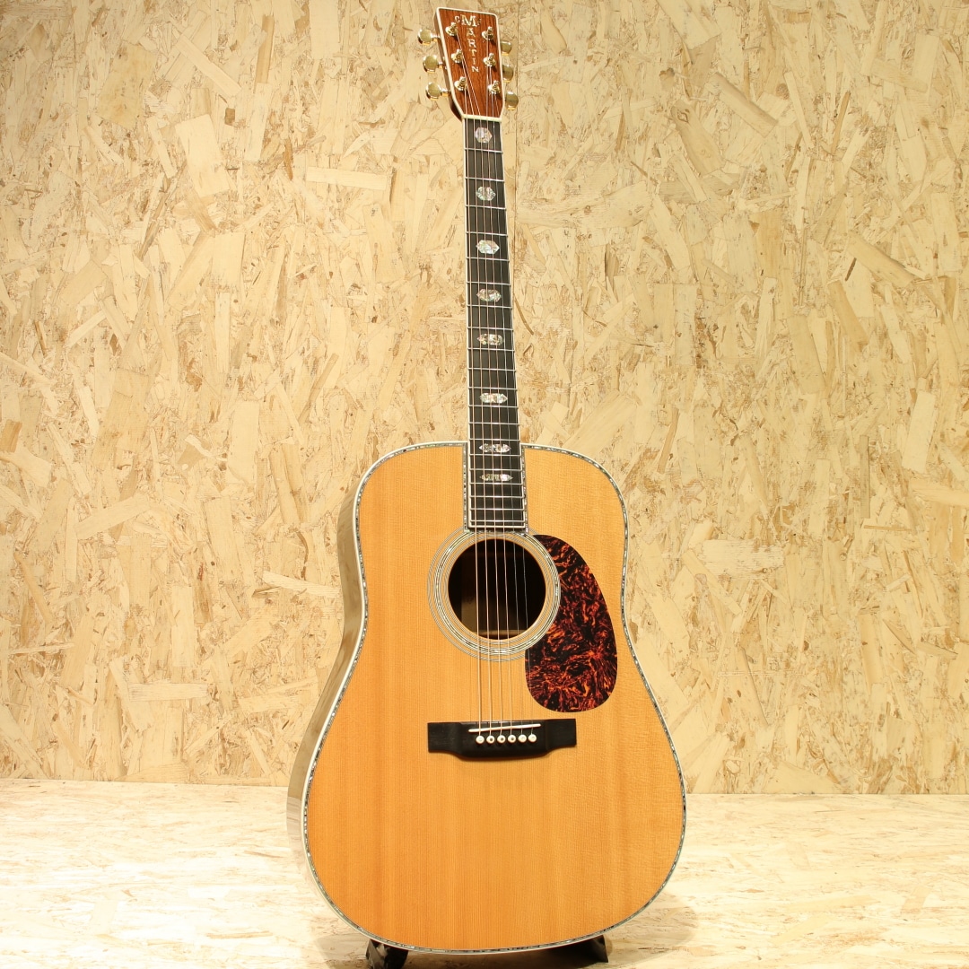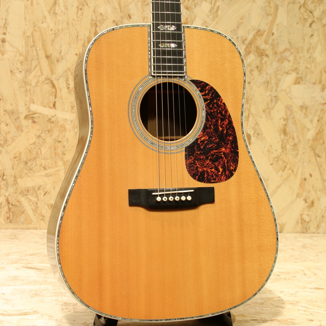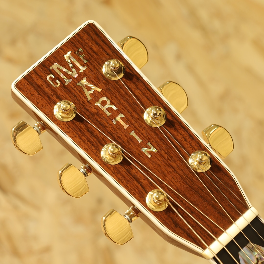 マーチン"D-45"はカントリーシンガー"Gene Autry(ジーン・オートリー)"からのからの特別オーダーから生まれたマーチンギターの最高級機種。1933年から1942年の間に91本が製造された後、1度その幕を閉じます。その後、マーチンギターの広報・研究家として活躍したマイク・ロングワースによって1968年に再生産が実現されました。マーチンスタイル45はこの型番に見合う材料を供給できない場合には生産されません。常にこの上ないクオリティを誇る最高のシリーズとなります。本器は2005年製の1本。最高級シトカスプルーストップ、最高級イーストインディアンローズウッドサイド&バック、マホガニーネック、アジャスタブル(AJ)ネックロッド、エボニー指板&ブリッジ、ゴールドゴトーロトマチックペグ、バーチカルヘッドロゴ、べっ甲柄ピックガード、アバロンヘキサゴン指板インレイ、アバロンロゼッタ&トリム、スキャロップドXブレイシング。華やかな外観ときらびやかなサウンド、いつの時代も変わらない憧れの最高級機種。濃密で奥深い倍音、きらびやかで芯のあるトーン、広がりのあるワイドレンジな音色。"45"を冠するギターのみに許されたサウンドです。色味は綺麗な飴色に焼け、程よく弾き熟れ深みと広がりのある豊満なサウンドになっていますが、ネック周りもしっかりと手入れ鼻通りの良いスッキリとしたサウンドの中に包容力があります。ネックローポジション6弦側のわずかなバインディング剥がれ修正、12F指板とネックの継ぎ目のわずかな塗装の剥がれ、ボディー全体に経年による塗装の引けによる導管のつぶが見られますが、とても保管のよいコンディションでキープされまばらに見られる極わずかな打痕や薄く見られるワインダーの筋が見られる程度。素晴らしい状態です。ネック・ボディ含めプレイコンディションは大変良好。弾きやすいアクションでサドルの高さも十分で今後の調整も安心です。憧れの45、ながめて愛でて良し、長年の気持ちを込めてガシガシ弾いても良しの1本。オリジナルハードケース付属