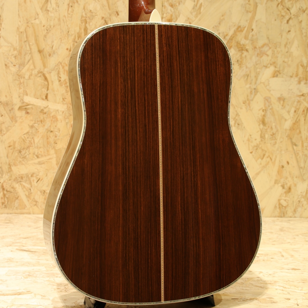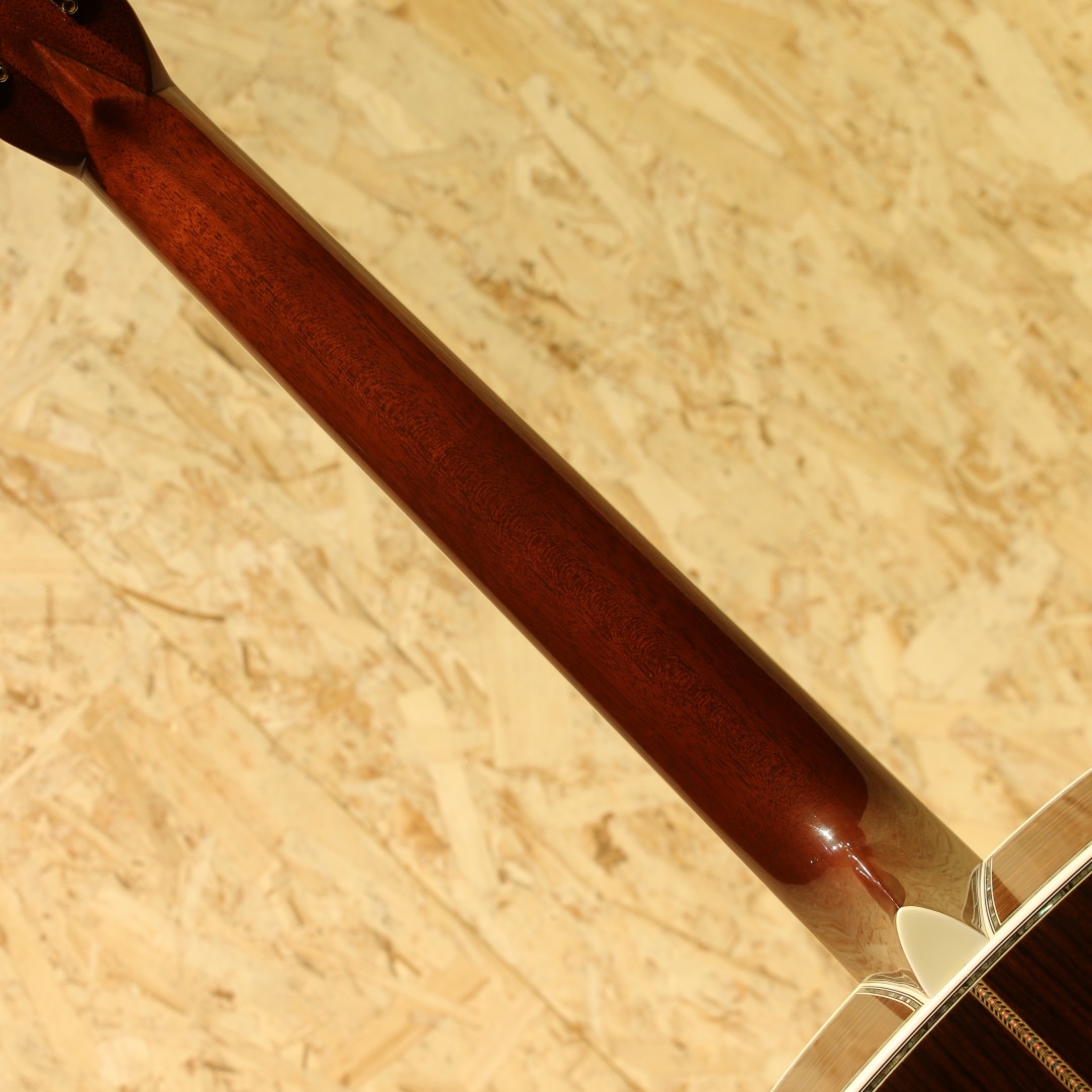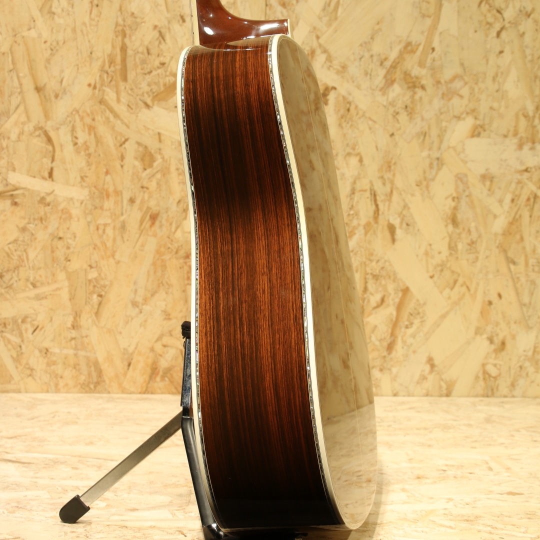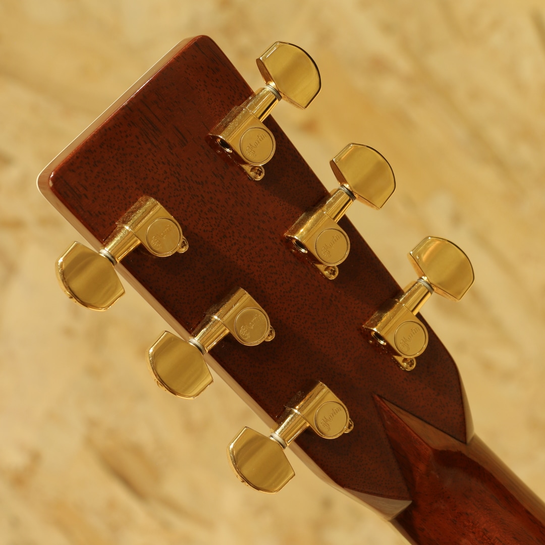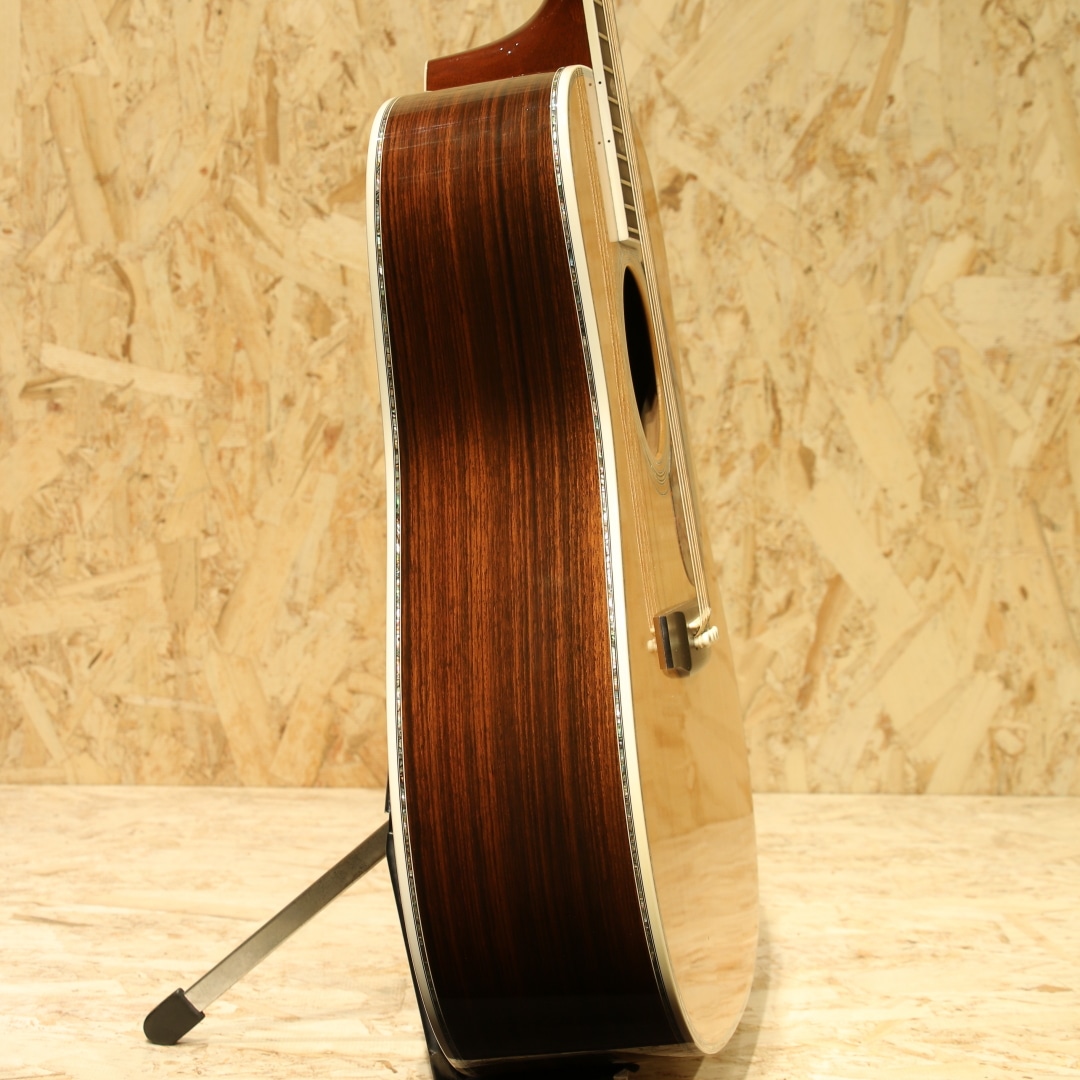 マーチン"D-45"はカントリーシンガー"Gene Autry(ジーン・オートリー)"からのからの特別オーダーから生まれたマーチンギターの最高級機種。1933年から1942年の間に91本が製造された後、1度その幕を閉じます。その後、マーチンギターの広報・研究家として活躍したマイク・ロングワースによって1968年に再生産が実現されました。マーチンスタイル45はこの型番に見合う材料を供給できない場合には生産されません。常にこの上ないクオリティを誇る最高のシリーズとなります。本器は2005年製の1本。最高級シトカスプルーストップ、最高級イーストインディアンローズウッドサイド&バック、マホガニーネック、アジャスタブル(AJ)ネックロッド、エボニー指板&ブリッジ、ゴールドゴトーロトマチックペグ、バーチカルヘッドロゴ、べっ甲柄ピックガード、アバロンヘキサゴン指板インレイ、アバロンロゼッタ&トリム、スキャロップドXブレイシング。華やかな外観ときらびやかなサウンド、いつの時代も変わらない憧れの最高級機種。濃密で奥深い倍音、きらびやかで芯のあるトーン、広がりのあるワイドレンジな音色。"45"を冠するギターのみに許されたサウンドです。色味は綺麗な飴色に焼け、程よく弾き熟れ深みと広がりのある豊満なサウンドになっていますが、ネック周りもしっかりと手入れ鼻通りの良いスッキリとしたサウンドの中に包容力があります。ネックローポジション6弦側のわずかなバインディング剥がれ修正、12F指板とネックの継ぎ目のわずかな塗装の剥がれ、ボディー全体に経年による塗装の引けによる導管のつぶが見られますが、とても保管のよいコンディションでキープされまばらに見られる極わずかな打痕や薄く見られるワインダーの筋が見られる程度。素晴らしい状態です。ネック・ボディ含めプレイコンディションは大変良好。弾きやすいアクションでサドルの高さも十分で今後の調整も安心です。憧れの45、ながめて愛でて良し、長年の気持ちを込めてガシガシ弾いても良しの1本。オリジナルハードケース付属