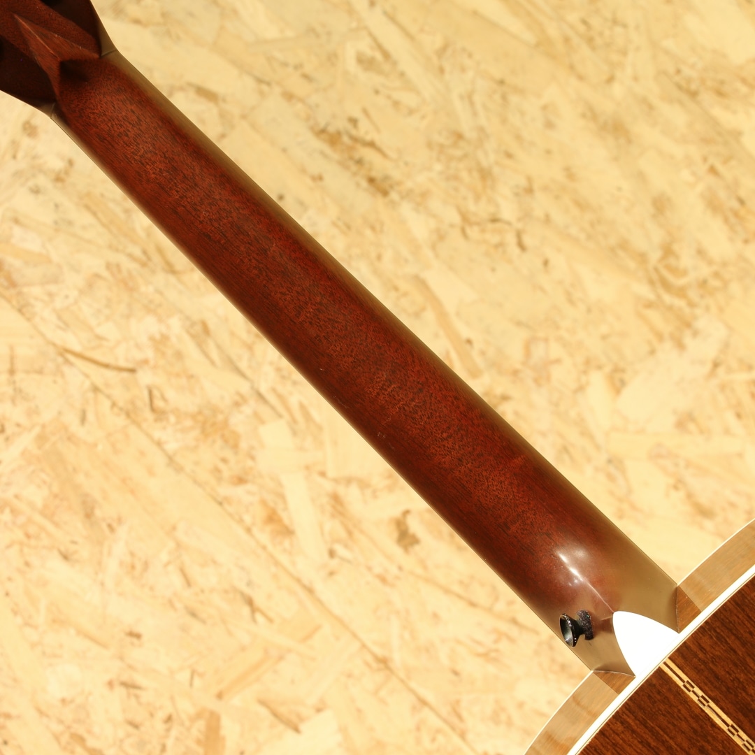 今やワールドスタンダードとなっている"D-28"と並びマーチンを代表するもうひとつの顔的モデル、トリプルオーサイズのロングセラーモデル"OOO-28"。本器は2005年製USED品。シトカスプルーストップ、ローズウッドサイド&バック、エボニー指板&ブリッジ、シャーラーロトマチックペグ、MOP指板ドット、ブラックピックガード、チェッカーフラッグバックストリップ、ノンスキャロップドXブレイシング。ネックヒールサイドにはストラップピンが装着されています。OOO-28は2018年に大きく仕様が変わり、よりオールドテイストを取り入れた姿へと変化しました。2025年にも細やかな個所が変更されゴールデンエラ期に近づいた特徴を与えられています。本器はそれらの変更が入る前の旧仕様。ナット幅は現行品と異なり42.9mm、ブレイシングはノンスキャロップ、ペグはグローバーのロトマチックタイプ。現行品のナット幅が広く握り込みにくいと感じられる方には一度体感して欲しいネック、親指を使った押弦にも対応しやすいグリップ。この仕様を探している方が一定数おられることにも納得です。そしてノンスキャロップブレイシングの為、トップ面の強度が高くなりより粒立ちの揃ったバランスの良いサウンド。そしてやや太いサウンド、音の輪郭も出しやすく制御しやすい辺り細かいニュアンスを表現できる可能性をもっています。ペグ自体も重量がある為に重たい響きとスーッと伸びるサスティーンを生み出しやすく、音を切る、伸ばすの加減も演奏者次第。自分が思い描く演奏へ応えてくれるであろう世界のスタンダードモデル。プレイスタイルも特段選ばず、ストロークでのパワフルなサウンド、フィンガーでの繊細な響きを堪能できる1本です。過去にピックアップを搭載されていたのか、エンドピンの箇所はジャックサイズに拡張されており現在では同径のピンを装着されています。またネックヒールキャップも交換されており、若干白味が強い色合いとなっております。マーチンではよく見られるバインディング修正の跡こそ見られるものの、前述部分を除けば当てキズも少なく若干の線キズが見られる程度とキレイな状態をキープされている個体。ネック周りの演奏性も整えられており、その取り回しの良さを存部に体感できる1本です。マーチンを代表するモデルの1つ、もう一つのワールドスタンダードとも言える28です。現行品のナット幅が合わなかった方には是非一度お試し頂きたい1本。お探しだった方はお早めに。